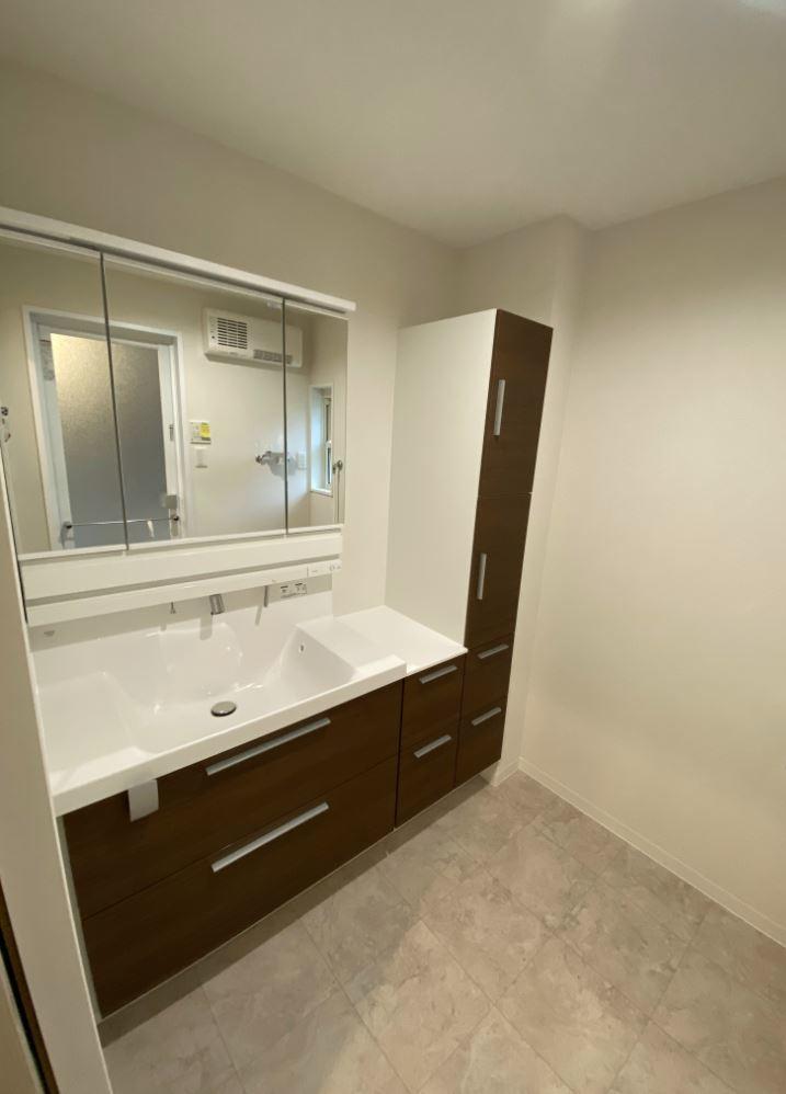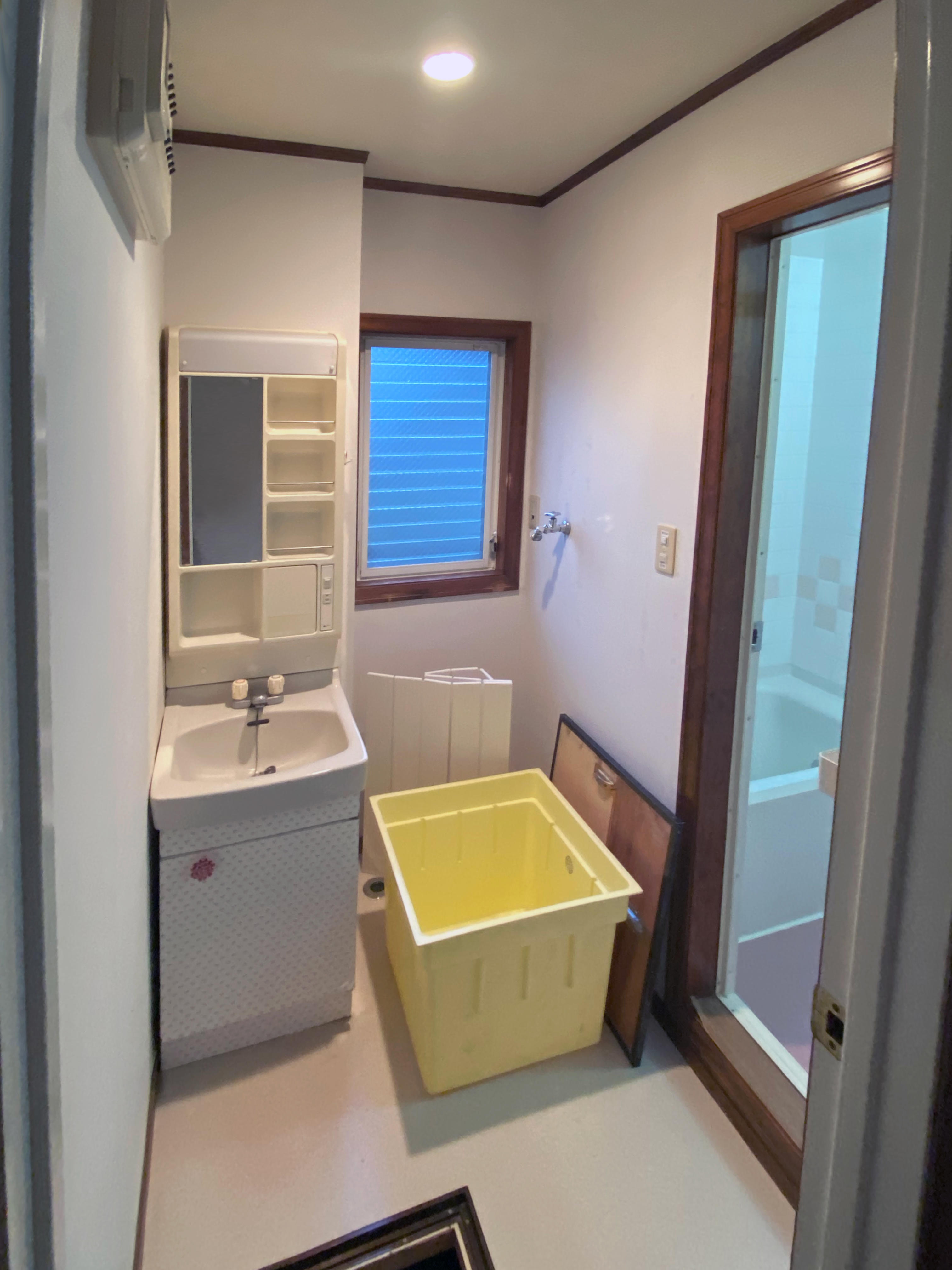 以前は2階からの給排水が洗面室へせり出していたため、洗面化粧台は間口50センチの小型のものが設置されていました。