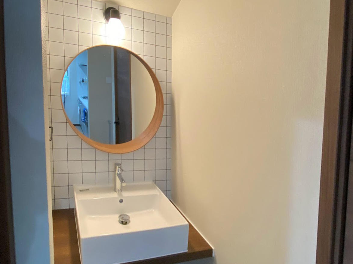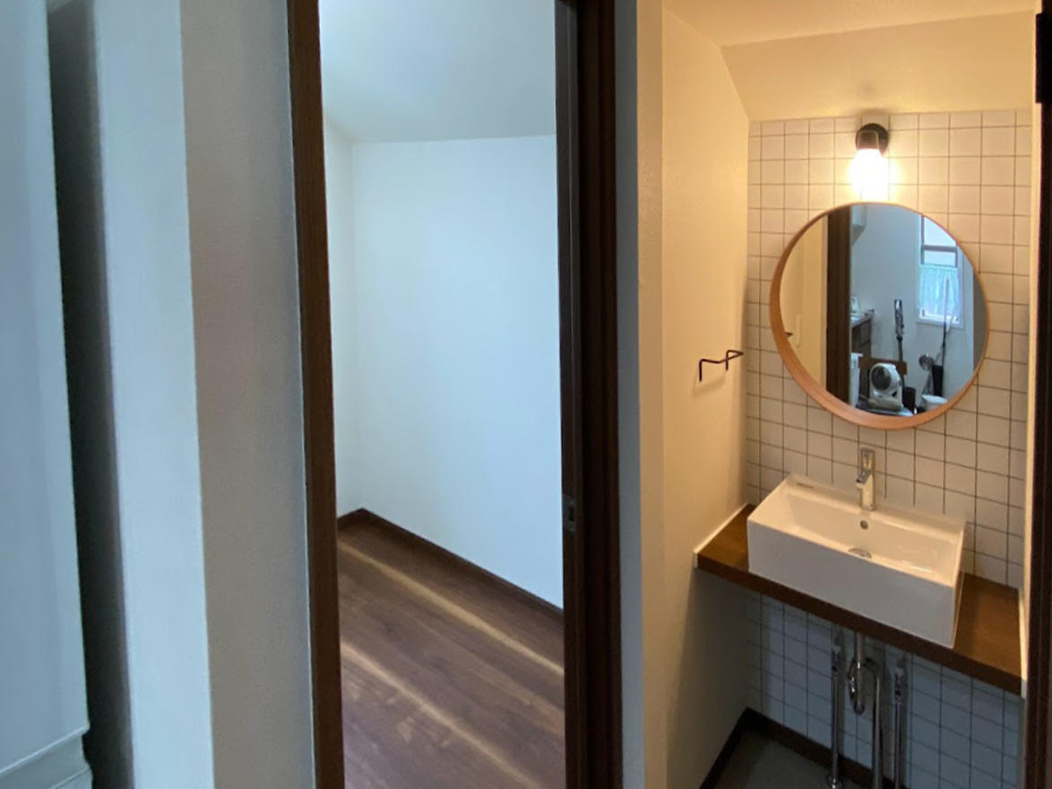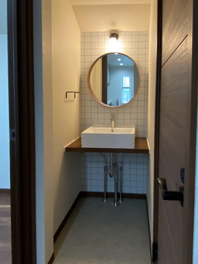 パントリースペースの壁を移動して洗面台を設置するスペースを確保、トイレの隣で階段からも近く、使い勝手のよいセカンド洗面となりました。