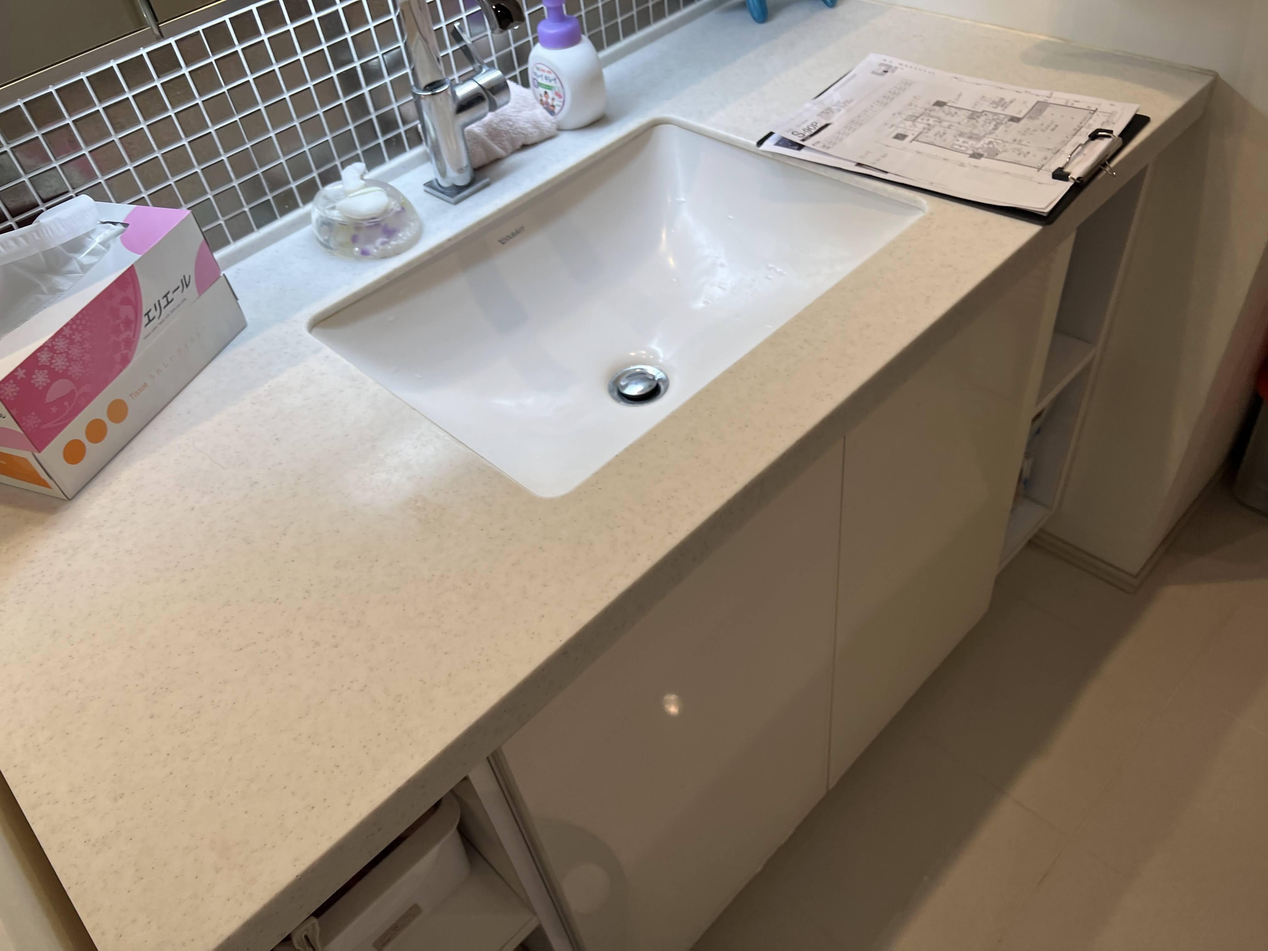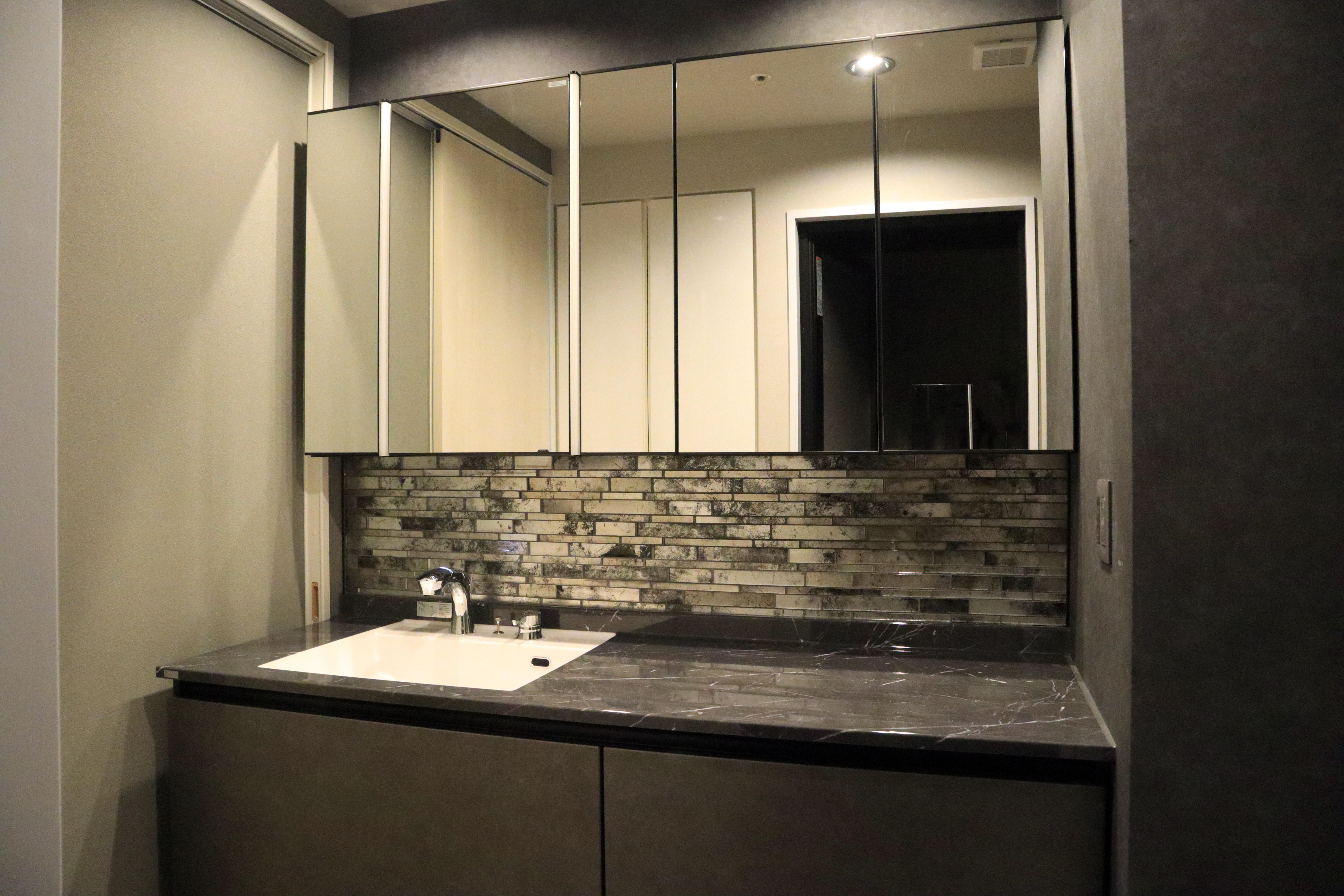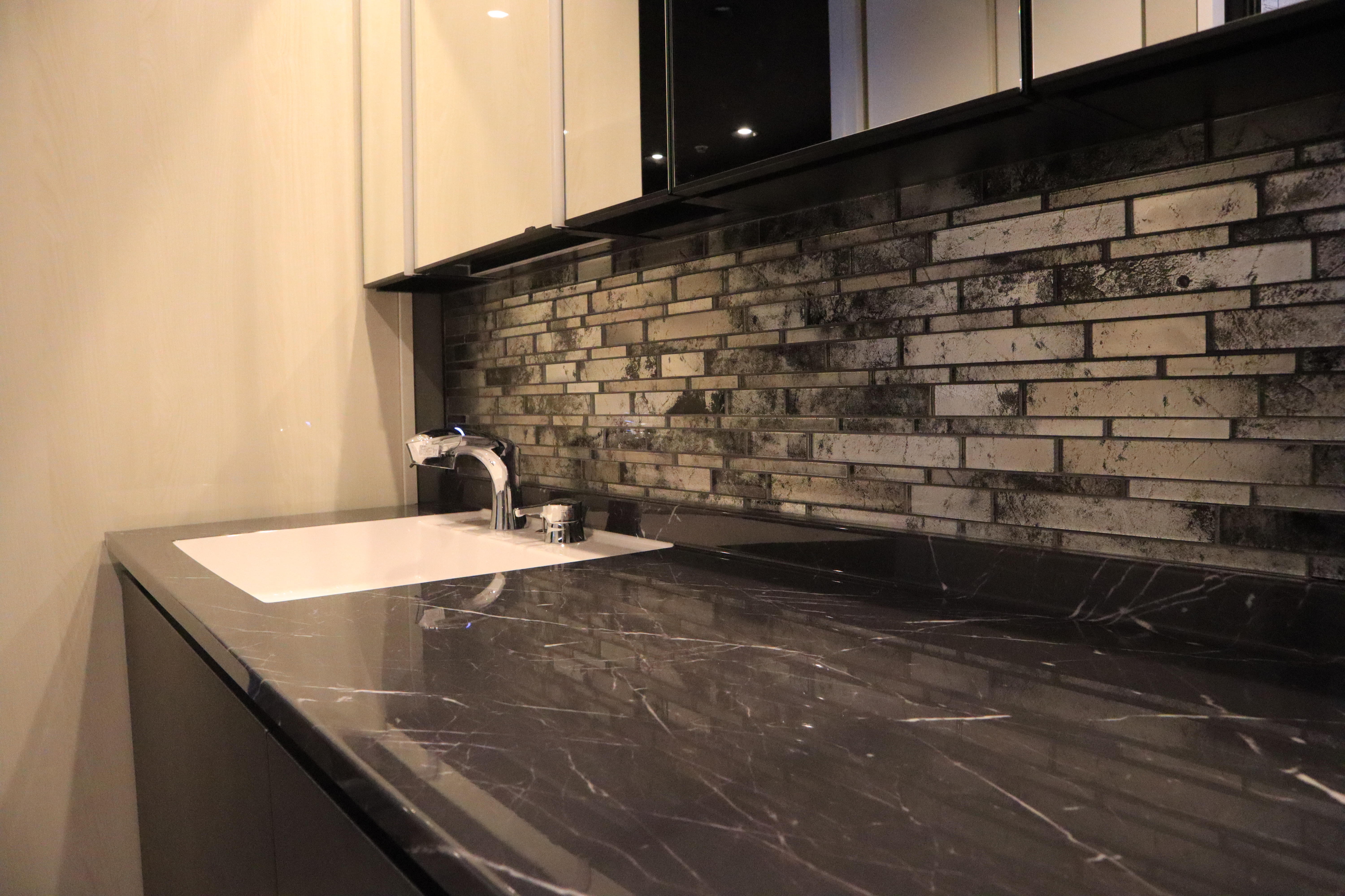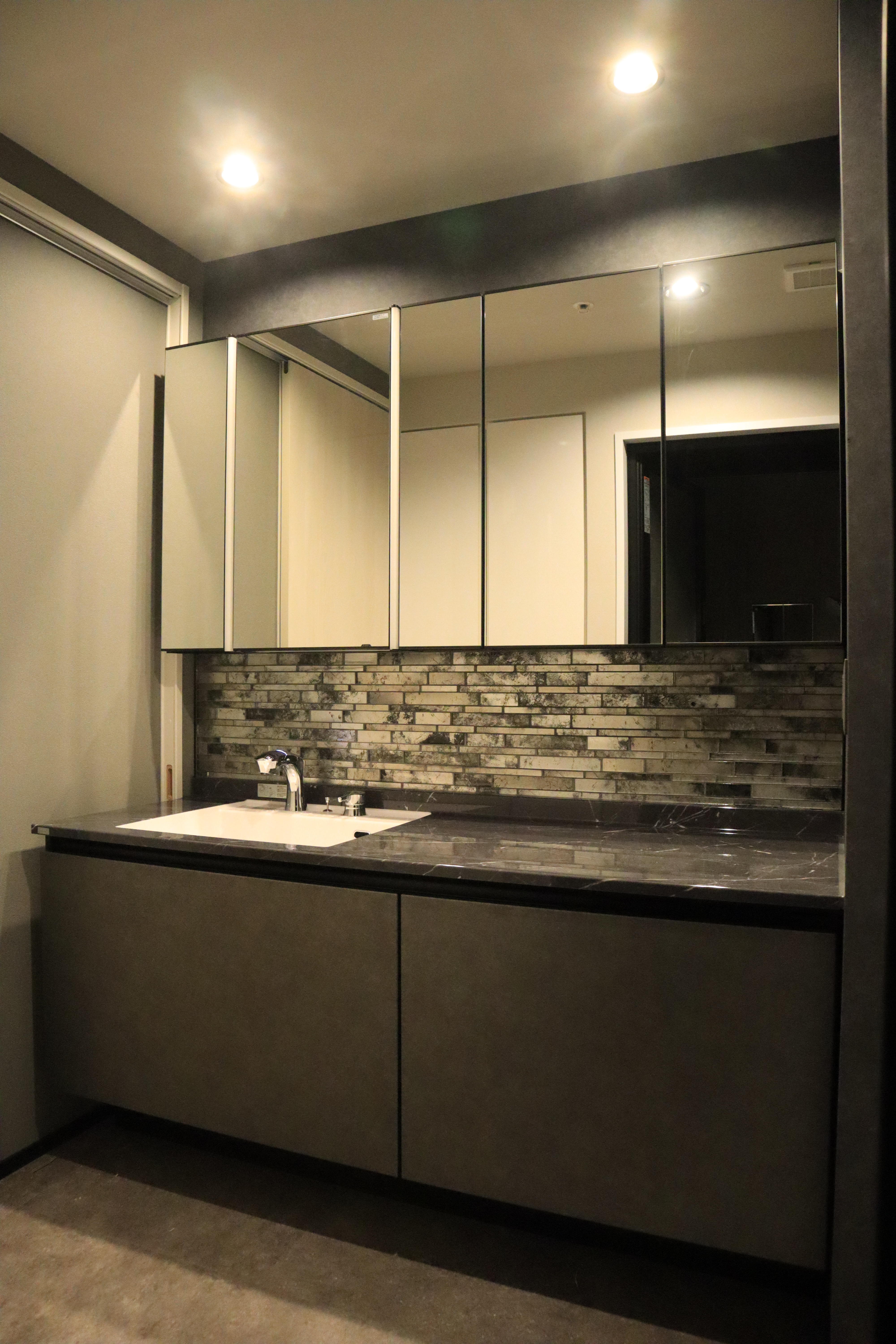 大理石調のラピシアカウンターと全面のタイルが高級感を演出します。空間いっぱいに広がる5面鏡の裏はすべて収納スペースになっていて、機能性にも優れています。奥様が困っていた多くなりがちなケア用品も、しっかりと収納できました。品位と機能性にこだわった美しい洗面化粧台に、大変満足されていました。