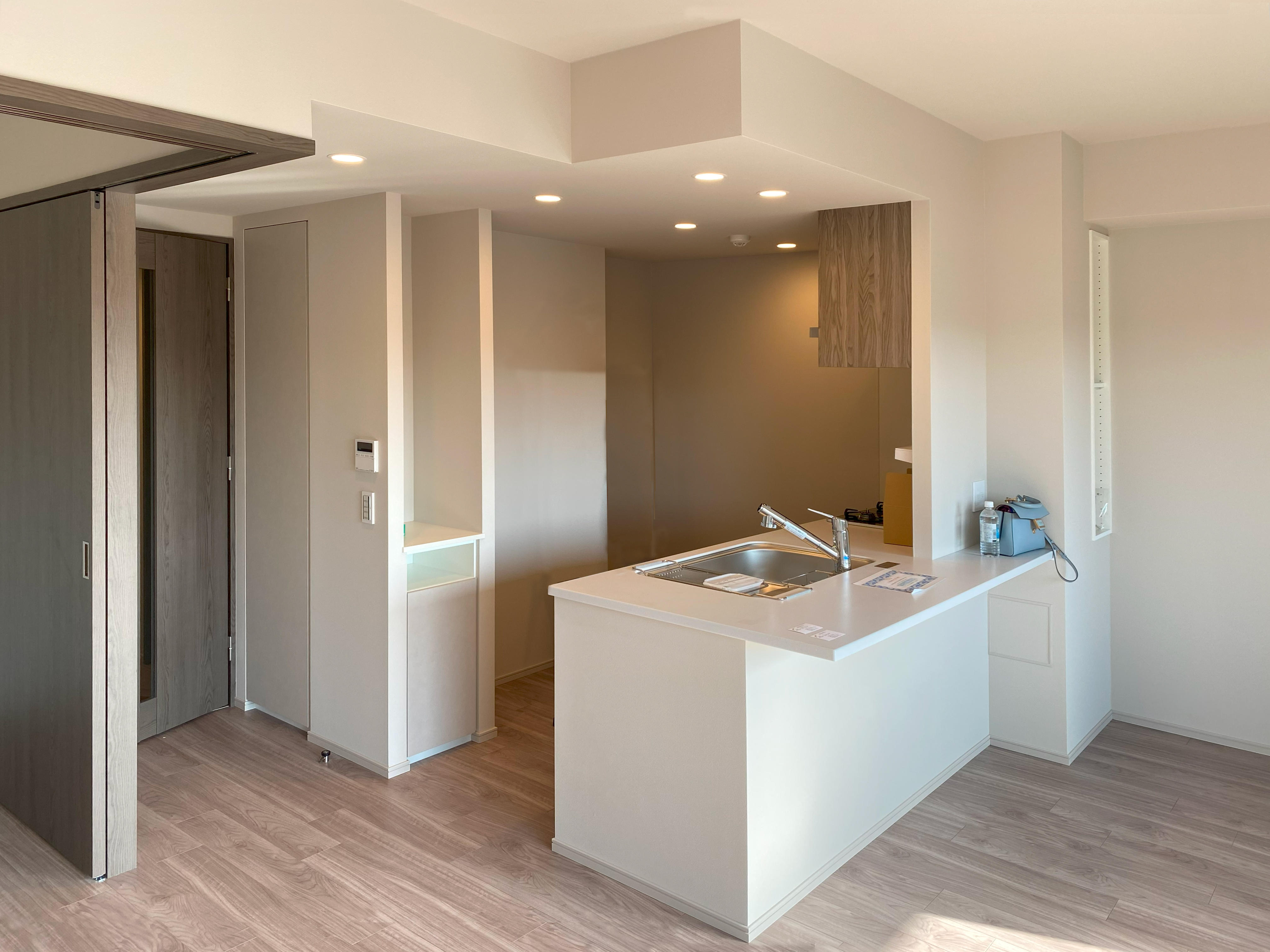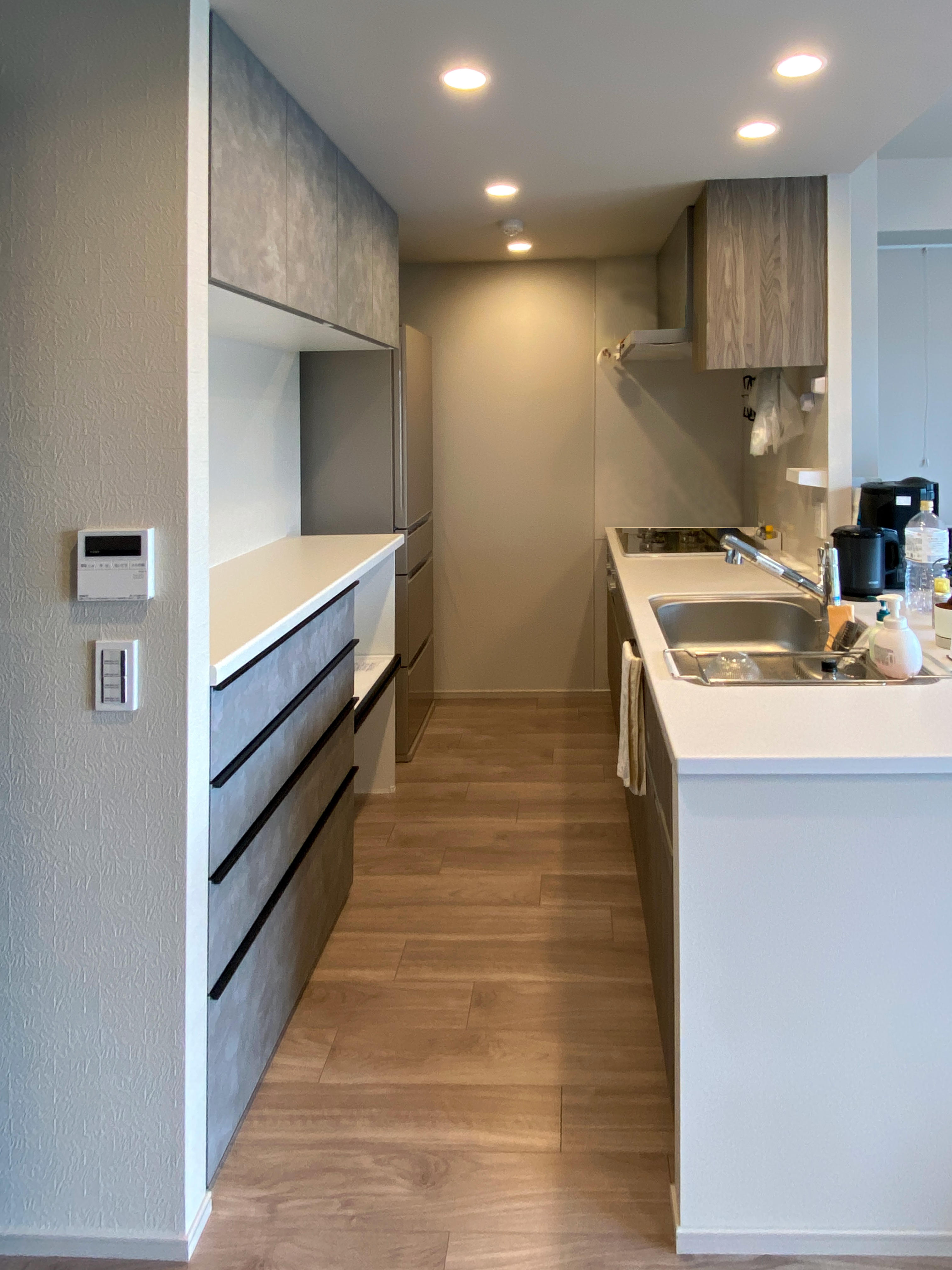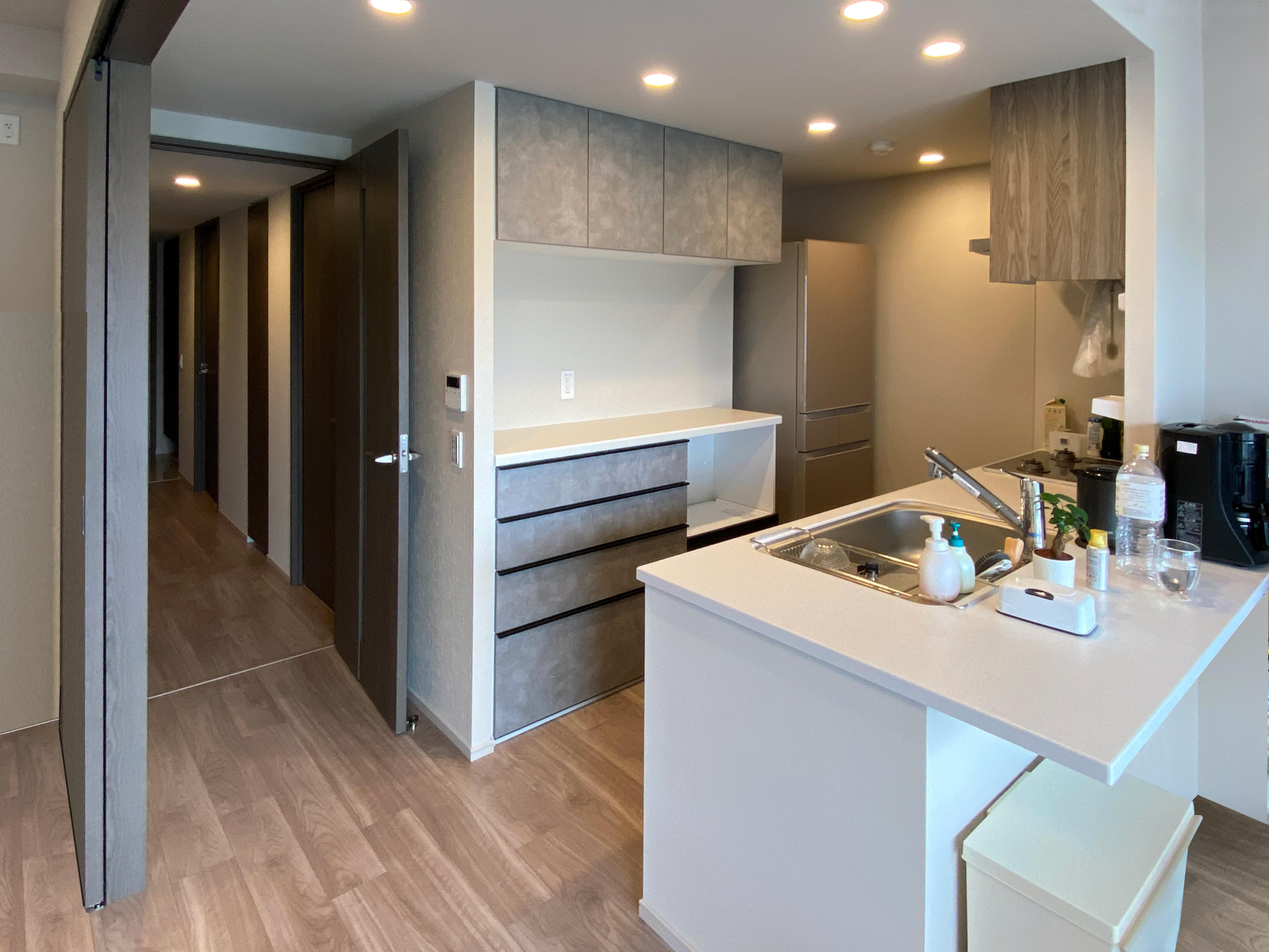 マンションの施工会社からは造作棚の撤去は可能との返答を頂いており、改めて弊社の営業が確認して撤去可能と判断したところから、背面いっぱい幅1500mmで大容量のカップボード新設が実現しました。