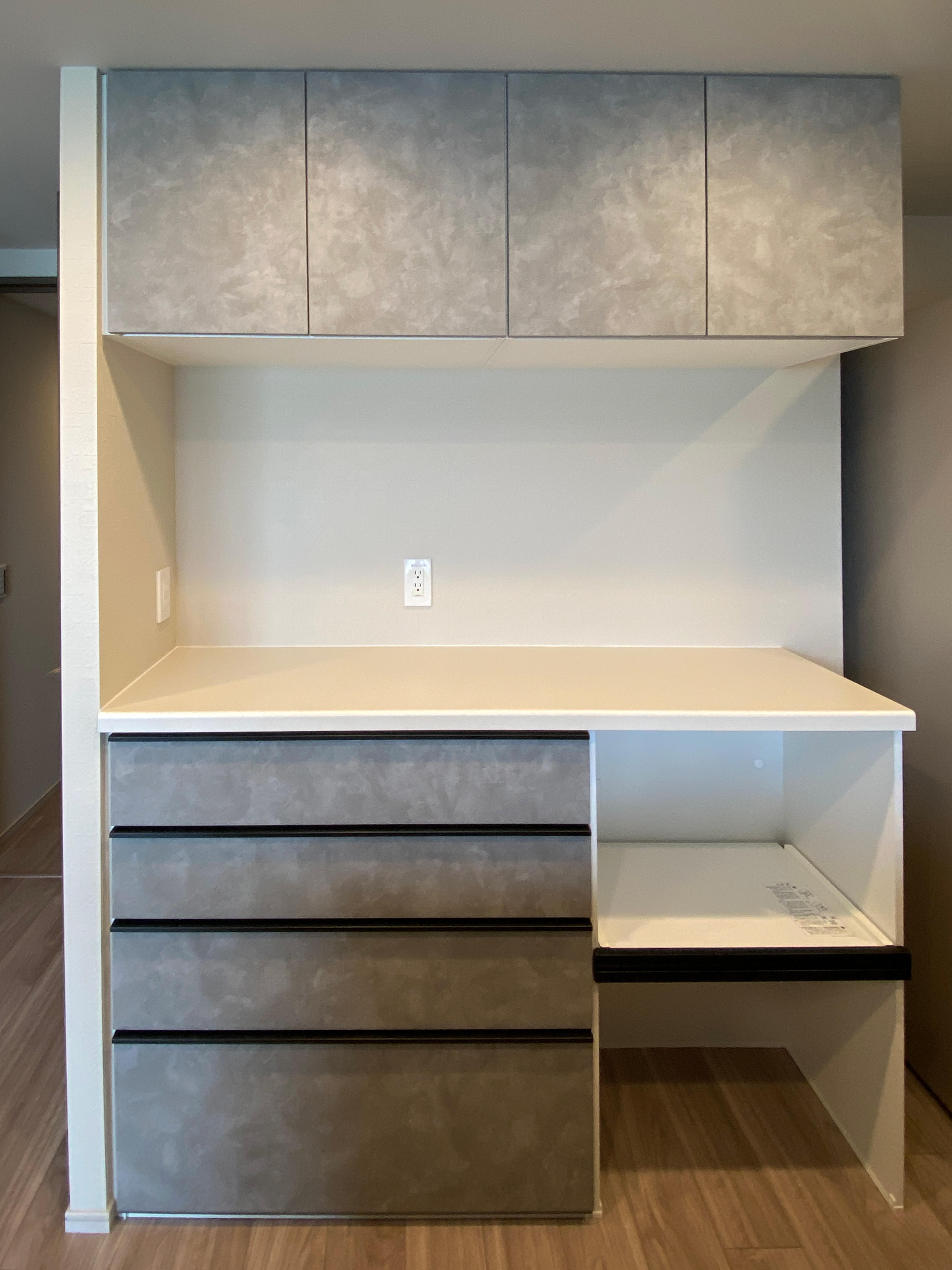 引越し前からカップボードの新設を検討されていた施主様ですが、既存の造作棚の撤去の可否が不透明で、設置するカップボードの大きさを決めかねていました。