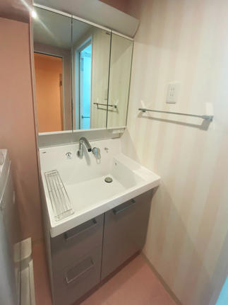 温水器、洗面所、お風呂を同時にリフォームしたことで、既存の温水器周りにあった配管を床下に移動させることができました。従来の配管は床から洗面所に突き出してなかなかの存在感を発揮していたので、無くなっただけでも洗面所がとても広く感じるようになりました。マンションの建設当時と現在では施工方法なども変化しているので、関係箇所を同時にリフォームすることで空間を効率よく利用して、スペースを作り出すこともできます。