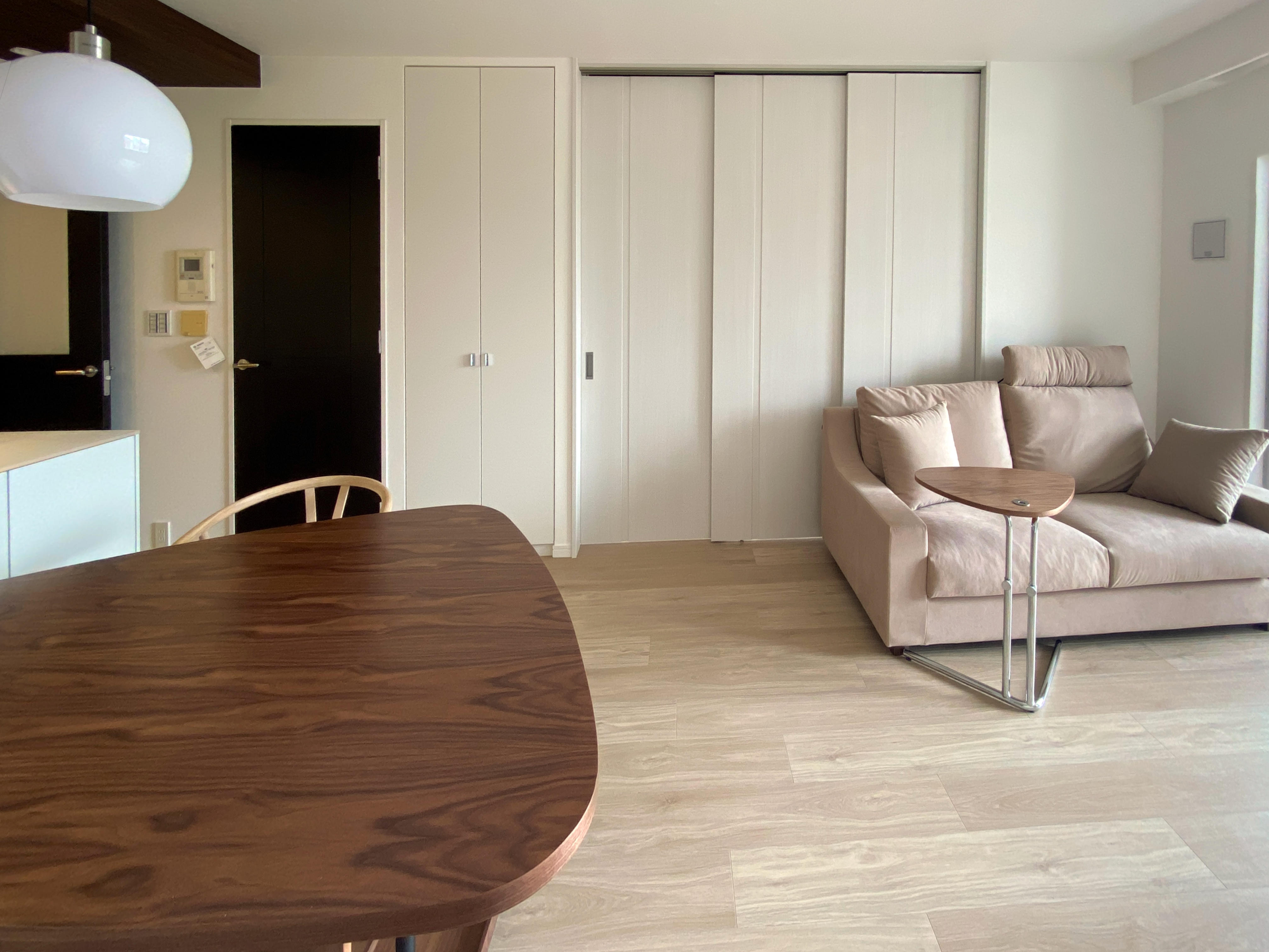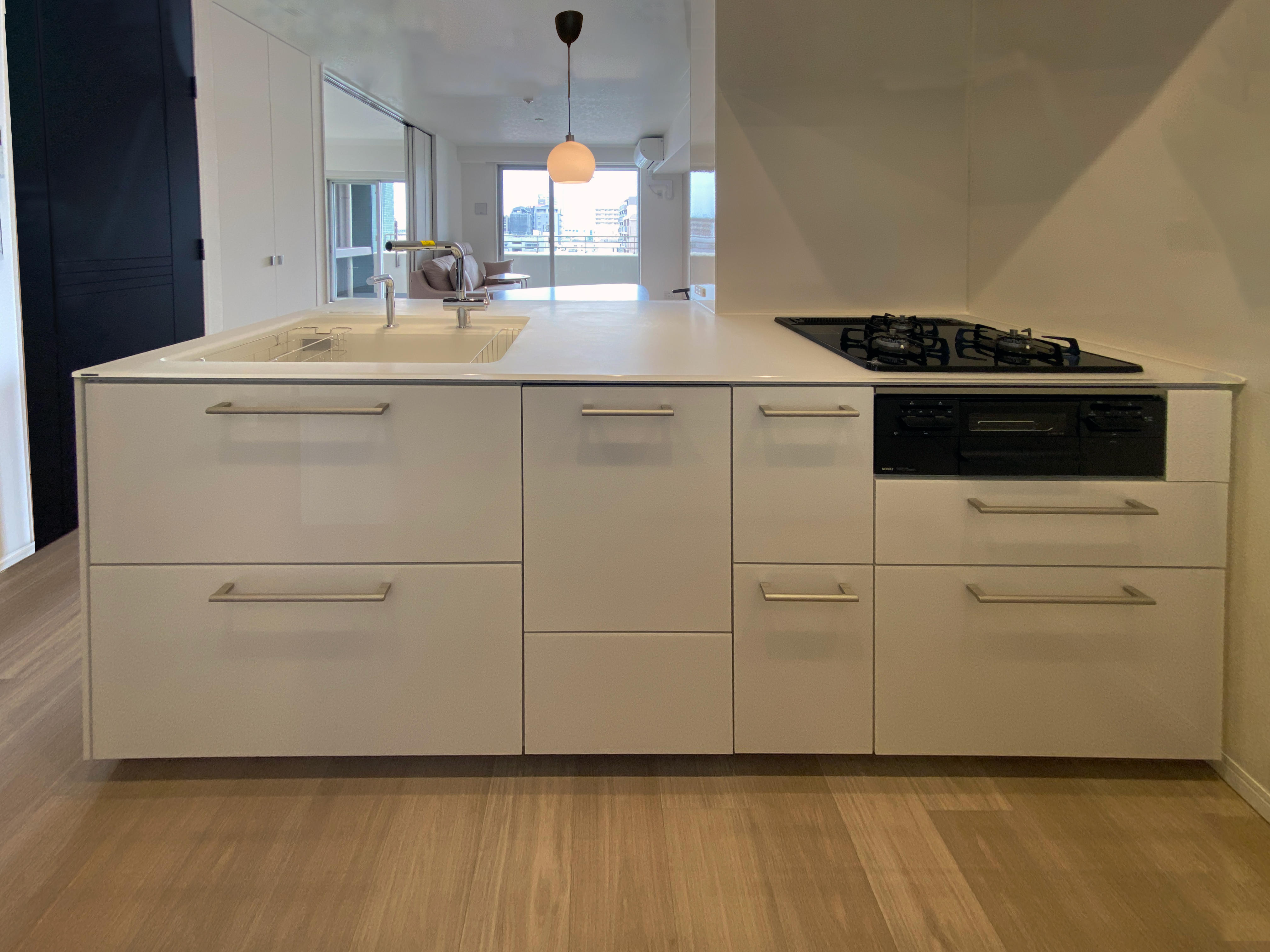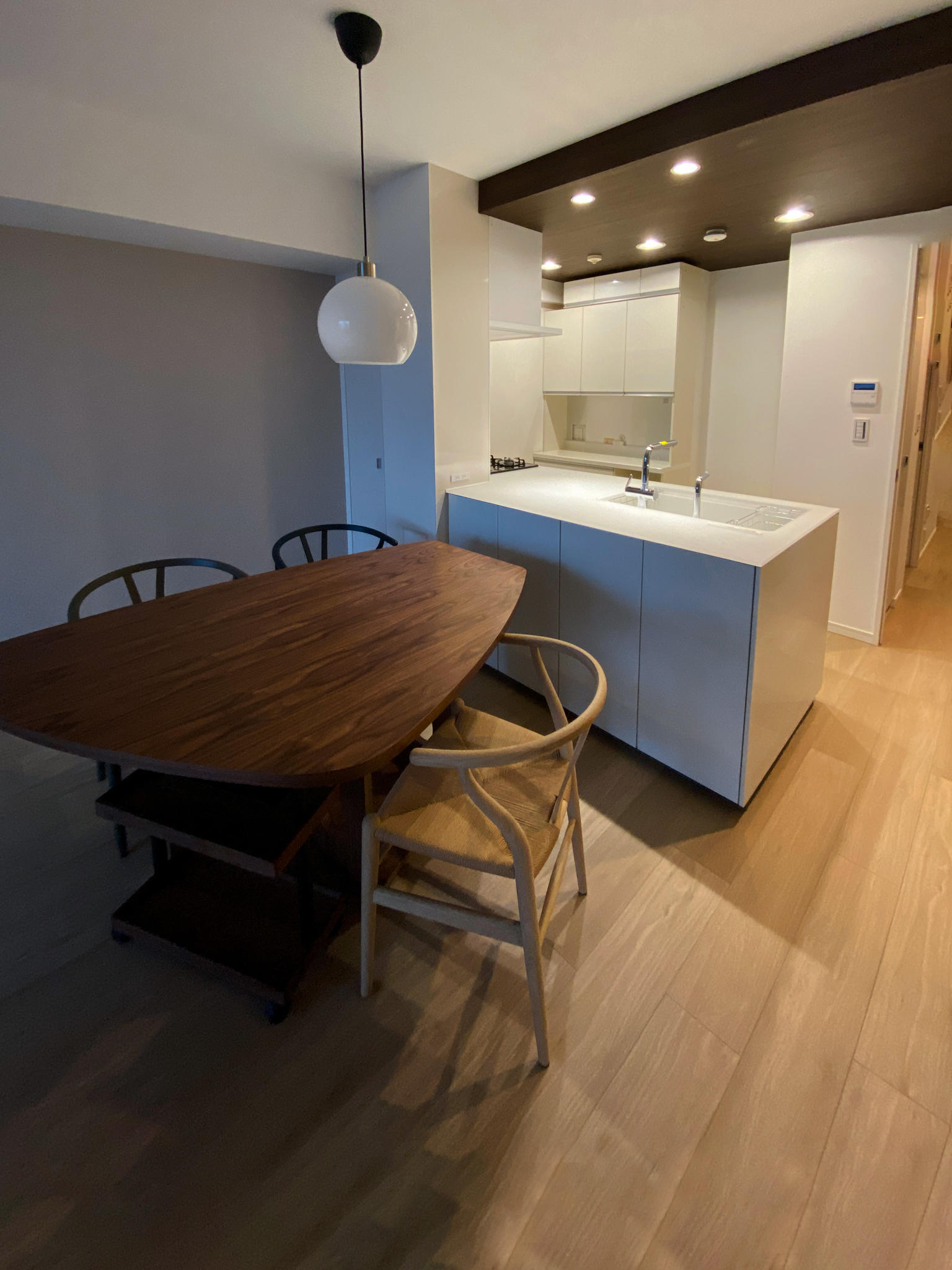 キッチンは垂れ壁と吊戸棚を撤去して、家族とコミュニケーションが取りやすいオープンなペニンシェラキッチンになりました。リビングは脇の小部屋を隔てる引戸部分の垂れ壁を撤去して、リビングと一体感が感じられる広く使える仕様にしています。