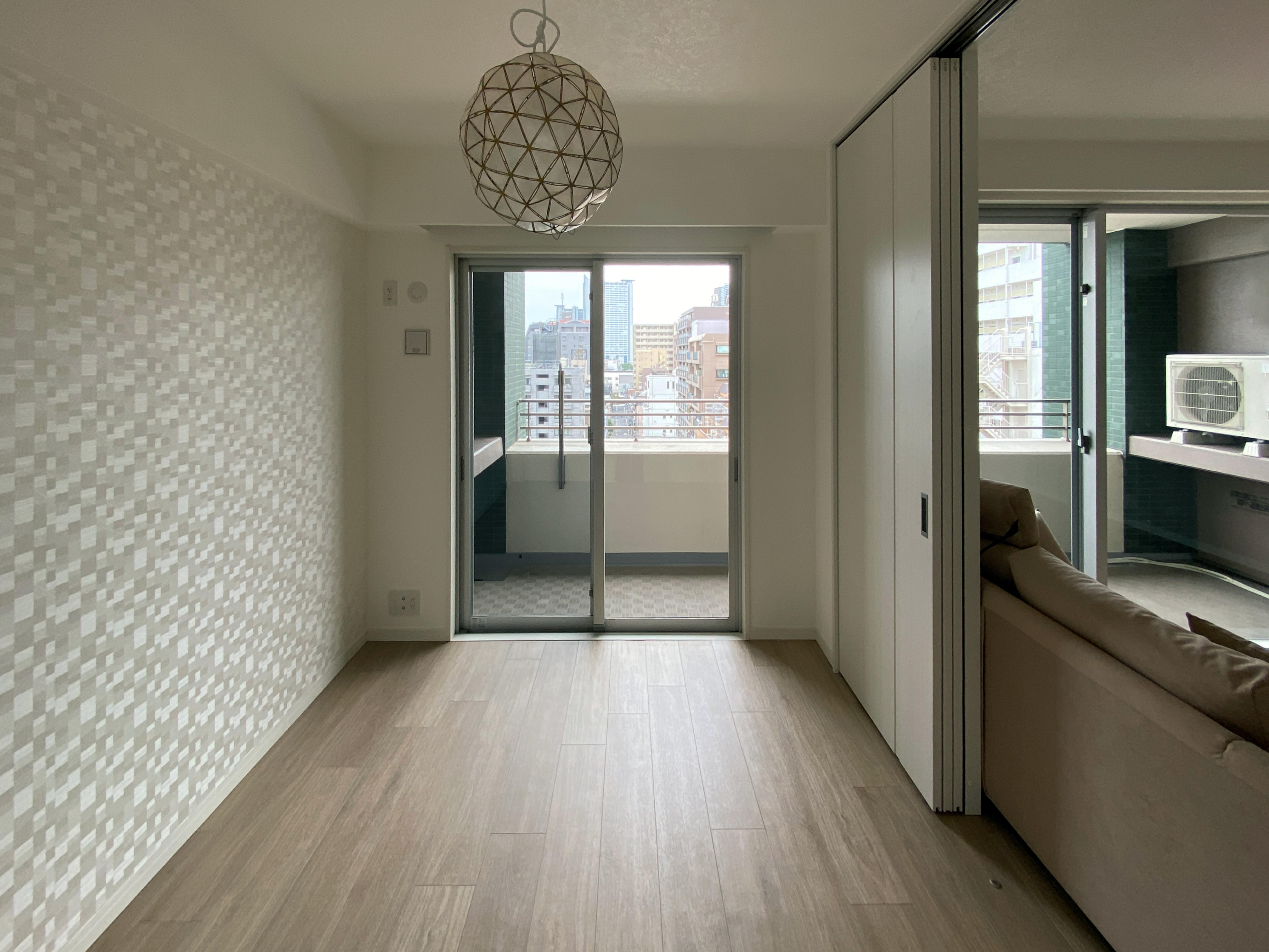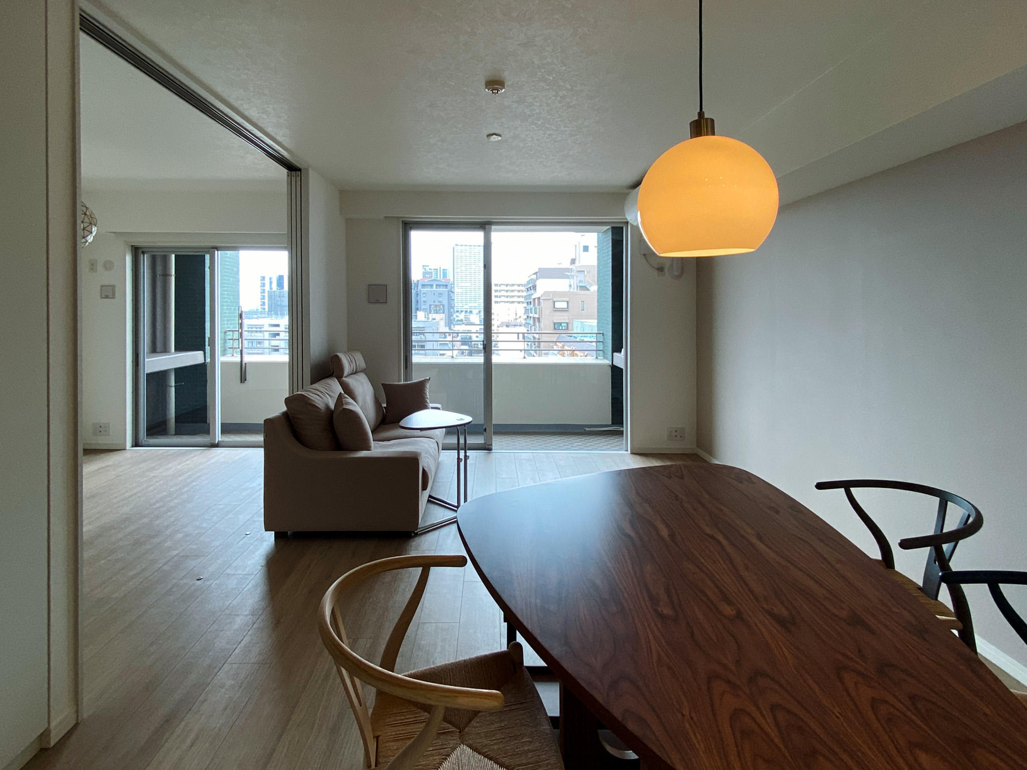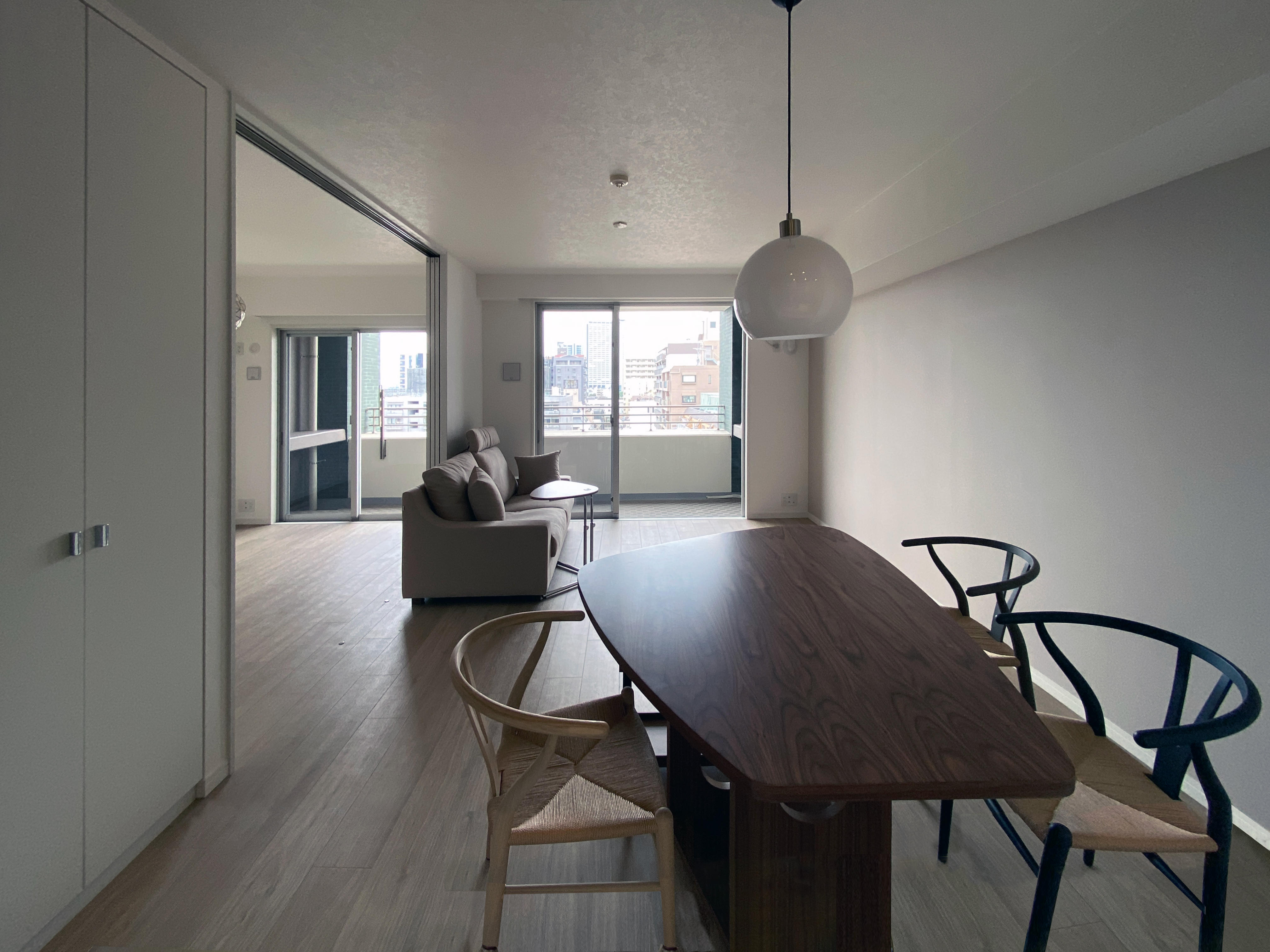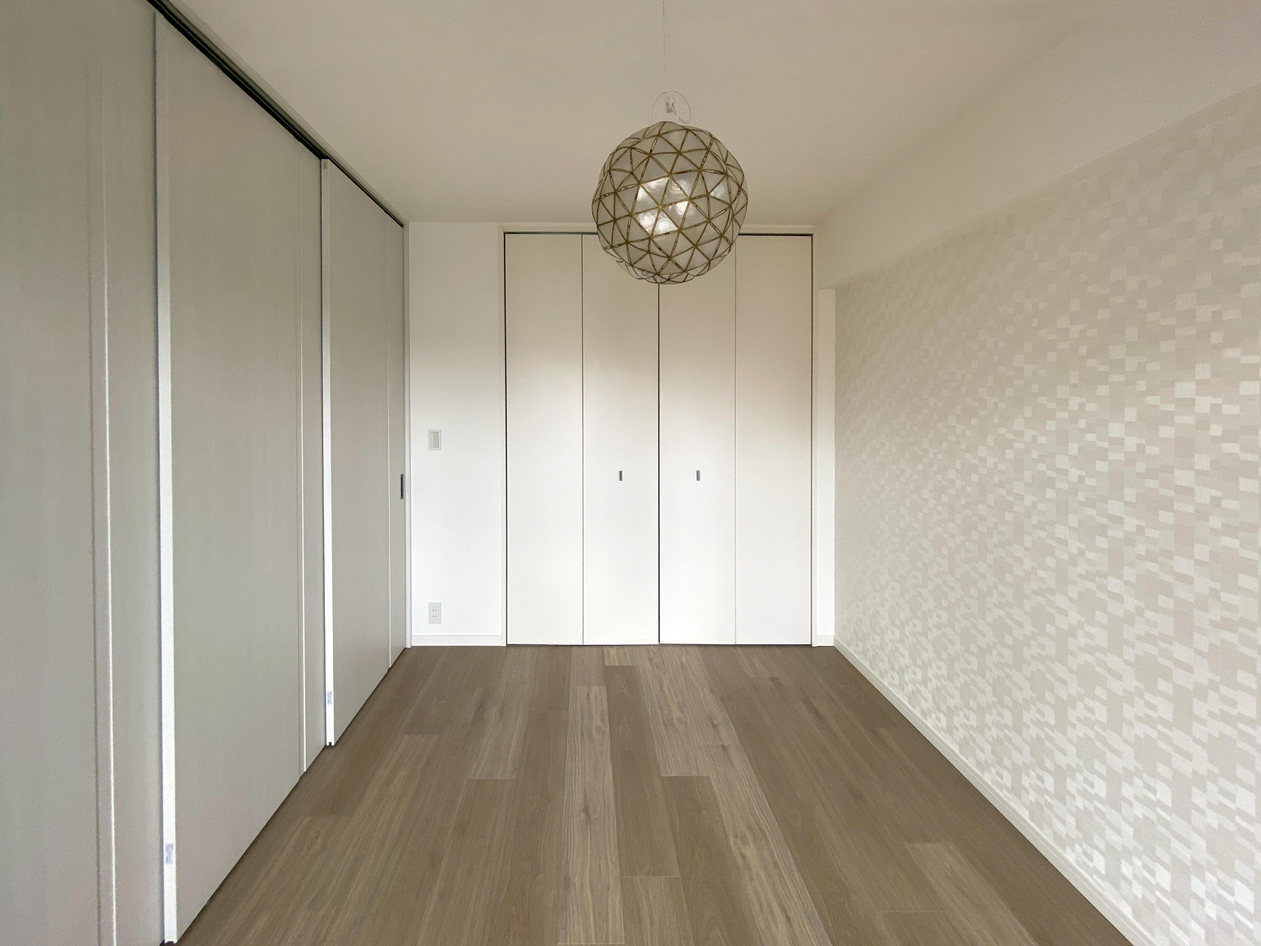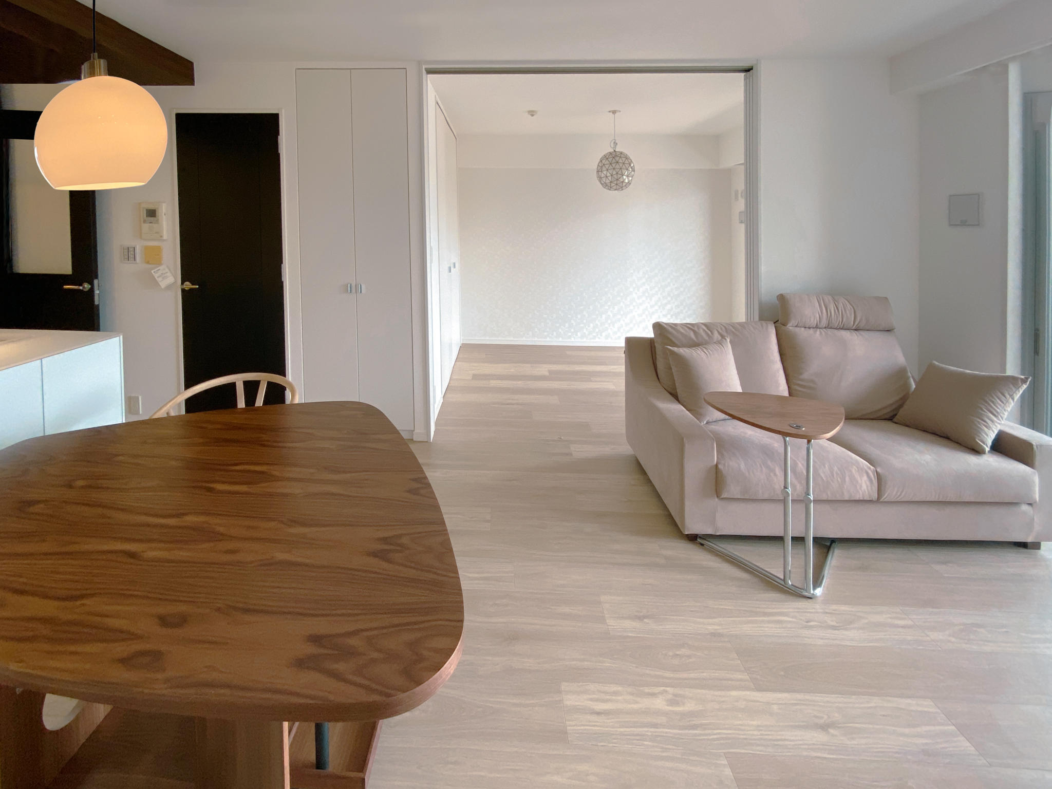 以前のリビングでは垂れ壁によって視線の抜けを確保しつつ、リビングと洋室の空間を圧迫感なく仕切っていました。それでも今回、垂れ壁を撤去した事によってリビングと脇の洋室の一体感が向上、間仕切り戸を開けている状態での開放感は格段に上がりました◎