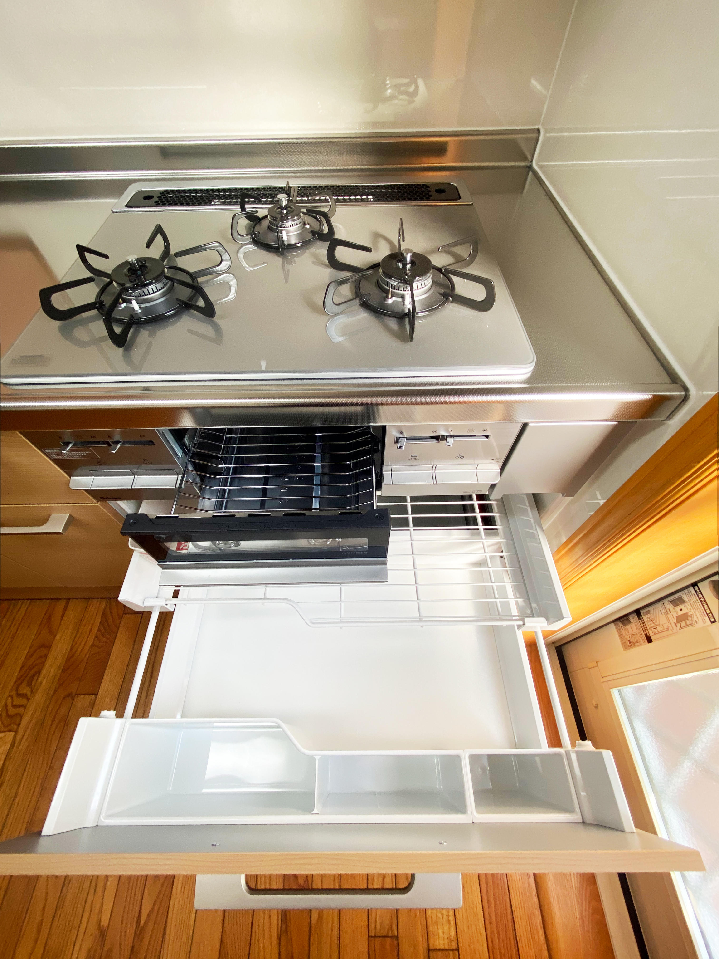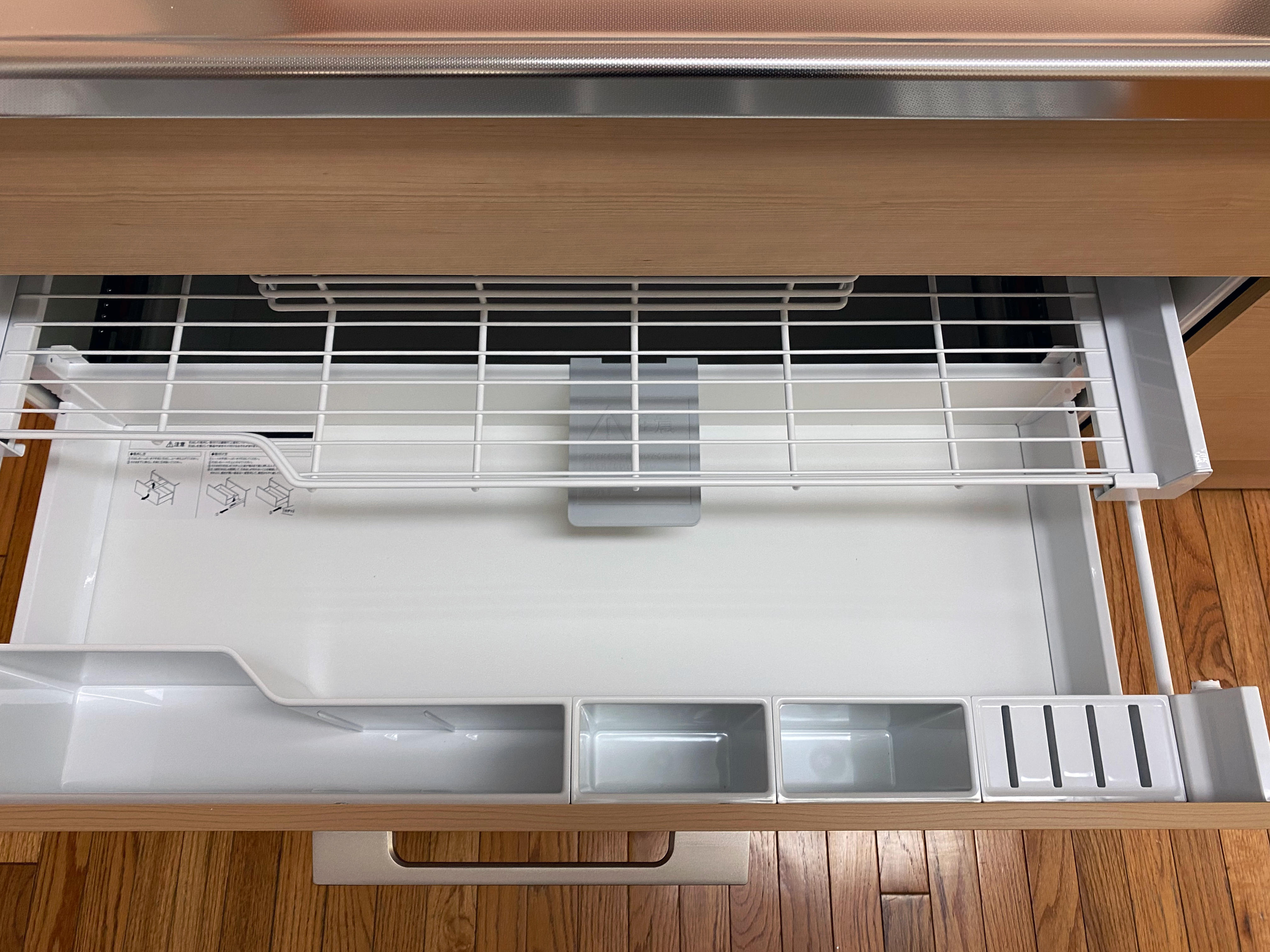 実際にリフォームを行っていただき、最新のキッチンはスペースの有効利用で収納力が大幅にアップ!特にワークトップ下のスペースは開き戸から引き出しタイプの収納に変更して、抜群に使い易くなりました!
