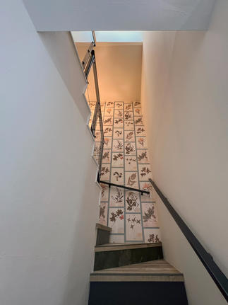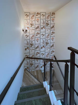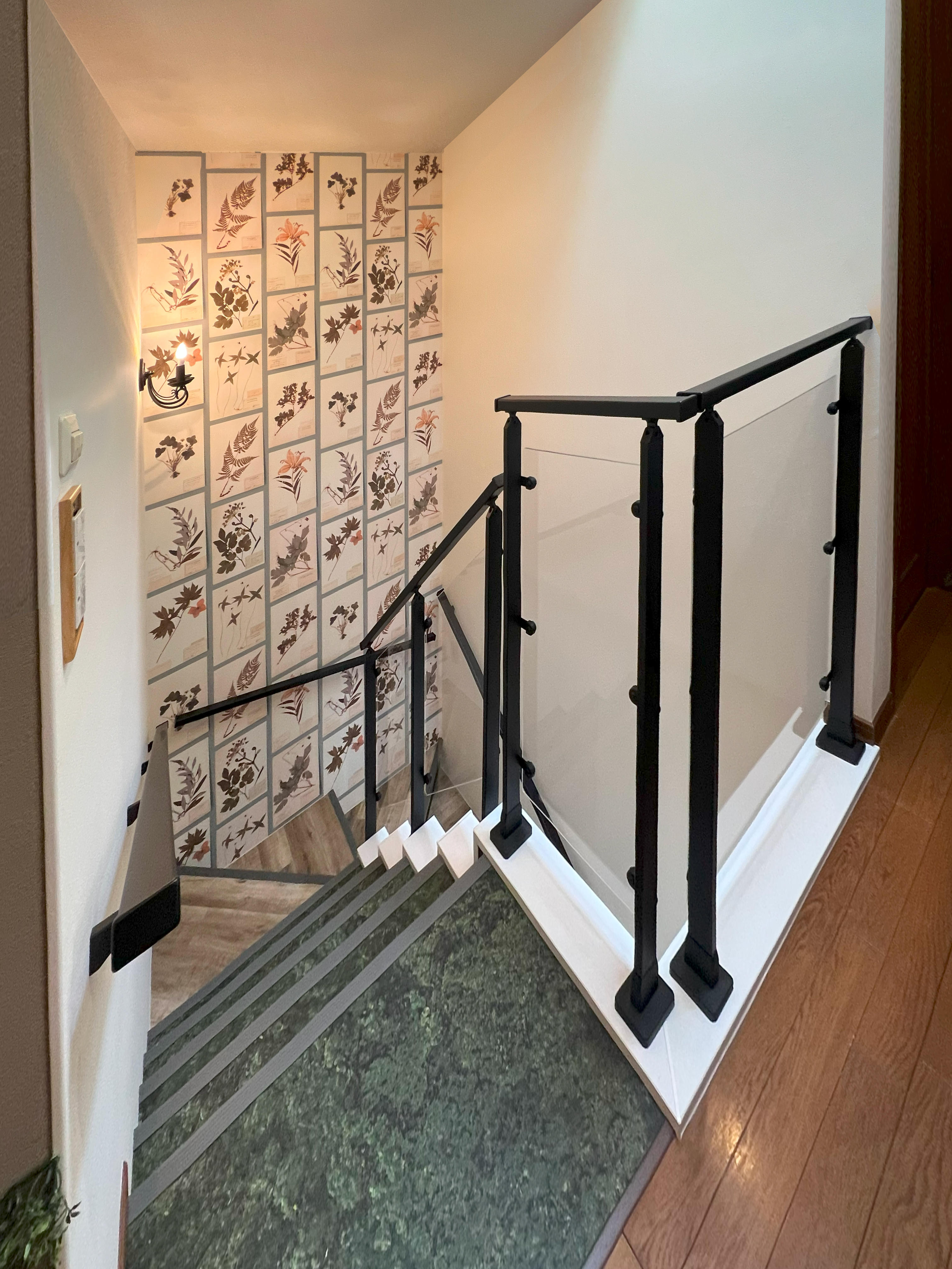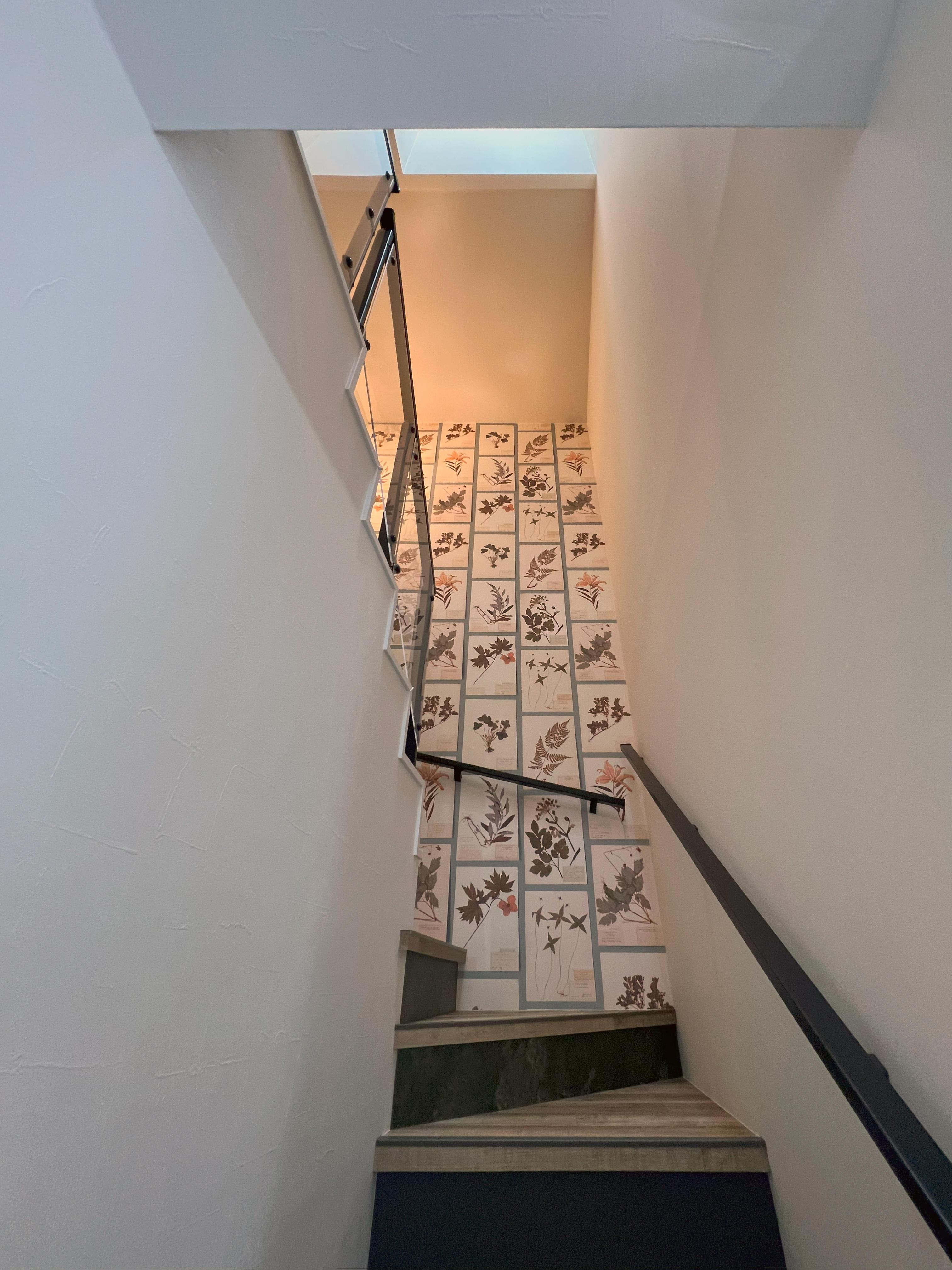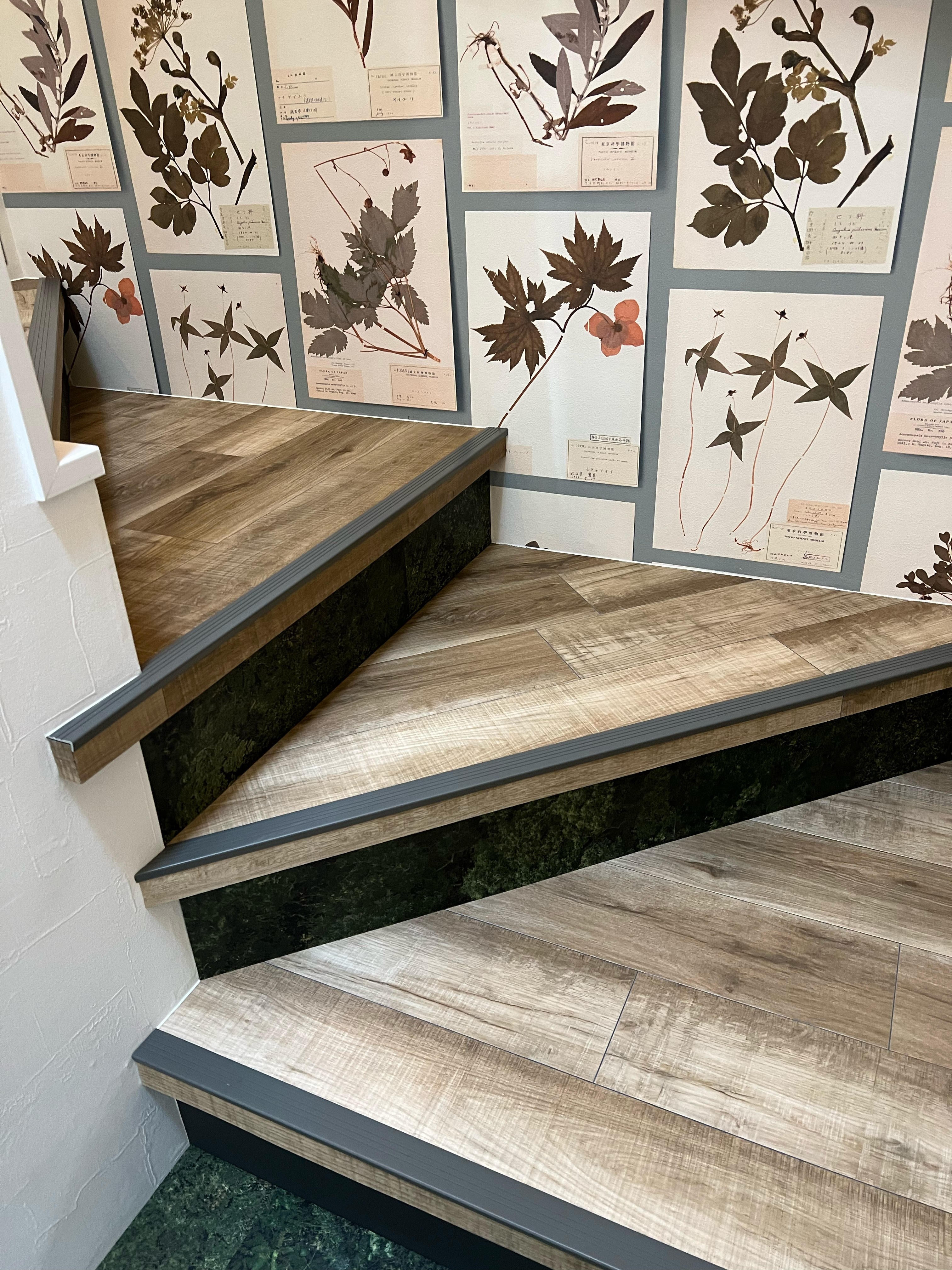 そして、なんといっても目を引くのが、ターン部分の廻り踏板正面の壁に貼られたアクセントクロス。サンゲツが国立科学博物館とコラボしたパターンシリーズの壁紙で、多数の押し葉の標本が壁面を彩ります。