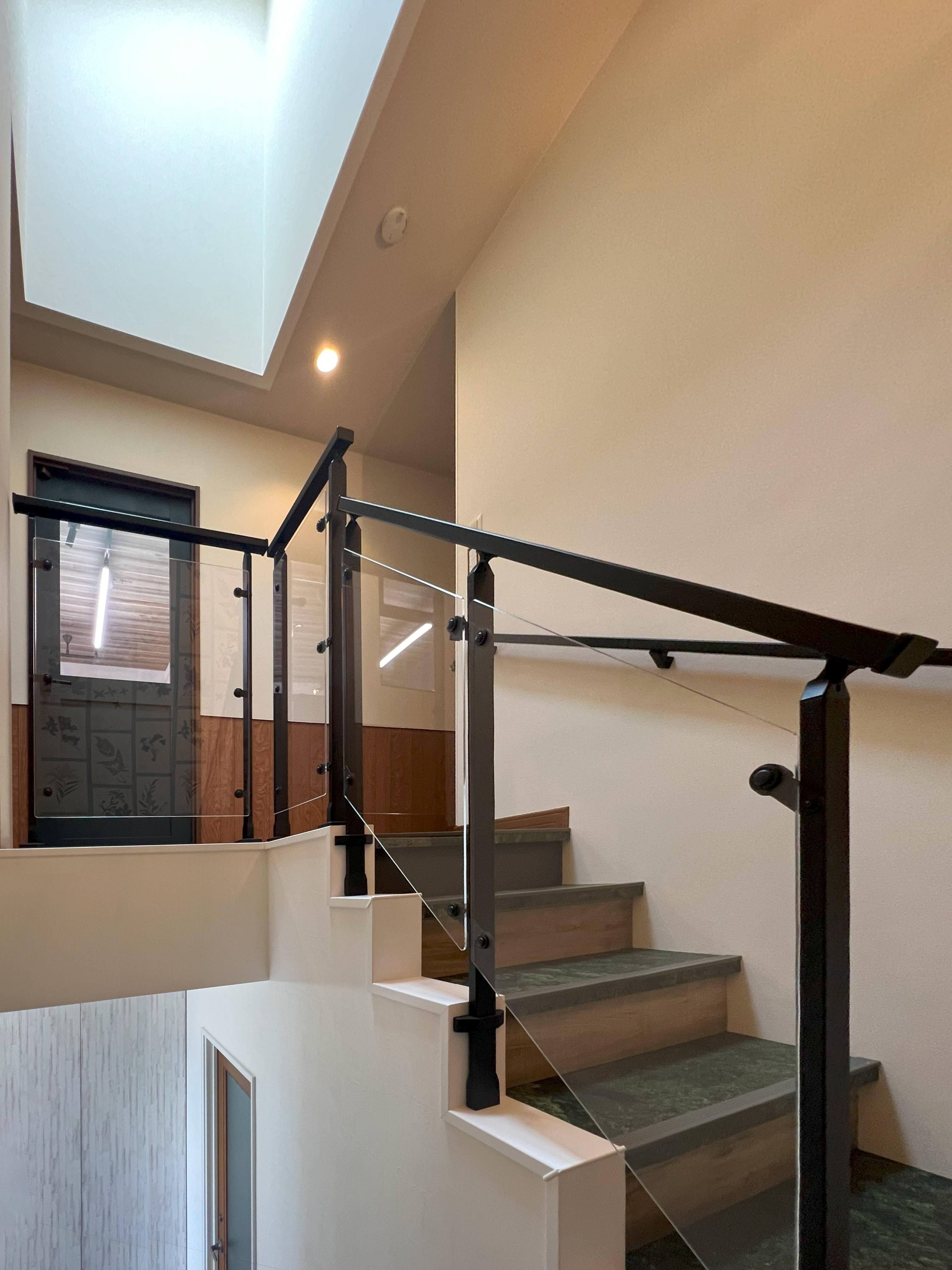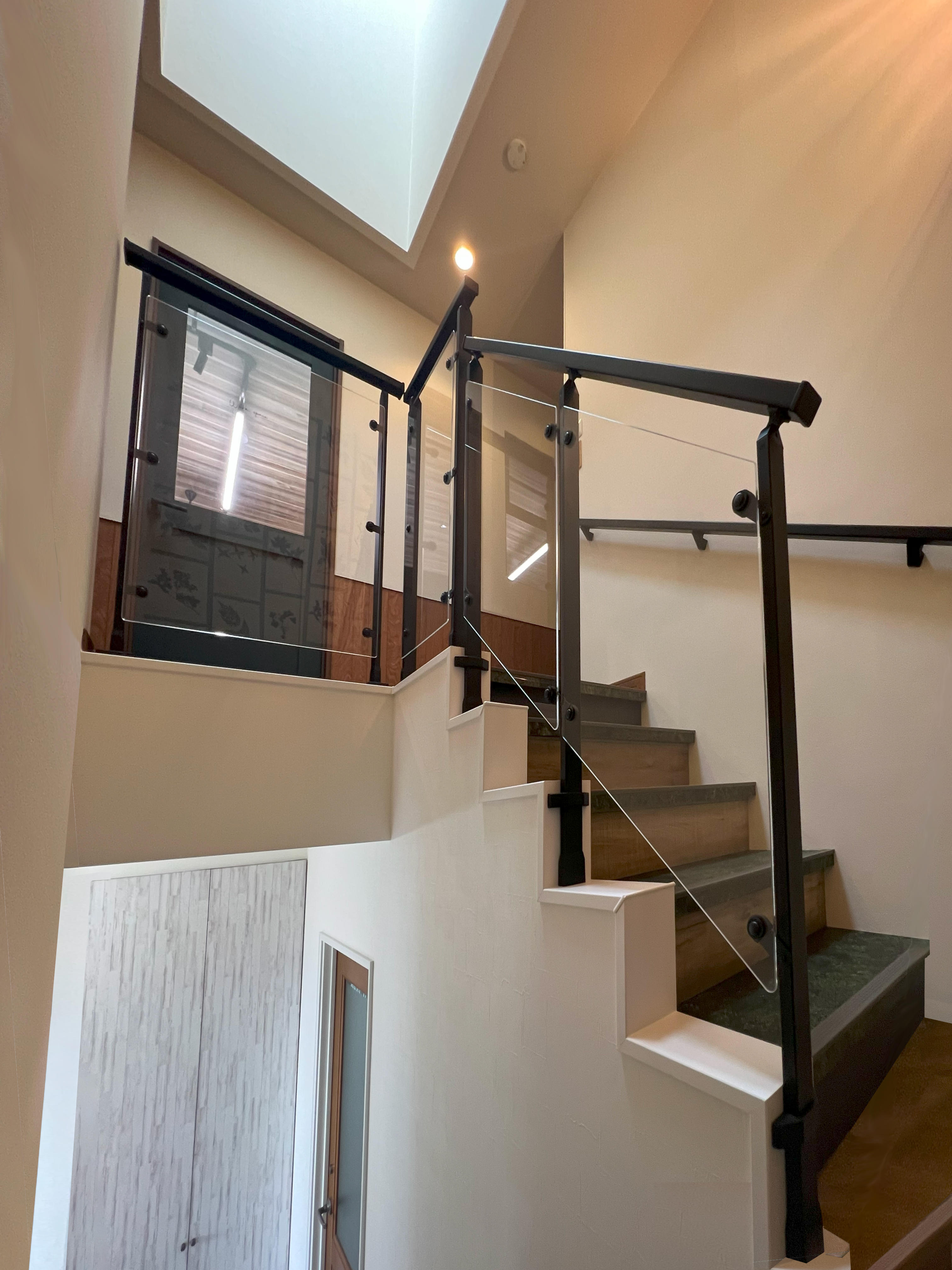手摺のデザインについては、まだ小さいお子様もいるご家庭でしたので、手すりによじ登ったり、すり抜けたりして落下する危険に配慮したアクリル製のパネルタイプを提案させていただきました。
