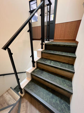 踏板のフロアタイルは木目調とグリーン調の2種類に、滑り止めにステップも取り付けました。蹴込板の一部には黒板を使って絵が描ける、遊び心溢れる仕様です。