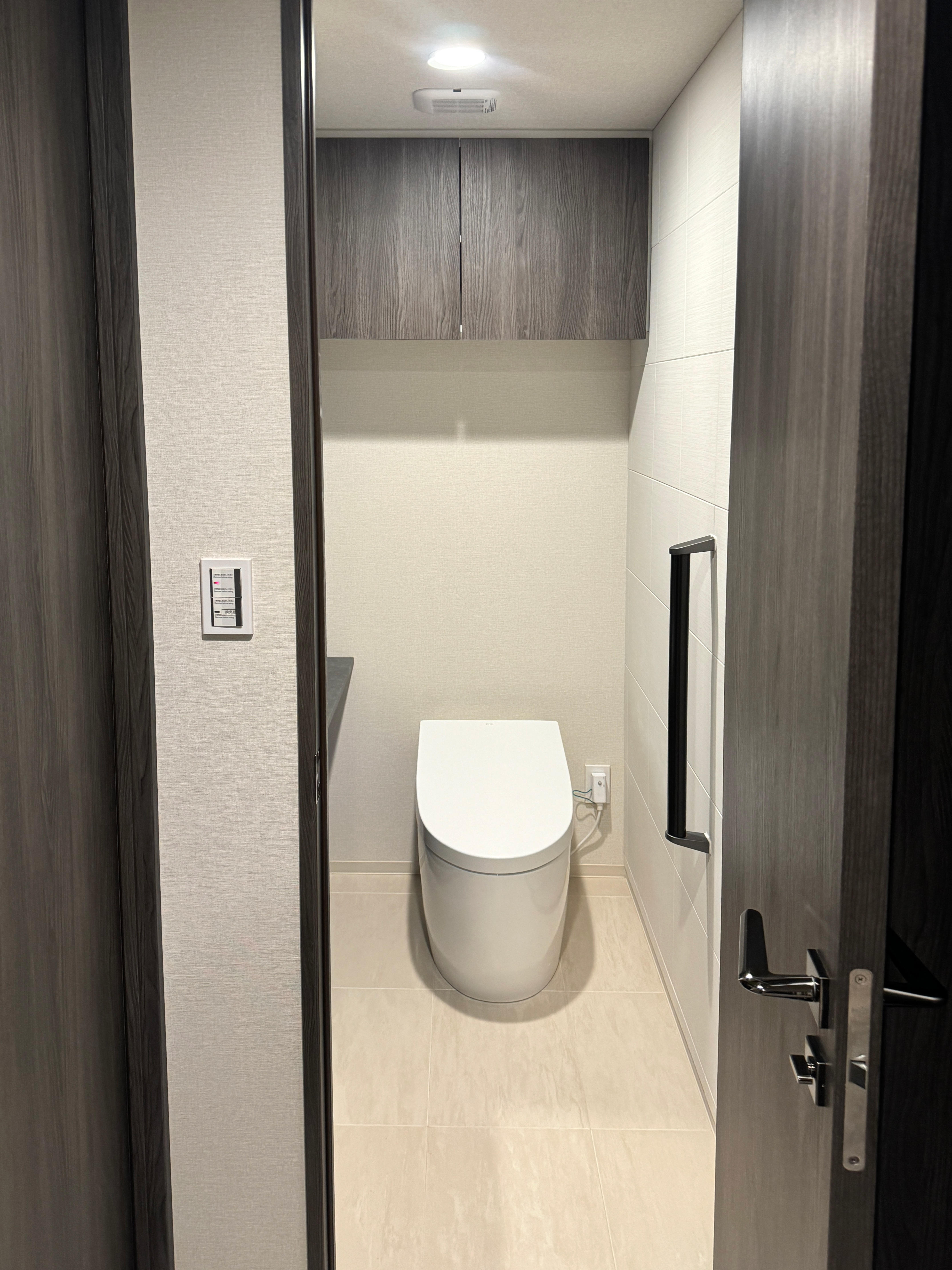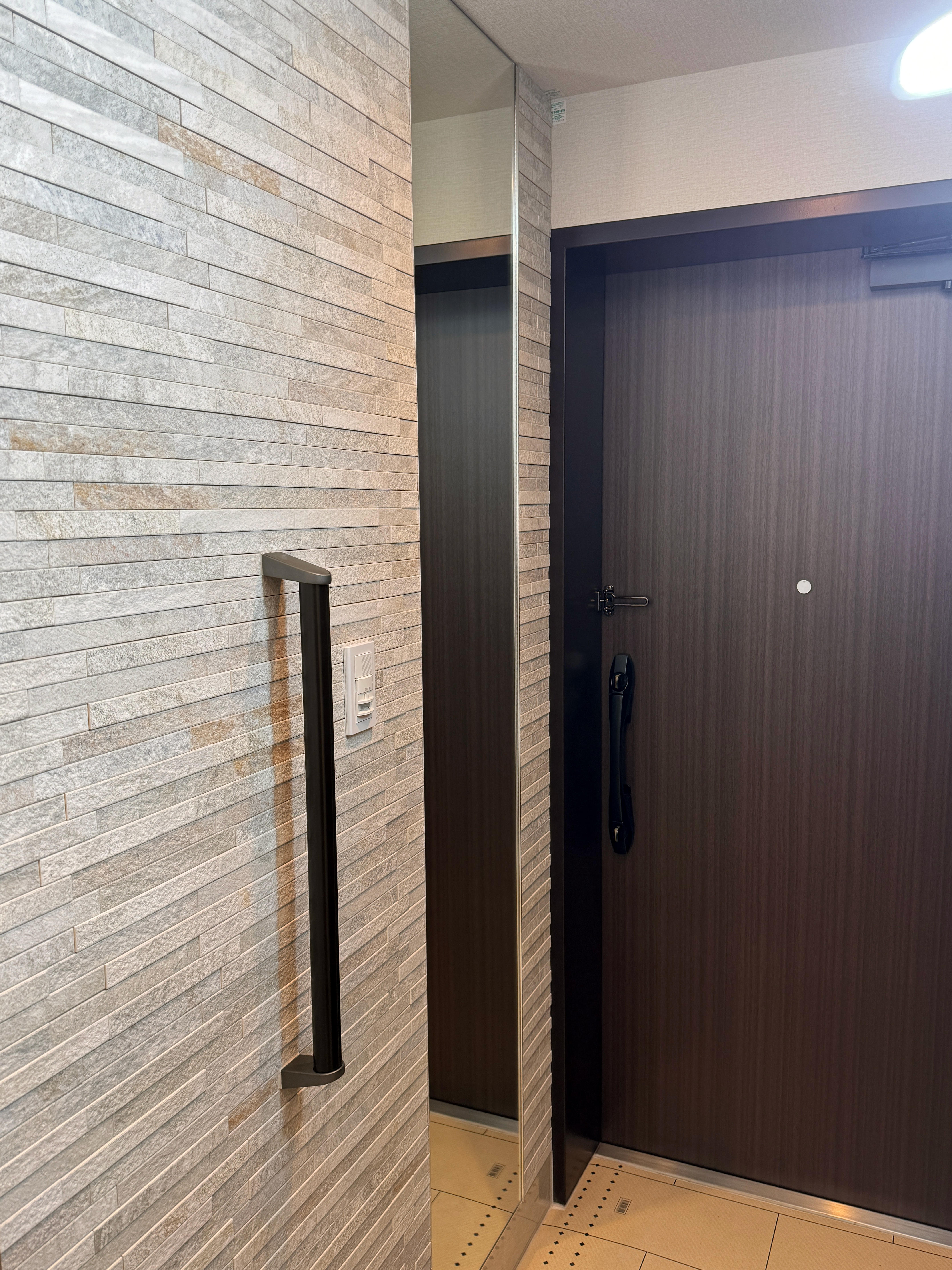 玄関には人気の組み合わせ、鏡とエコカラット。さらに、すぐに必要ではなかったのですが、今後を見据えて手すりも設置しました。玄関では、かがんだり、立ち上がったりと様々な動作が必要になります。上がり框の脇に手すりがあると安心ですよね。トイレにも同じくエコカラットと手すりを設置しました。