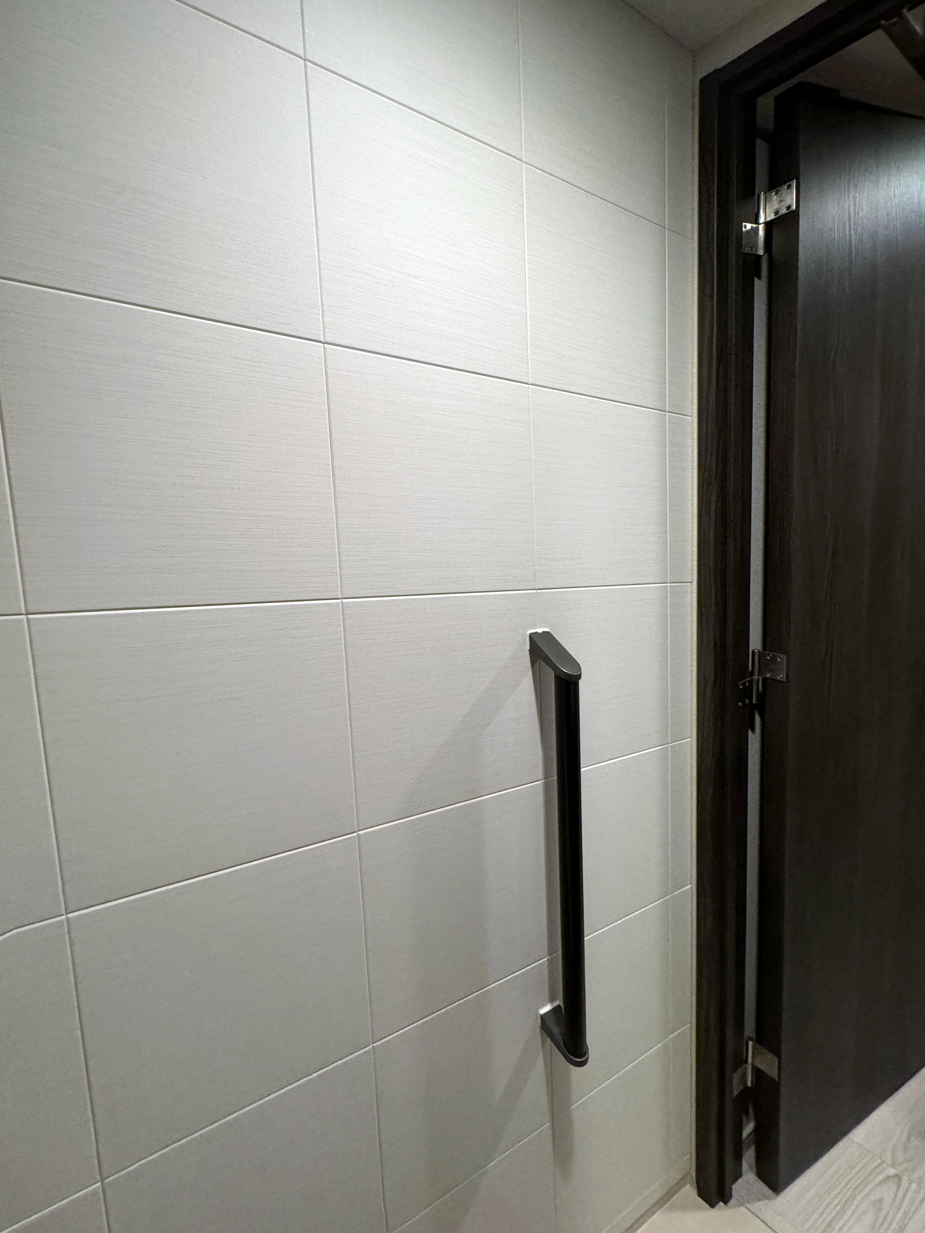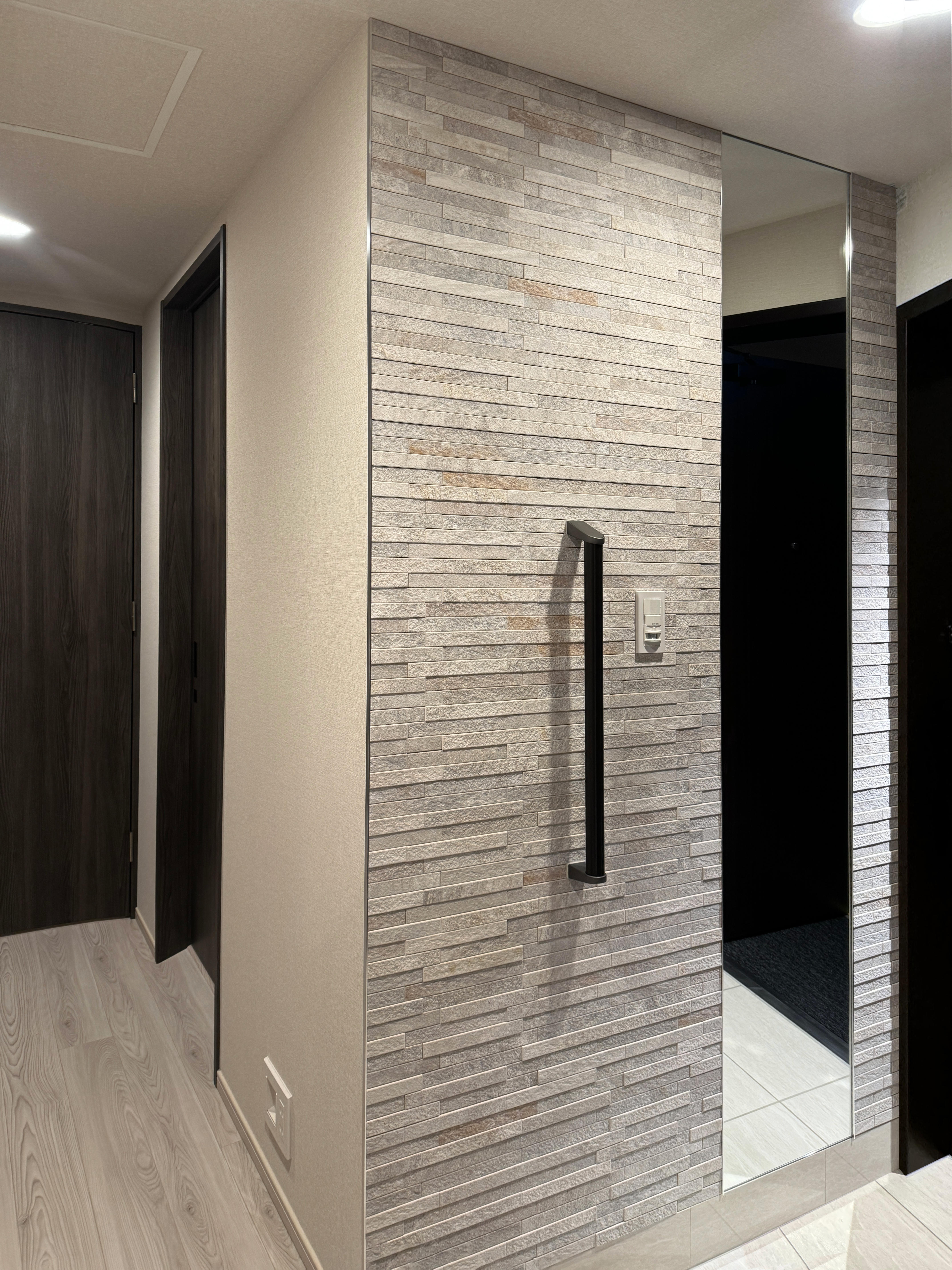 エコカラットと手すりを同時に施工することで、スペースを有効活用したレイアウトになりました。先にどちらかだけだと、ここまで綺麗には収まりません。ディティールにこだわったからこそ、きれいな仕上がりになりました◎