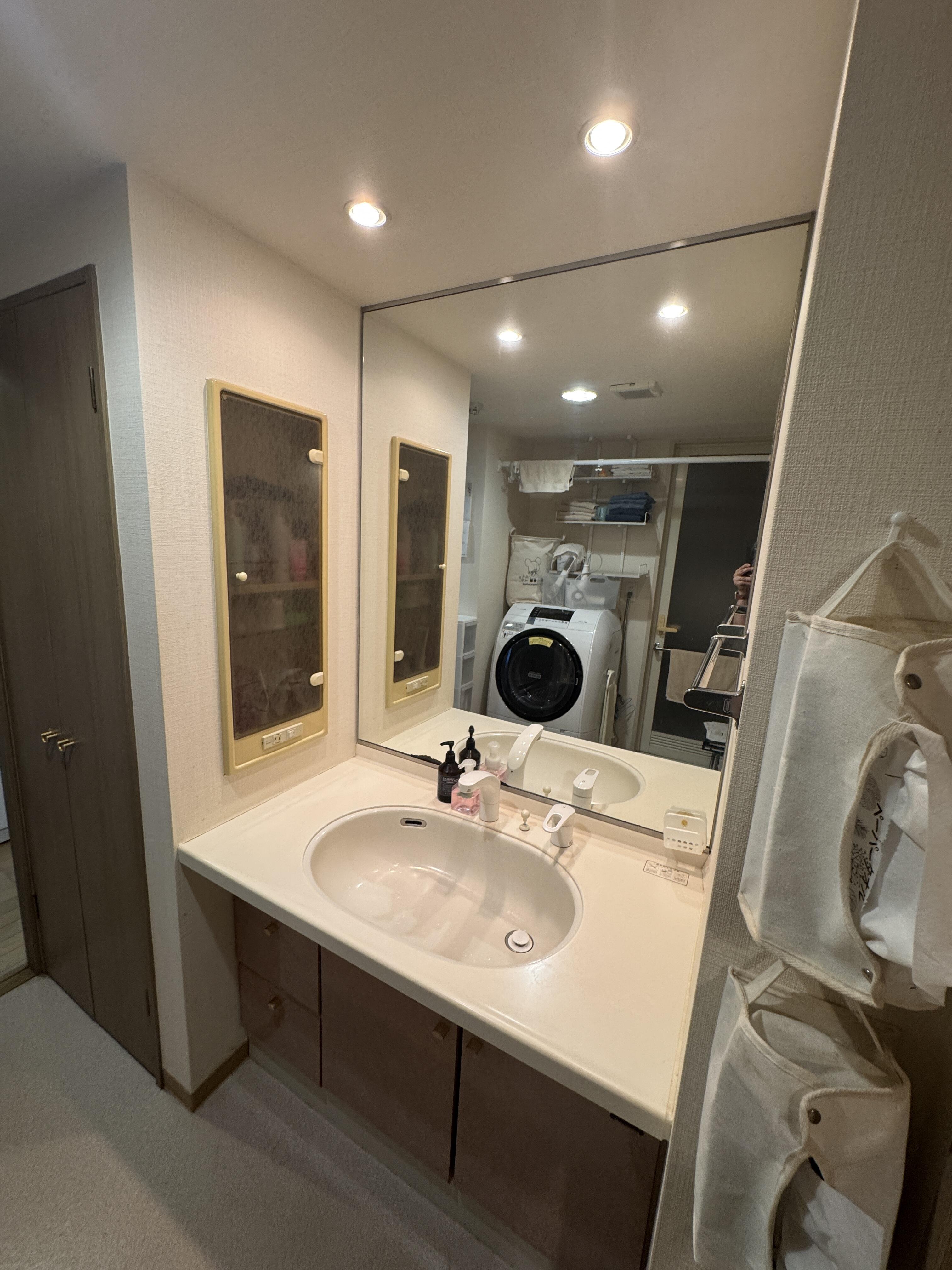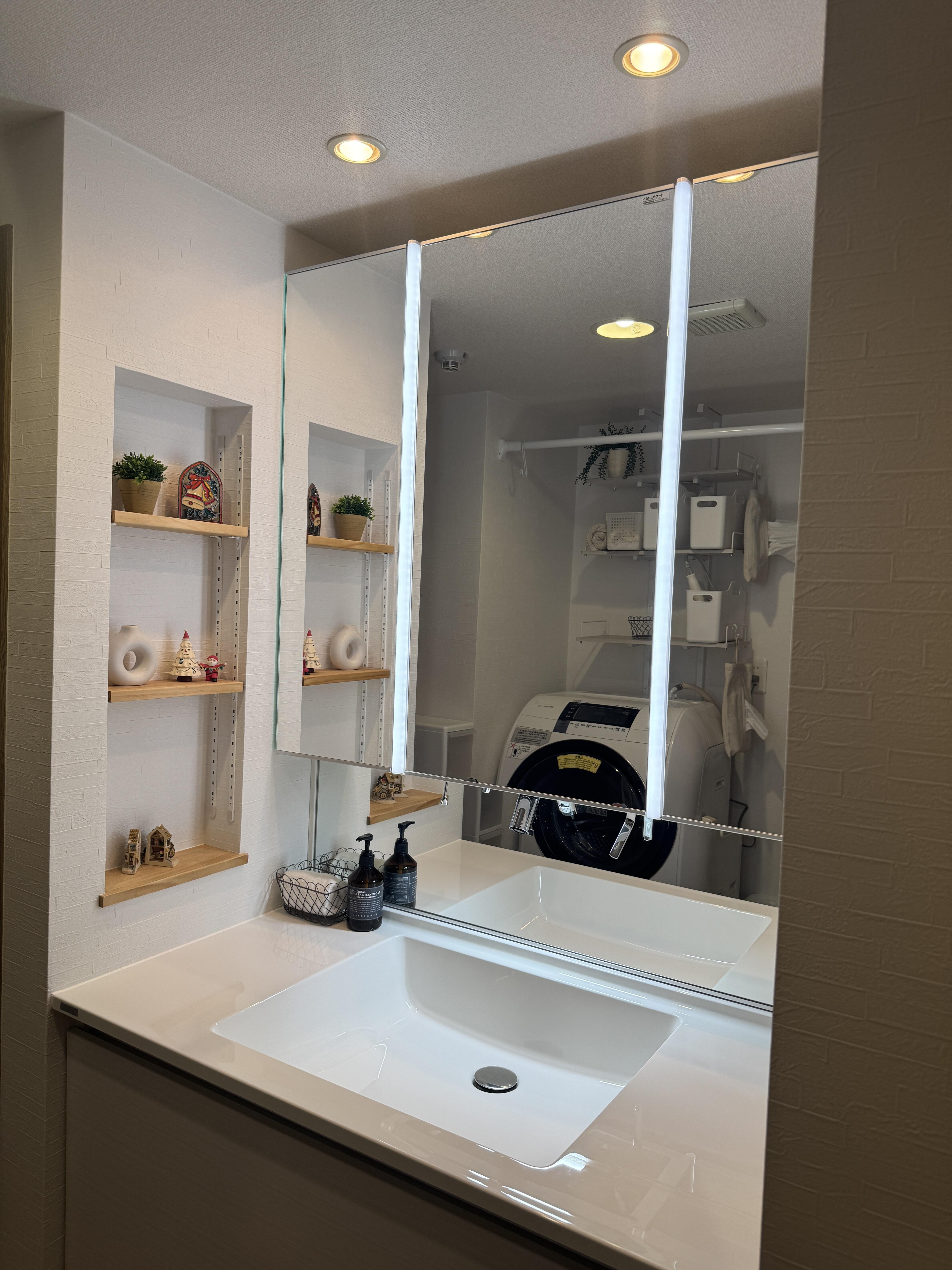 これまでは「洗面所は顔を洗って歯を磨くだけの場所」と思っていましたが、今回のリフォームでその概念が180度変わりました。 とにかくルミシスのライティングが素晴らしく、鏡の前に立つだけで気分がパッと明るくなります。施工前の写真を見ると、以前の洗面台がいかに使い勝手や見た目で妥協していたかがよく分かりますね。 一番のお気に入りは、新しく作ってもらったニッチ収納です。大好きな小物を飾れるようになったことで、朝の忙しい時間帯もふと目が合うたびに心が和みます。 ホテルのお部屋のような高級感がありながらも、家全体のナチュラルな雰囲気にも馴染んでいて、ずっとこの場所にいたくなるほど居心地が良いです。私の「こだわり」を細部まで丁寧に形にしていただき、本当に感謝しています。