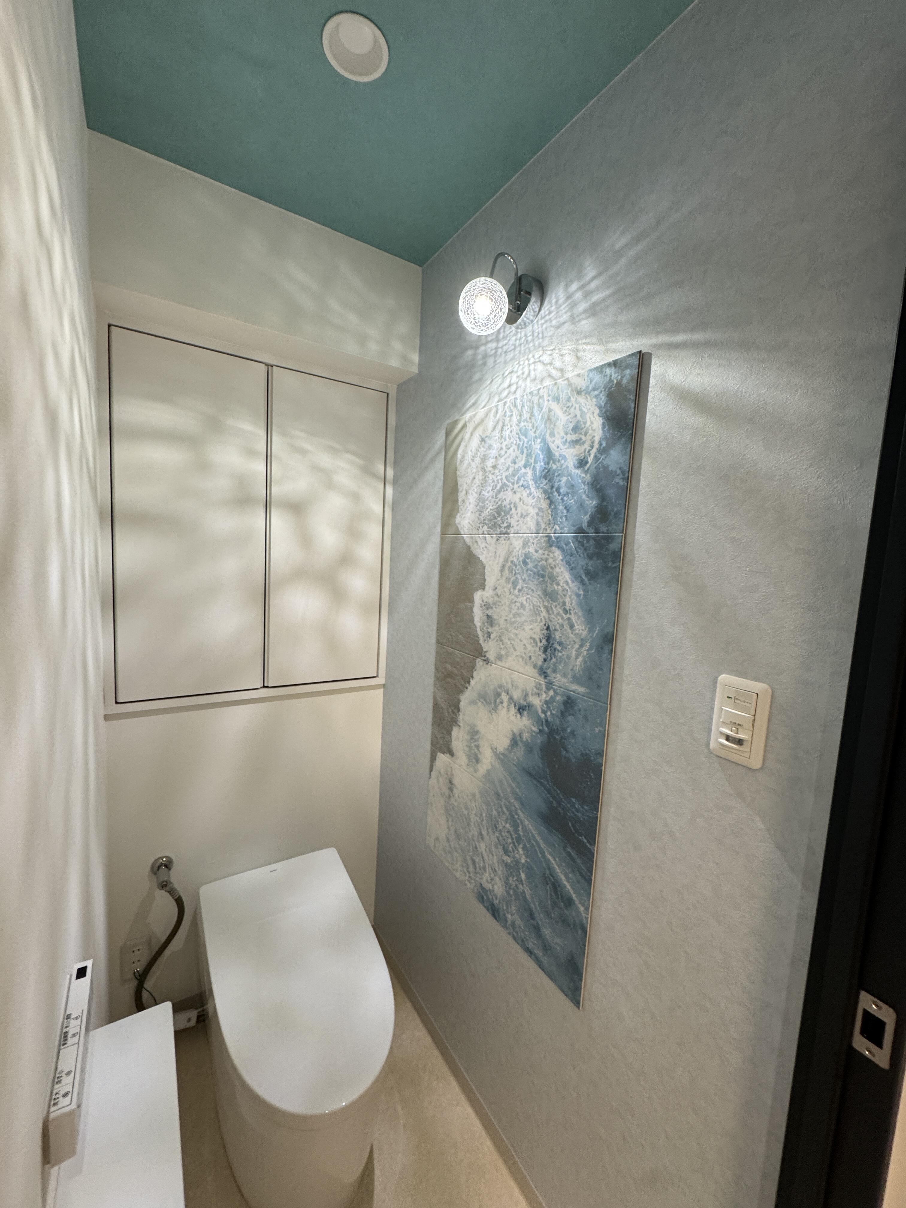 お施主様の「自分らしさを大切にしたい」という想いに寄り添い、単なる壁材としてではなく、空間の主役となるアートとしての配置をご提案しました。 トイレでは、最新のネオレストが持つ美しいフォルムを活かすため、オーデリックの照明による光の陰影が一番美しく出る位置にエコカラットセルフを設置しています。 また寝室では、収納システムとの視覚的バランスを考慮しつつ、睡眠時の湿度調整や消臭といった機能面でも最大の効果を発揮できるレイアウトを意識しました。 パネル形状のエコカラットセルフだからこそできる「余白を活かした贅沢な魅せ方」が、施工前後の写真を見比べるとより際立っています。