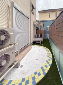 《庭リフォーム》人工芝と琉球ガラスを散りばめたサークルテラスで手間いらずのかわいい庭に☆見て楽しい出て楽しい素敵なお庭です!