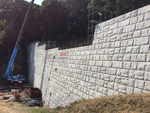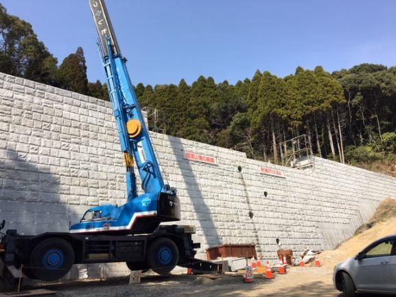 当日の作業は、型枠ブロックをクレーンで上げて、上部で型枠ブロック積み上げる作業です。