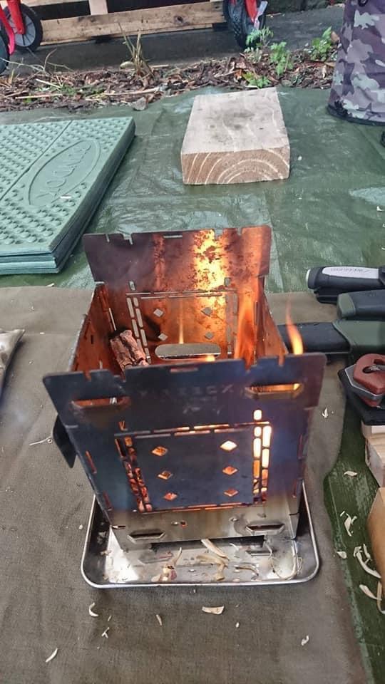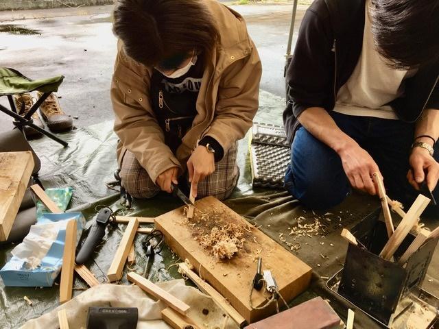 火のついた、フェザーステックを↓の焚火台の中で育てていく工程をやってもらいました(^^)/