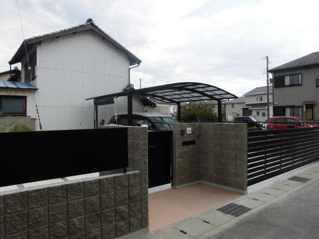 駐車スペース4台分(来客用含む)確保。周辺に住宅が増えてきたので防犯対策として、外から見えにくいように目隠しも踏まえたゲートを設置。