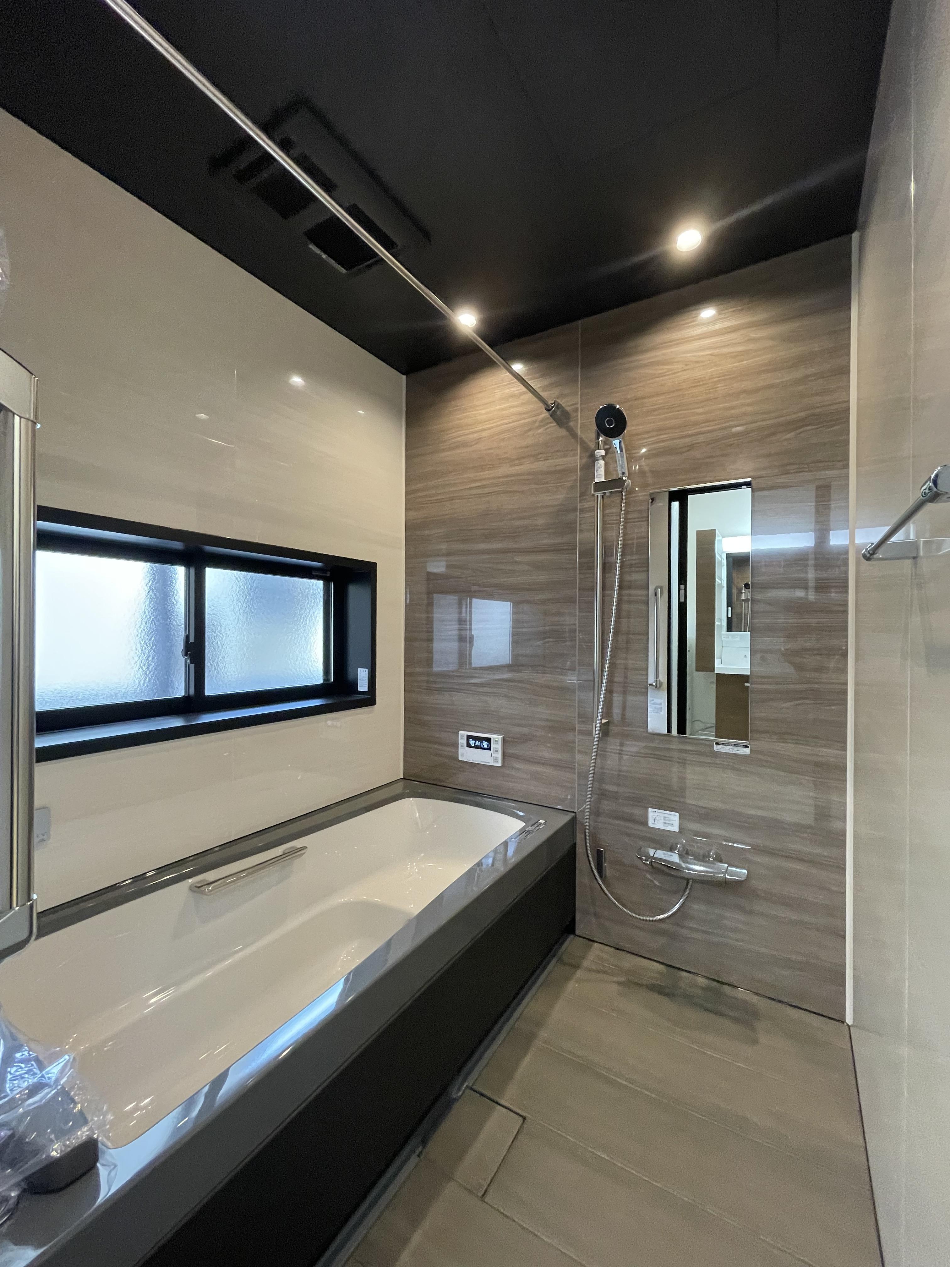 お施主様がブラックベースの モダンなバスタブやパネルを選ばれたので ホテルライクな浴室になりましたね!!