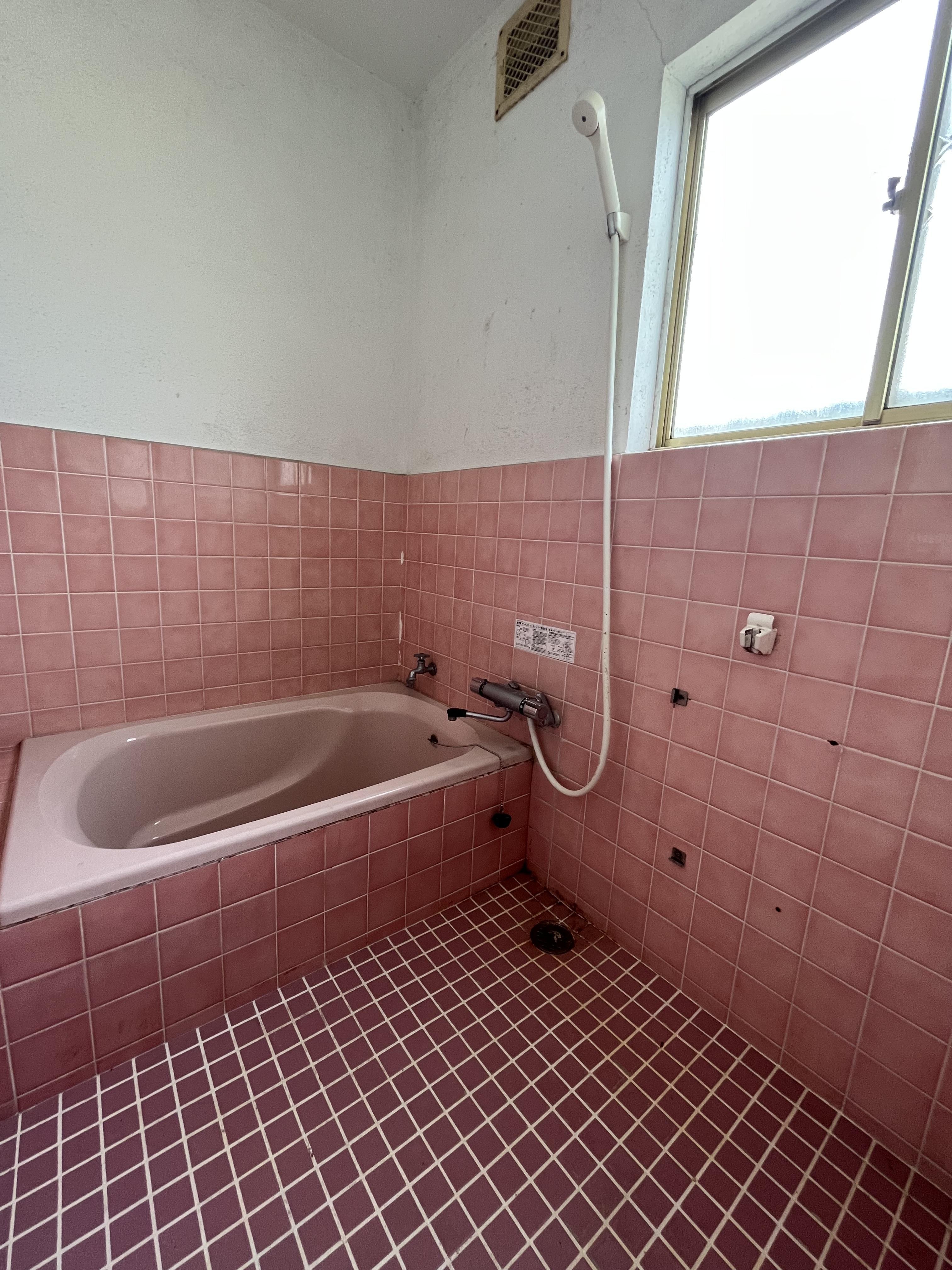 昭和のお風呂の定番のタイル!! ピンクはよくありますが、 こちらはなかなか濃いめのピンクー^^;;