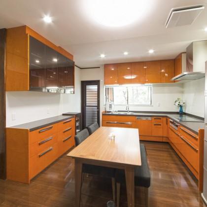 鮮やかなオレンジ色のコの字型キッチンで、お料理もはかどります。