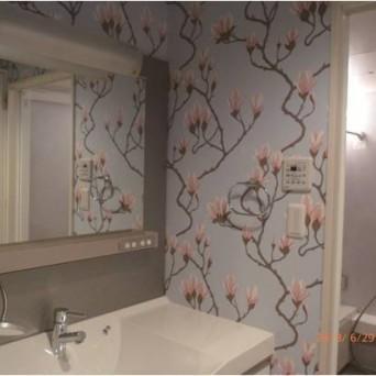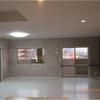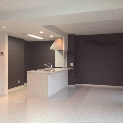 マンションの内装リフォーム。輸入物のクロスを張ったり、和室の壁を撤去して、広々としたLDKにしたりと、若いご夫婦のこだわりがたくさん詰まったリフォームです。LDKの一角に6帖の和室がありましたが、広いLDKにしたいというご夫婦のご希望により、壁を撤去して、ワンフロアにしました。床は、大理石調のフローリングにし、クロスは、コンクリート仕上げの柄と、アクセントにブラックのクロスを合わせてシンプルモダンにコーディネートしました。