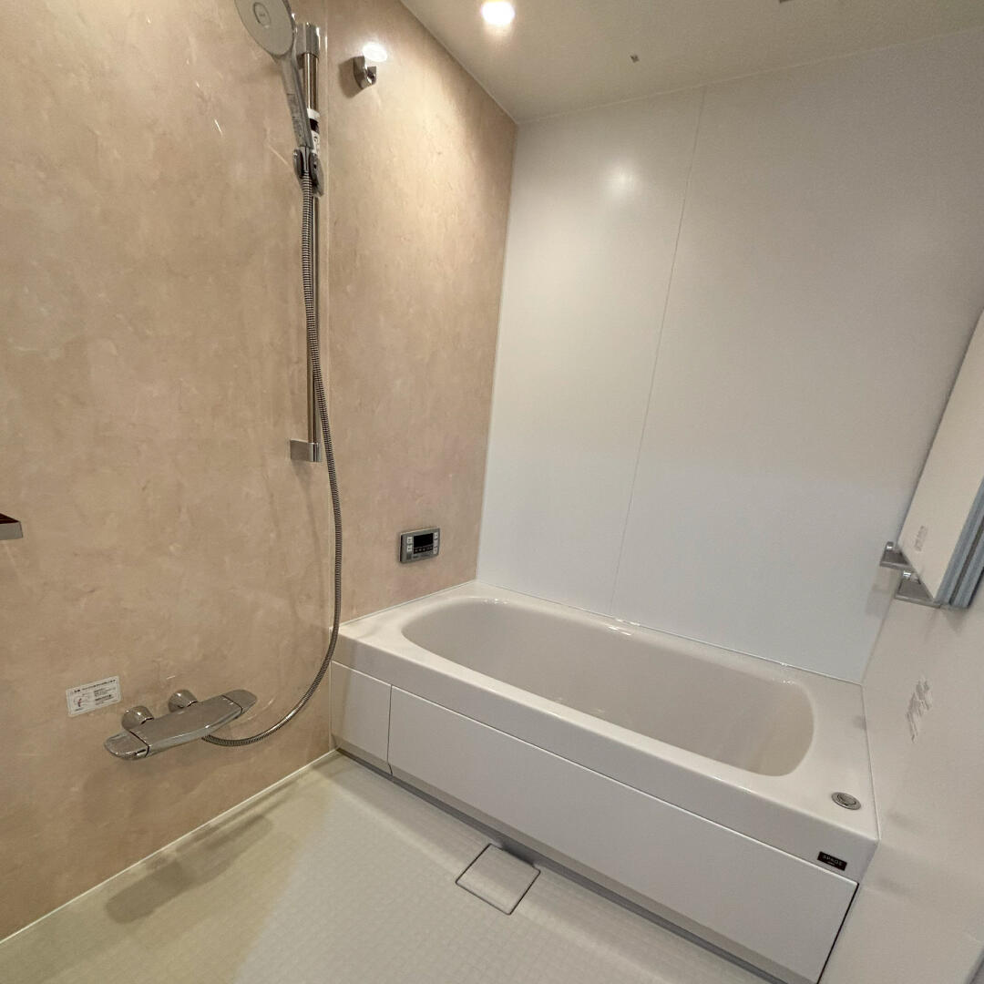セラミックパネルの壁と、人造大理石の浴槽。