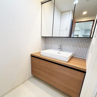 奥様がチョイスしたタイル(LIXIL シャインリーフ)がアクセントになり、上品さの中にかわいさがプラスされています。