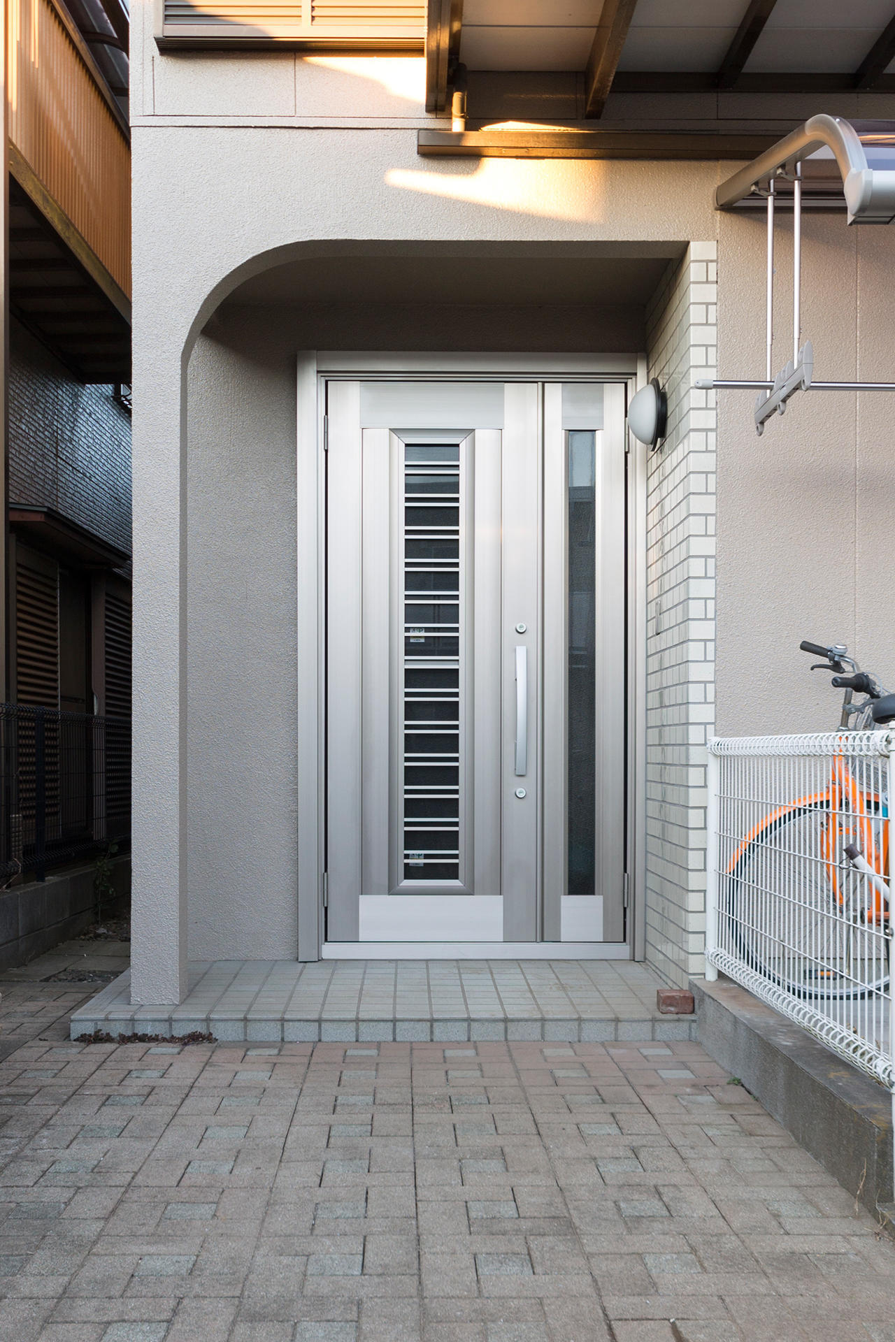 外装の塗装に伴いカバー工法で玄関を新しく交換いたしました。扉はリシェントの通風タイプ。