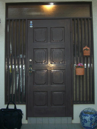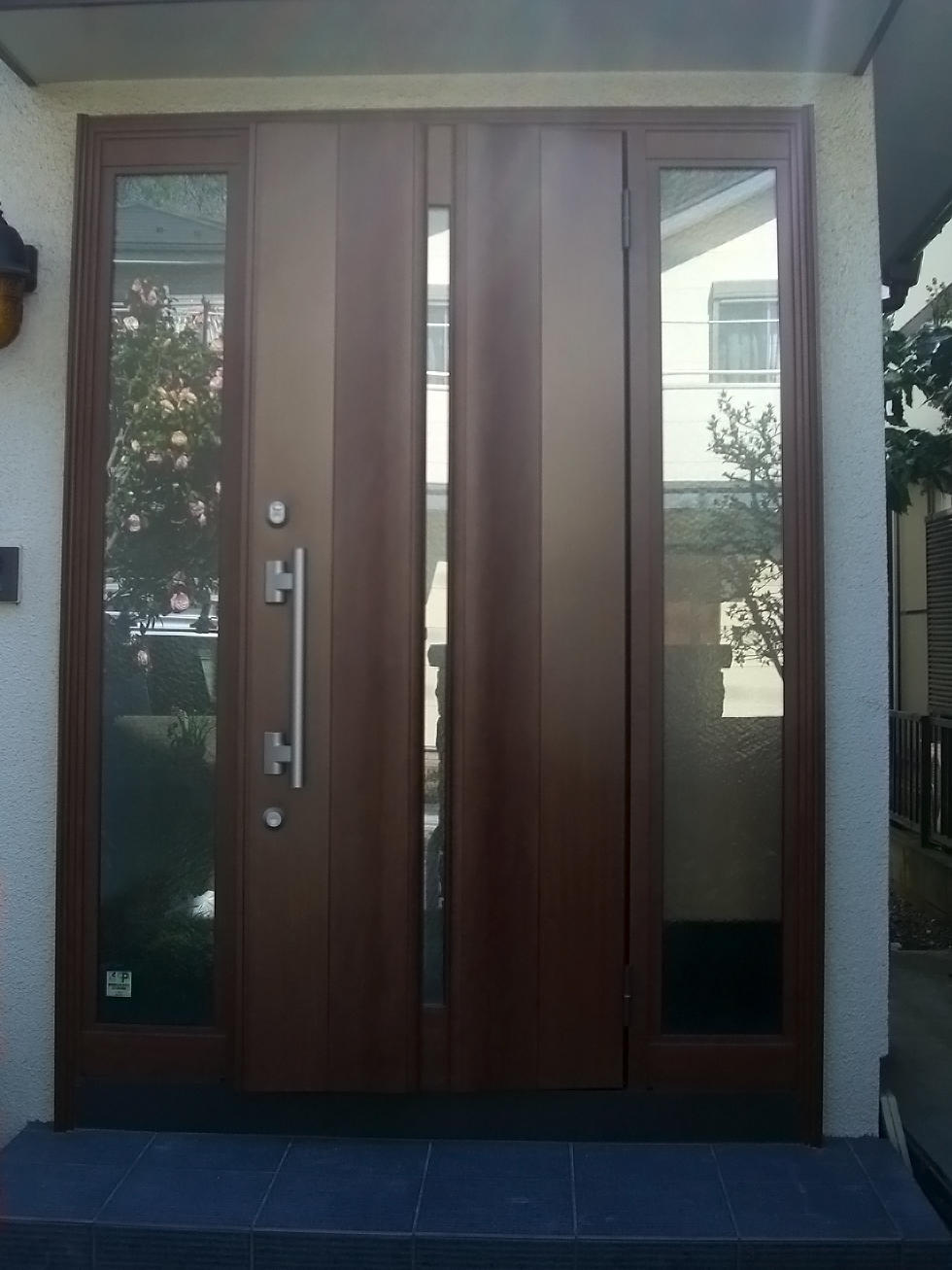 木目張り玄関で暗く重くなりがちだが、両袖FIXにして玄関ホールへの採光・明るさに配慮。 ガラス面が大きいが防犯ガラスにすることで防犯対策にも配慮いたしました。ポーチの部分も300角のタイルで一新し見違える様になりました。