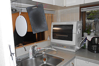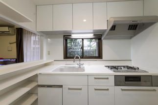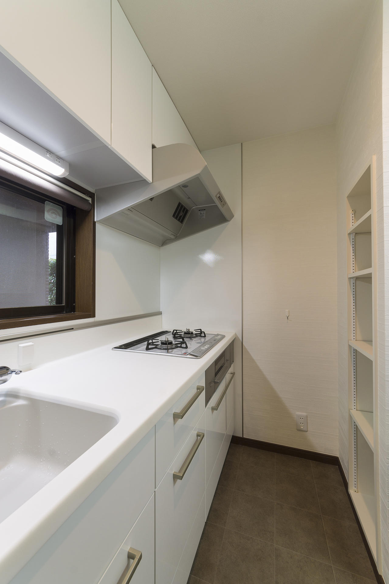 人工大理石の天板・キャビネット・収納棚を白で統一しました。ワークスペースも広くしたので、今までより広く明るくなりました。