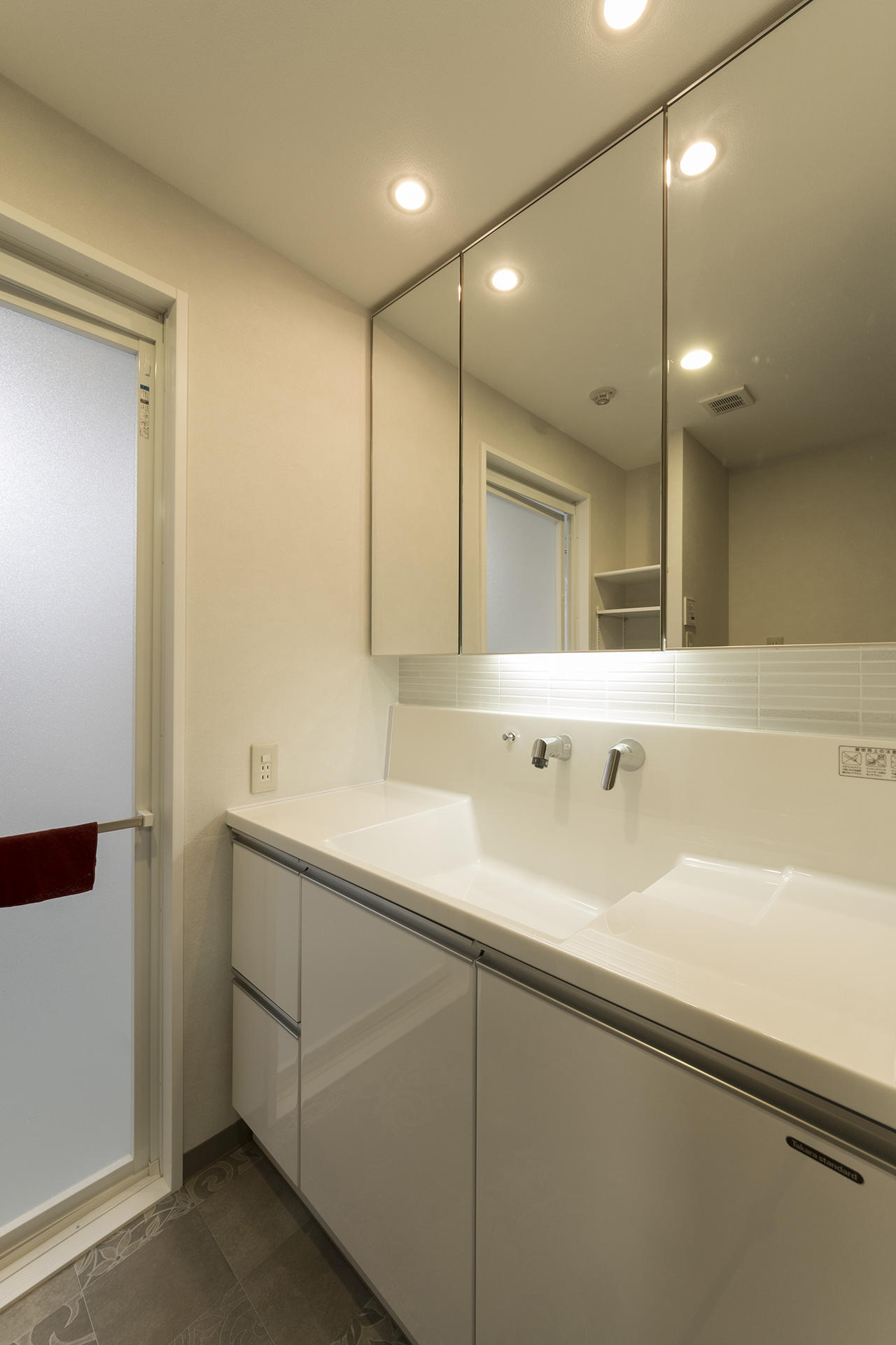 洗面化粧台はハイバックカウンターですっきりとしたデザイン、既存の鏡との間をお洒落なタイルでつなぎました。
