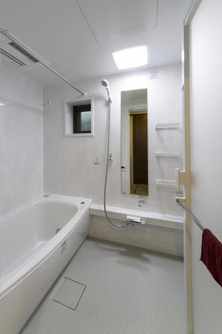ひろびろとした明るい浴槽、洗面室からの床もバリアフリーにしました。