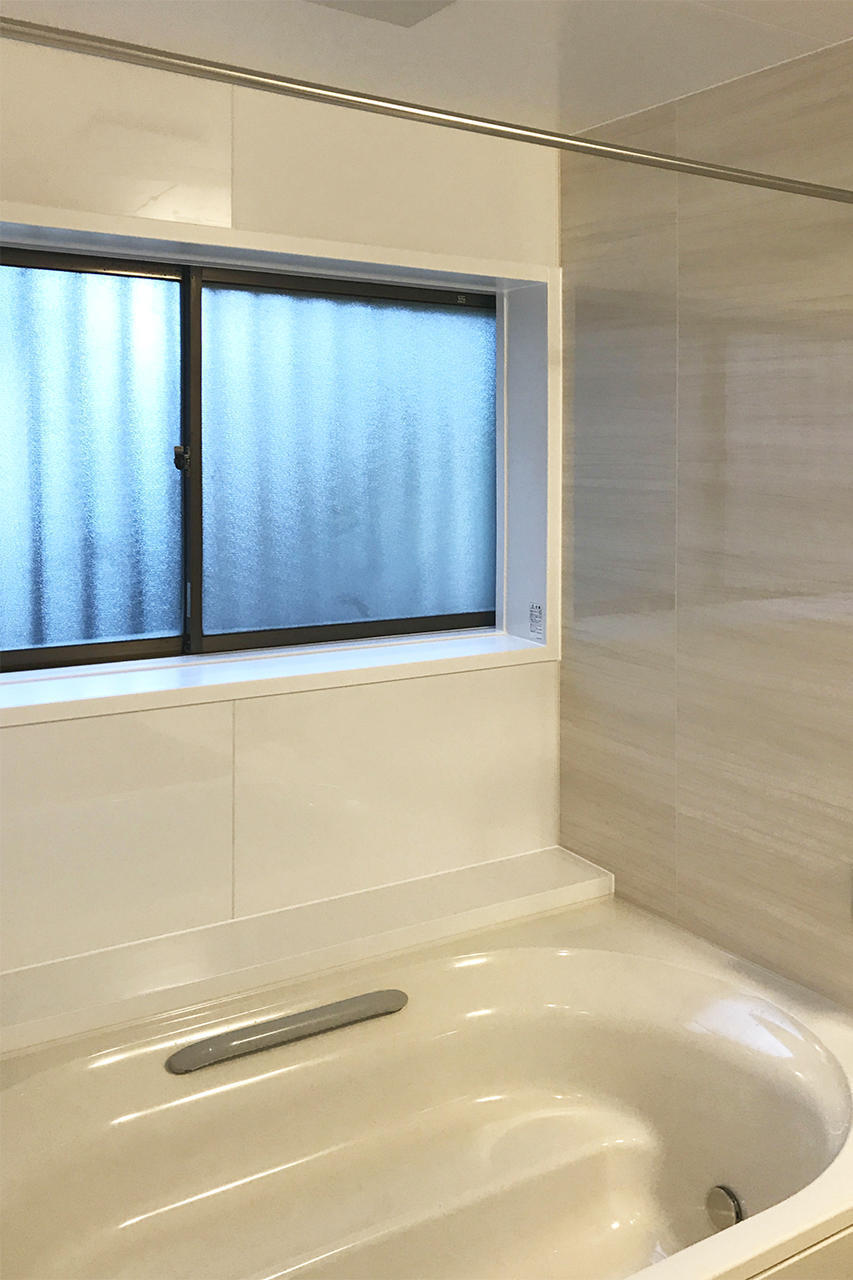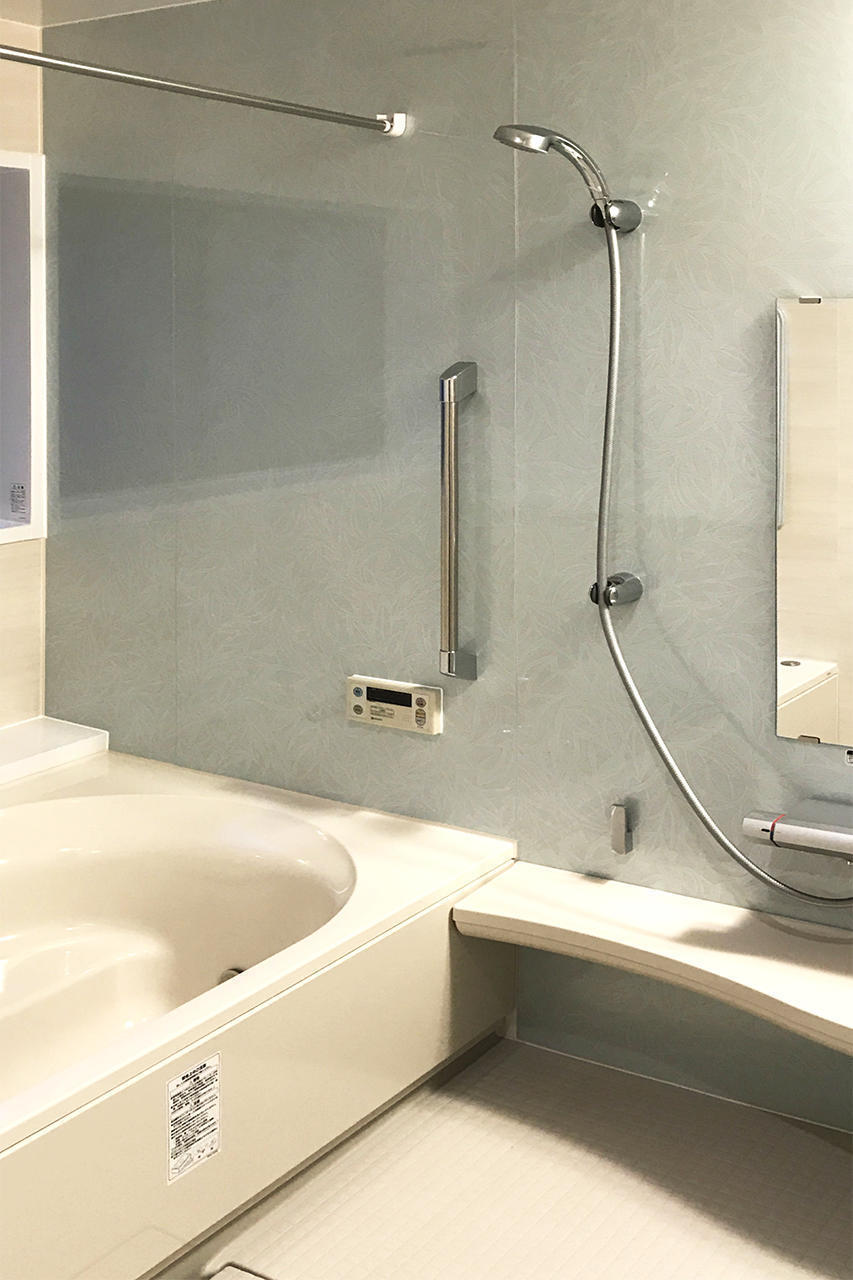 浴室が1624サイズ(1.5坪相当)と広いので、横方向にゆったり座れるベンチ付きのワイド浴槽を入れることができました。お孫さんとのお風呂タイムが楽しくなりますね。「握りバー」も付けて、安心です。