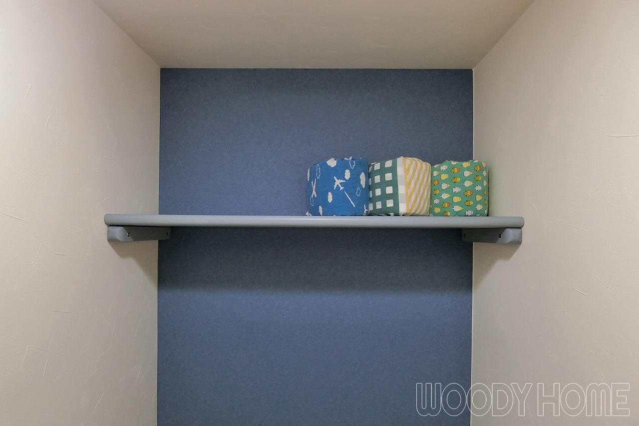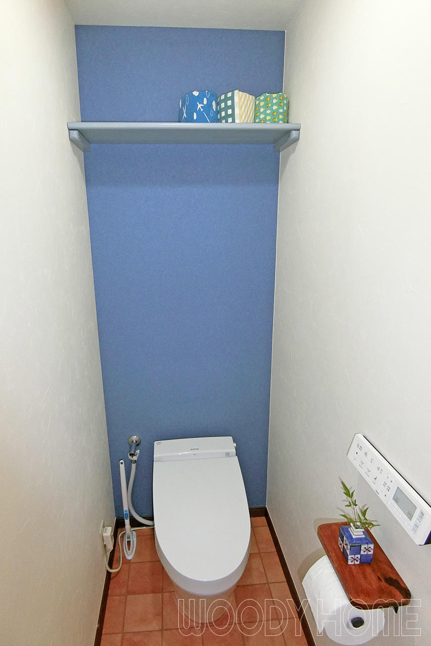タンク式のトイレはシャワーのボタンも便座脇でした。タンクレスで便器が以前より奥に収まったことで扉と便器の間のスペースが広くなり、吊り戸を外して棚を一段としたので圧迫感が無くなり、窮屈ではない座り心地が良いトイレルームになりました。便器と同色だった紙巻器は小さな木製の棚に、奥の壁一面のクロスをアクセントでブルーとしてちょっとお洒落感もアップ。