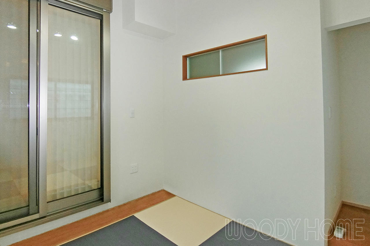 市松に貼った色違いの畳と、格子入りインプラス(内窓)の向こうに見えるガラスブロックで和モダンなお部屋に仕上がりになりました。仏壇が置ける床の間も設けました。