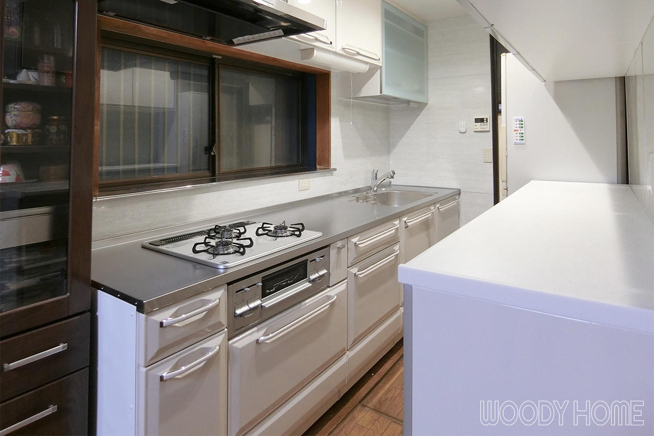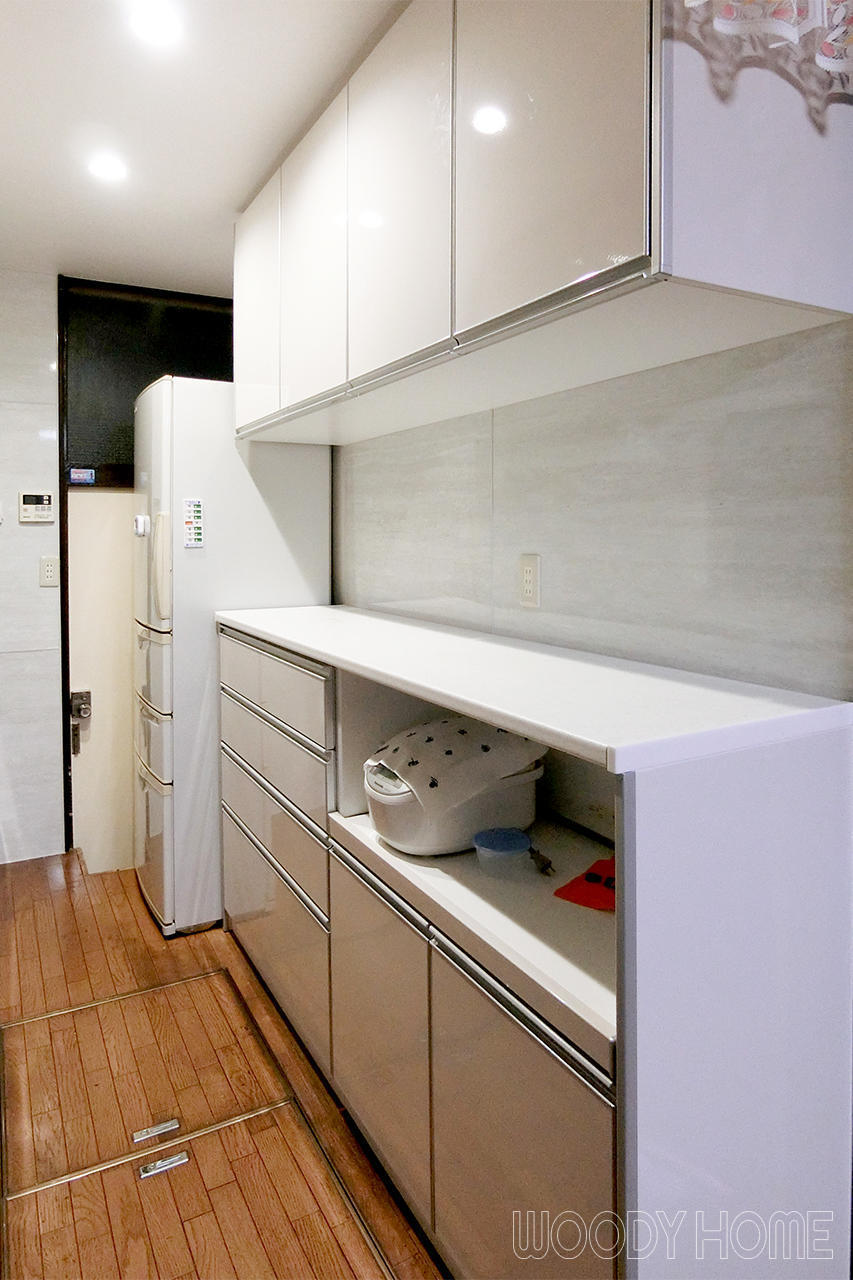 食洗器は不要だが食器乾燥機は欲しいというご要望から電動昇降吊戸棚を設置。シンクの真上にあるので、洗った食器をすぐに入れて乾燥できるので使い勝手が抜群に良くなりました。