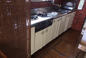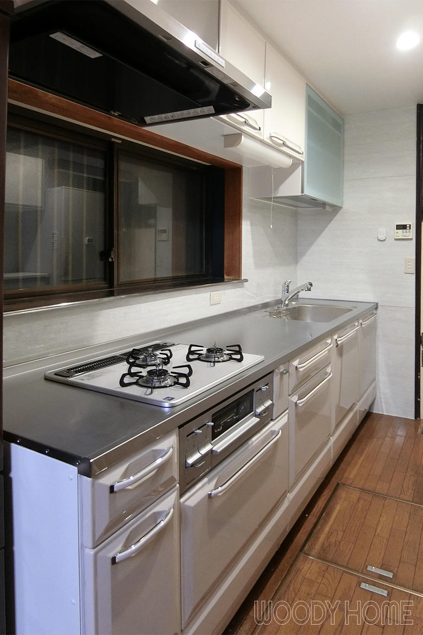 レンジフードは以前のものより幅広にし(W900)、ガスコンロと連動しているのでより安全に使えます。吊り戸との高さを揃えたので見た目もスッキリしています。ガスコンロはガラスコートトップなので美しくまた、汚れも付きにくい優れもの。グリル調理用プレート対応で料理の幅も広がりますね。