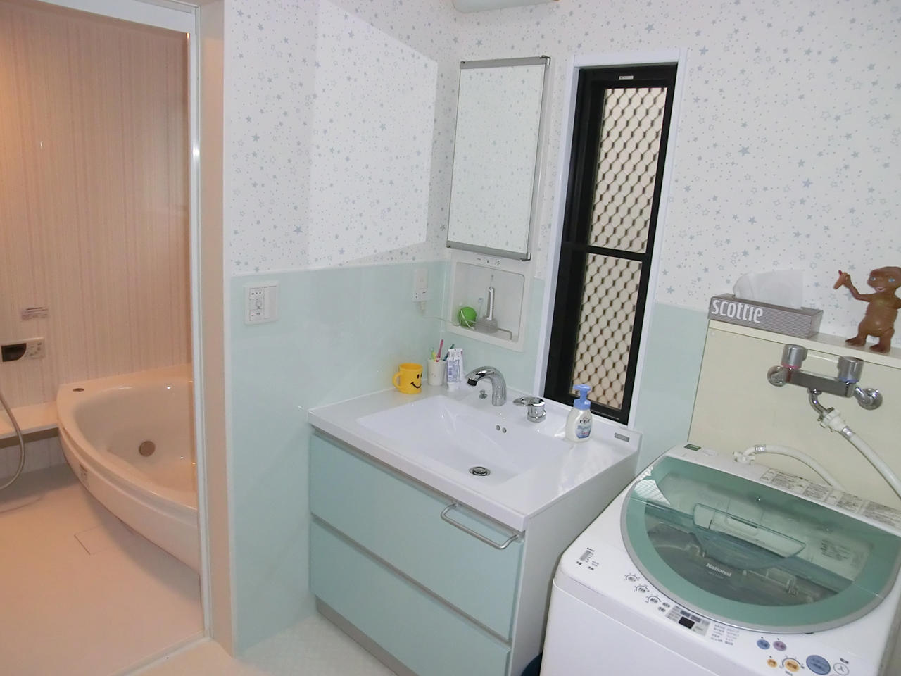 工事はまずお風呂の解体、洗面室の解体から行いました。窓や外部の換気扇などが終わってから屋根の重ね葺き、外壁の塗装という順番で施工しました。洗面室のクロスや洗面台の色などお客様のこだわりが仕上がりを可愛くしていくエッセンスとなり柔らかいイメージに仕上がりました。