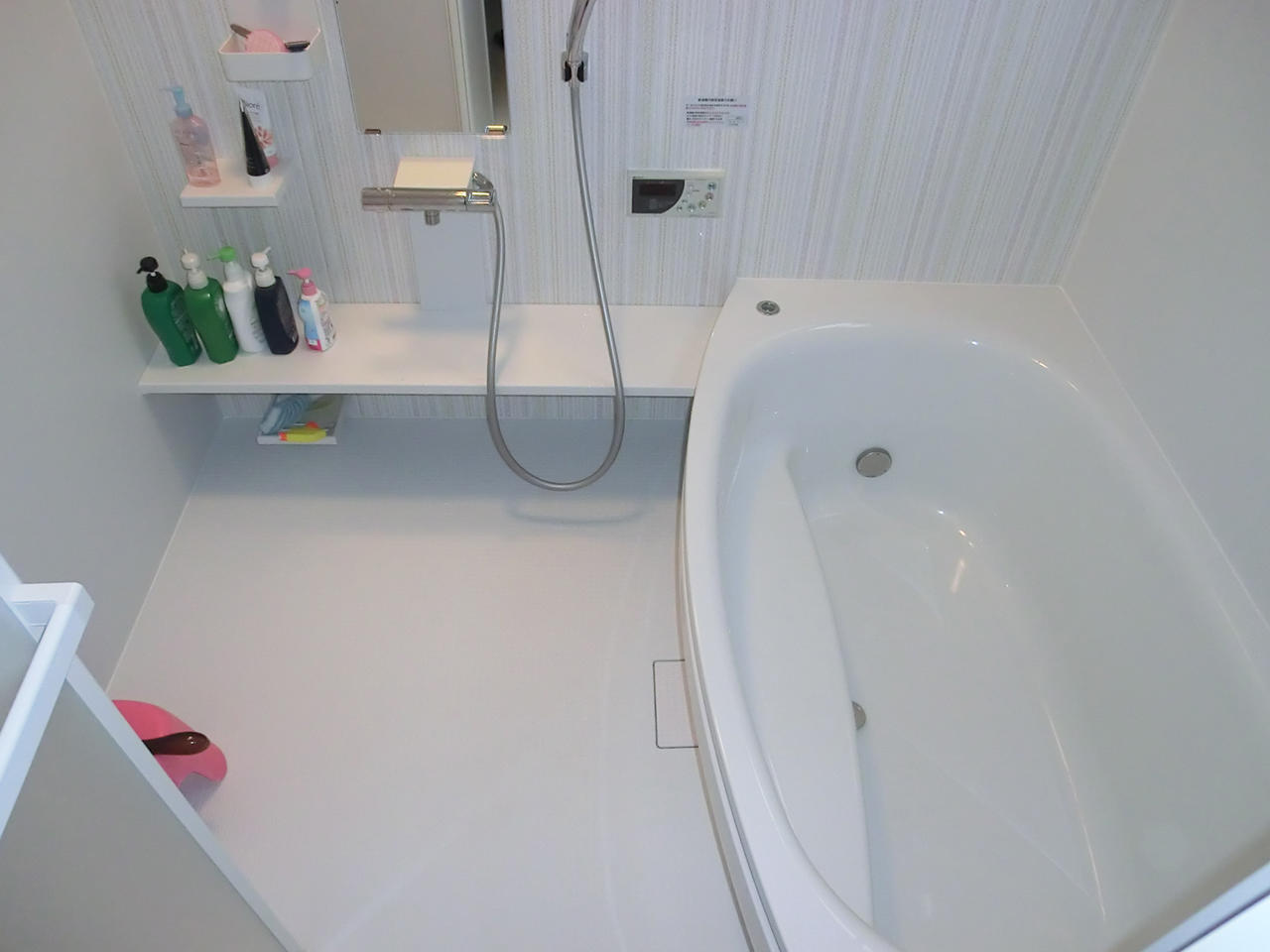 浴槽の長手方向は壁から壁で1.2m、浴槽は膝を抱えてはいるようなちょっと窮屈な浴槽なのに、洗い場は割と広い既存のユニットバスでした。大手メーカーさんの専用モデルのため通常のユニットバスは入りません。ぴったりのサイズで作るか、洗面室側へ壁を移動して広くするかの2通りの提案をしました。 あまり値段が変わらなかったので、もともとのご要望だった広くなるほうのユニットバスを選びました。今回はメーカーさんにお友達が務めているとのことでTOTOさんのスプリノを選択。浴槽も広々としていて脚も伸ばせては入れます。スプリノは洗い場床が畳のような柔らかさが特徴です。
