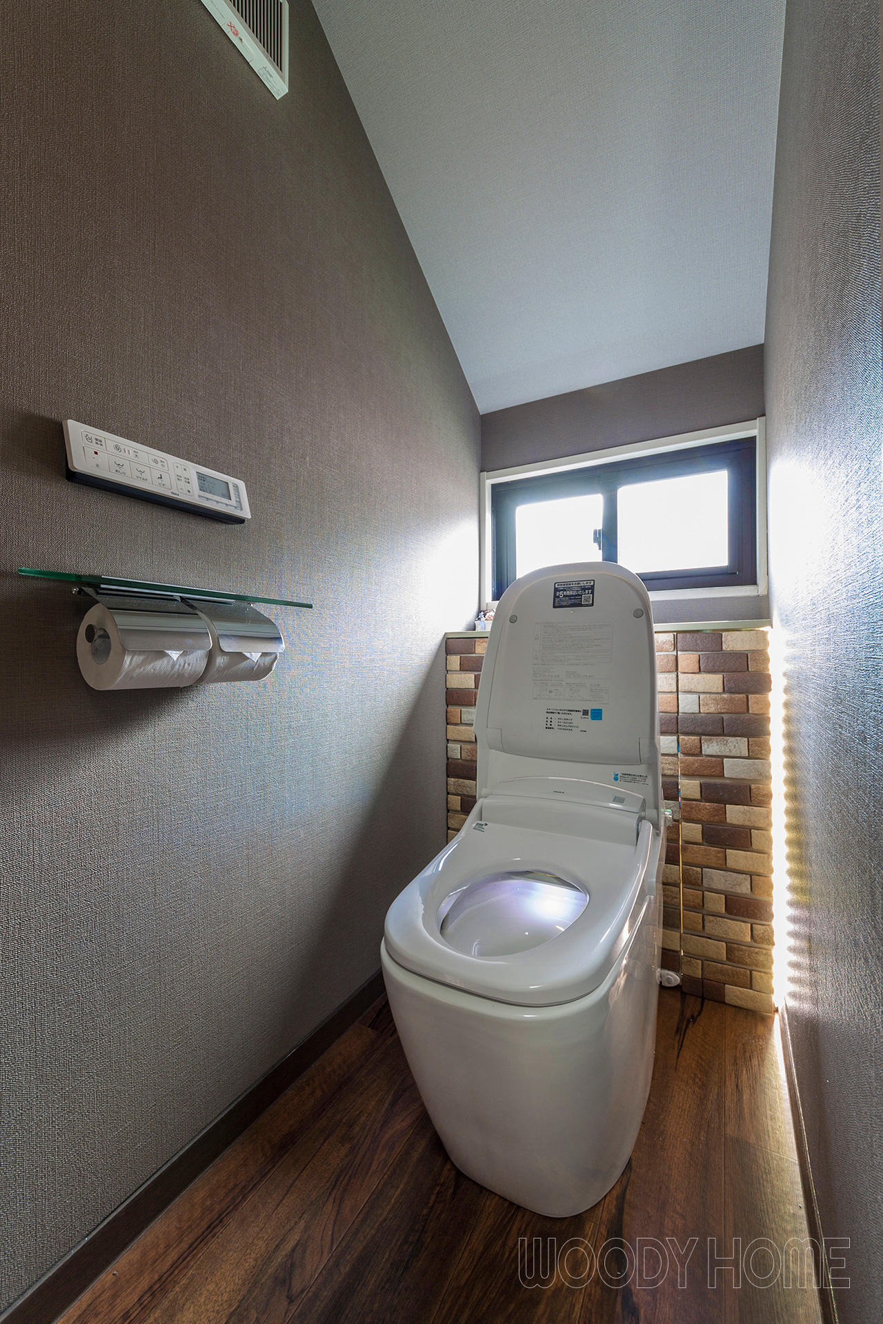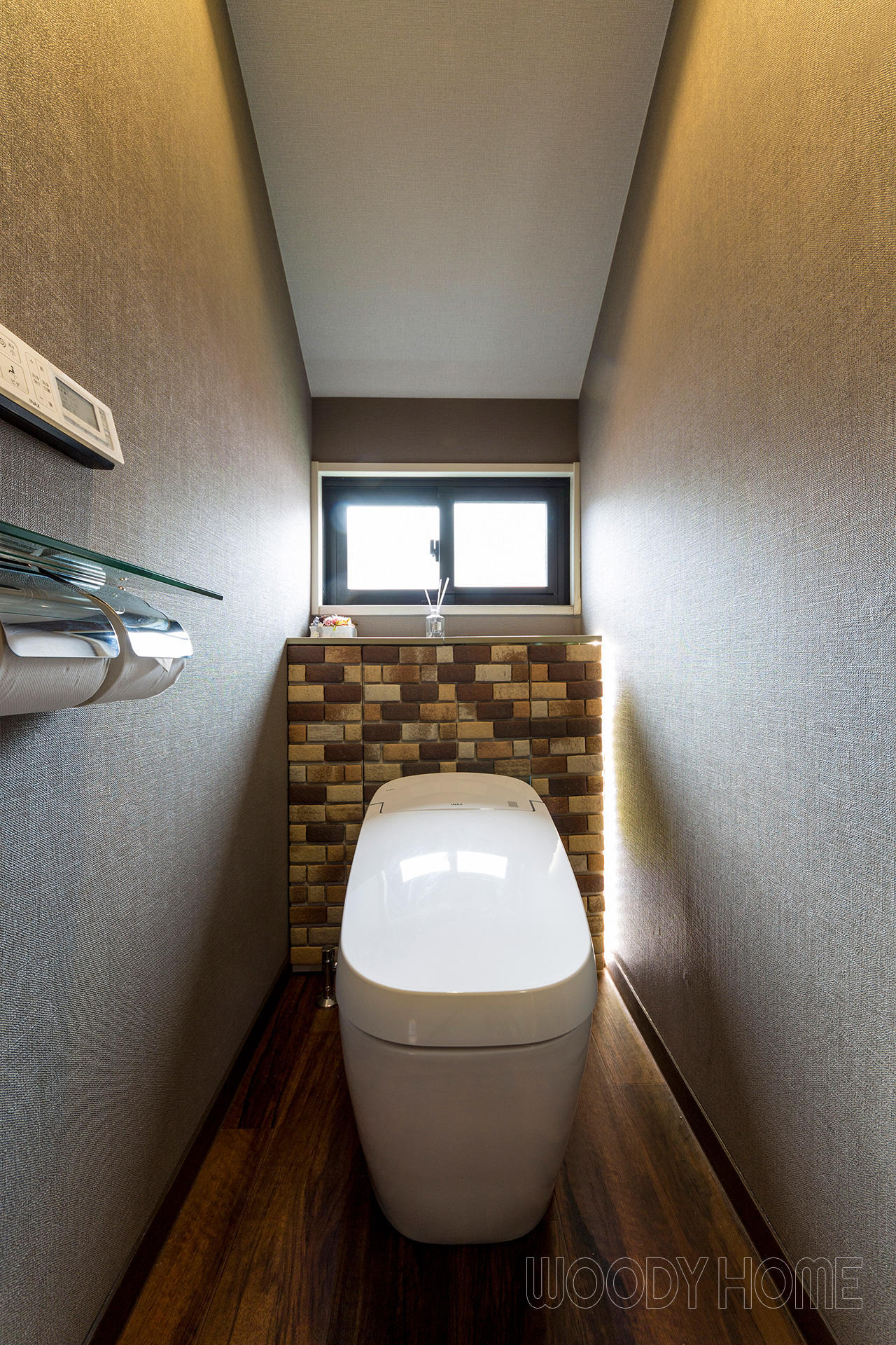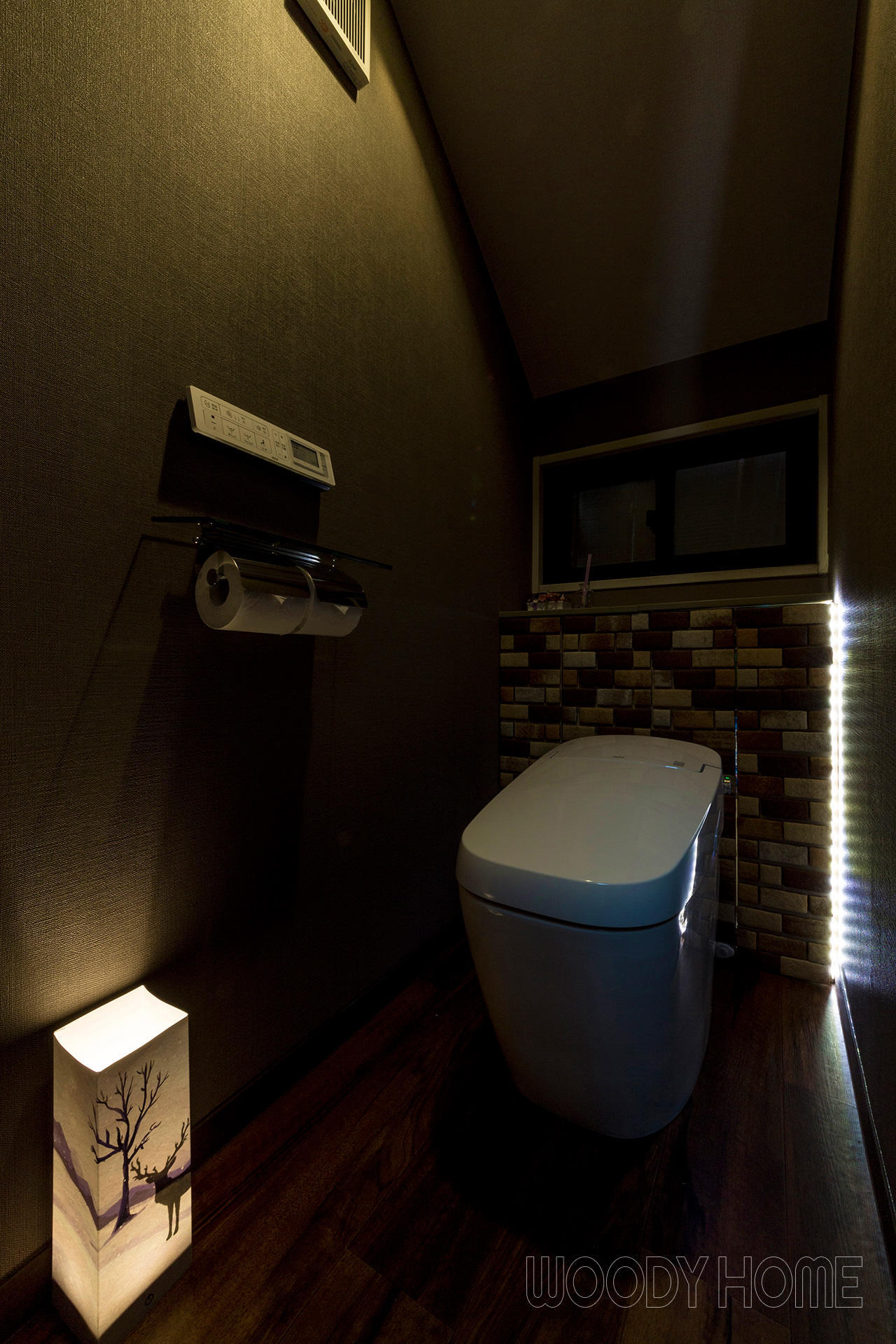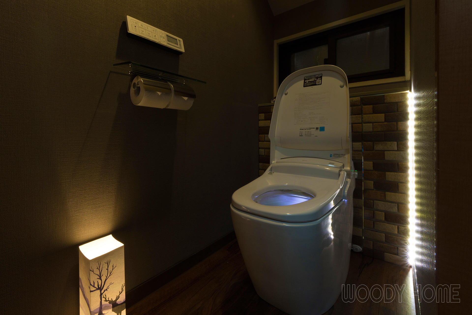 「カフェのトイレ」の様にするには内装にもこだわりました。壁のクロスは織物調のグレー・ブラウンのクロスに、床は清掃性からクッションフロアにしていますがシックな木目調のものを選んでいます。間接照明にもこだわりました。夜中はトイレの明かりで眠気を邪魔しないよう、主照明を点けず身体と頭が起ききらない様に人感センサーで淡い光が溢れる仕組みとしました。
