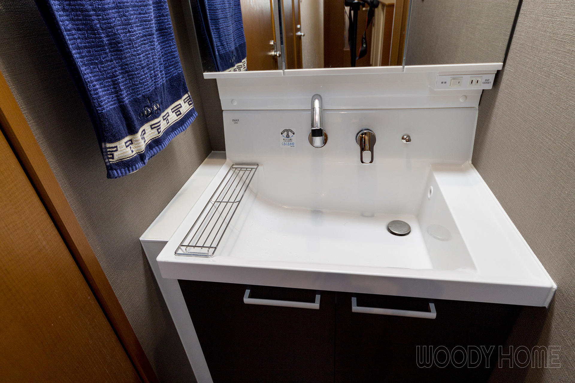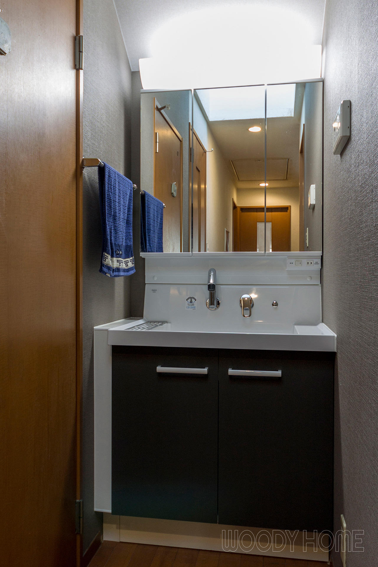 洗面化粧台の幅が廊下に合わなかったので、隙間になる左側には水に強いパネルで隙間を埋め小物置き場にしました。ちょうどタオル掛け分の幅でタオルを使う時も、三面鏡使用時も邪魔になりません。ちょっとしたコンタクトレンズなども置けてとても便利です。