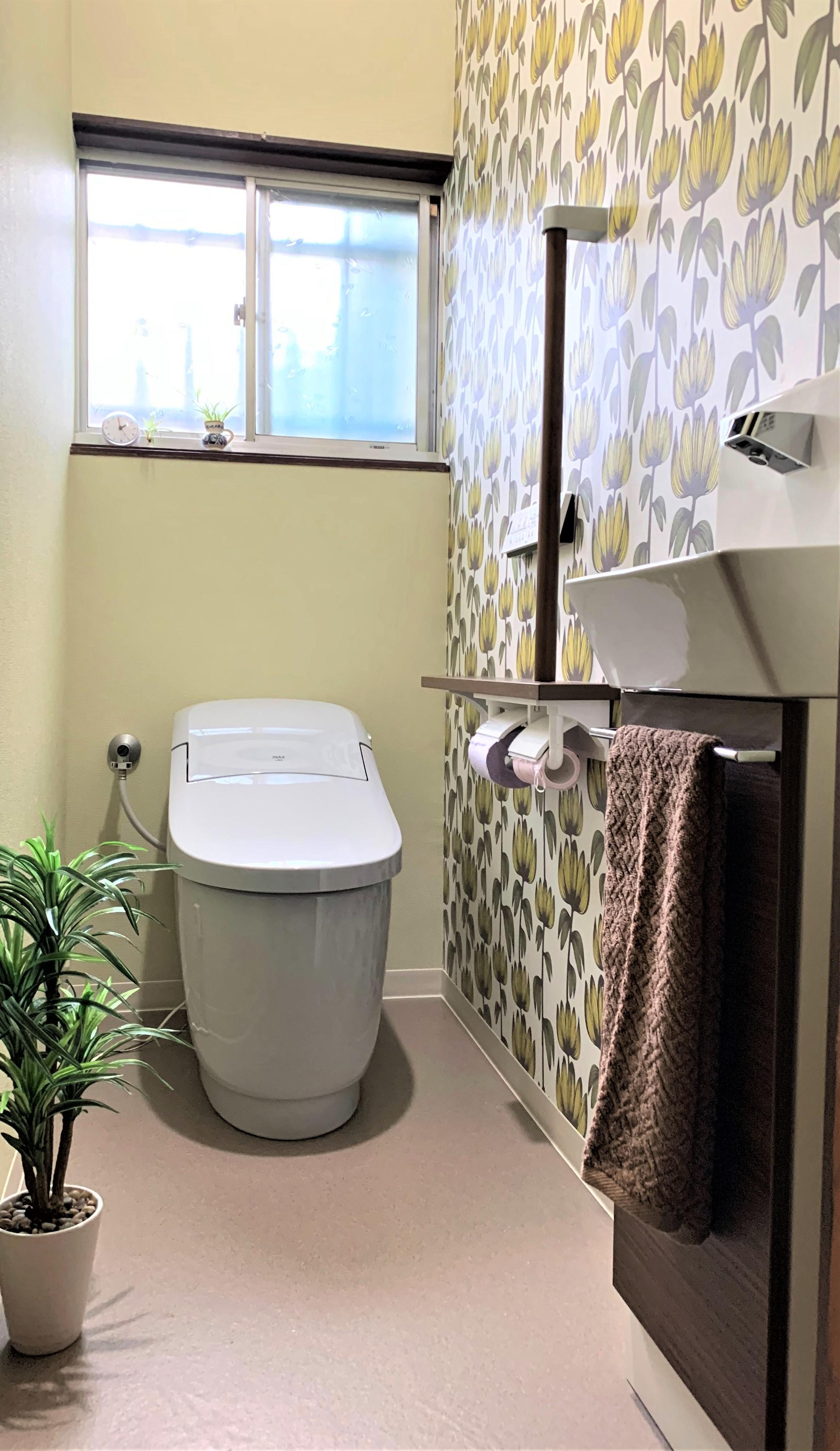 トイレは壁と床を一度壊し作り直してガーデニングのお好きな奥様のご要望でグリーンベースの素敵なトイレに変わりました。トイレの手洗いも自動水栓になりお手入れ、衛生面も増しました。