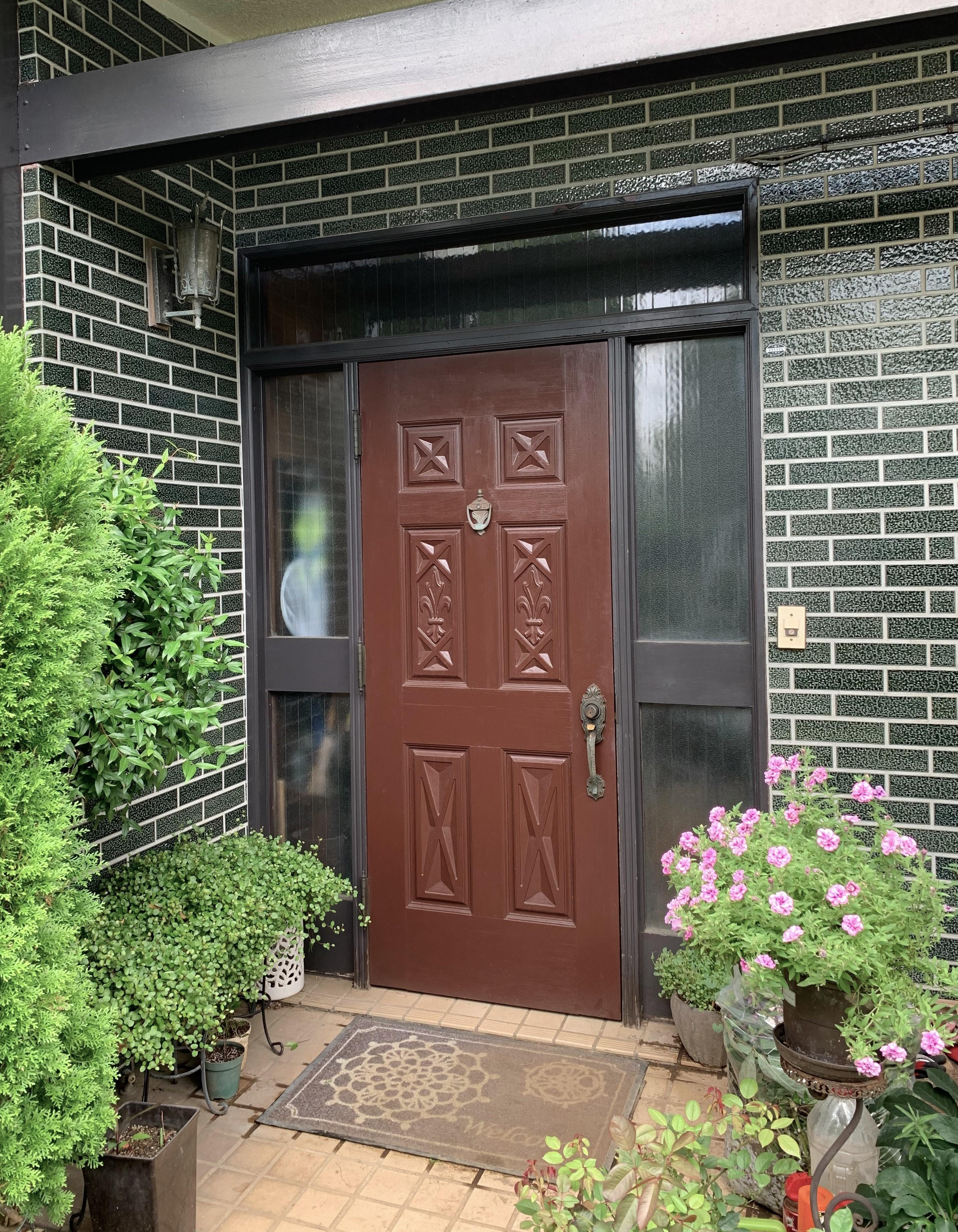 思い出が深い玄関も以前と同じような木目調の玄関ドアになり奥様のガーデニングが映える玄関回りになり素敵になりました。喜んで頂き光栄です。
