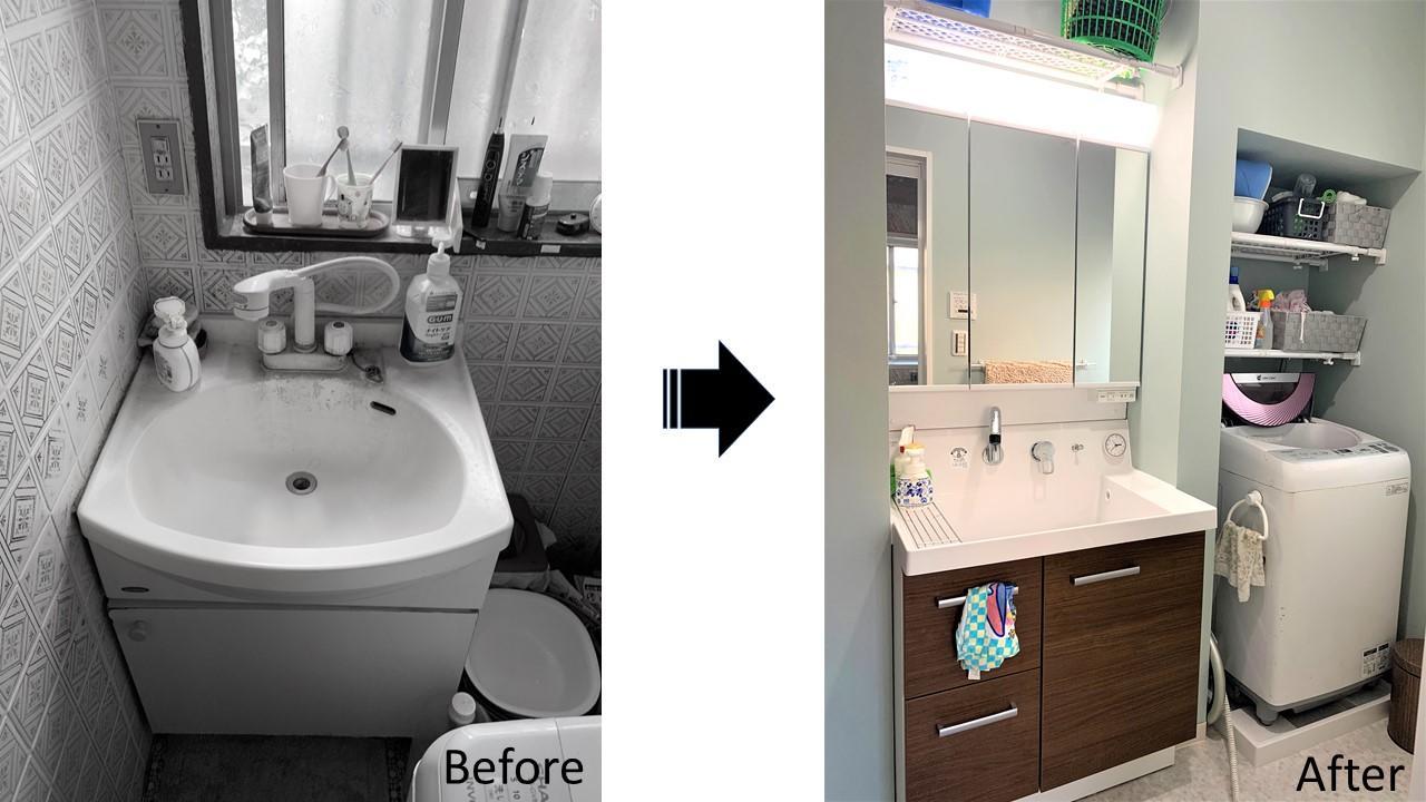 洗面と洗濯機が隣合わせで脱衣のスペースに困っていました。思い切って、横にある和室の一部をもらって洗面室の空間を広げました。収納スペースも生まれ、窮屈だった洗面室は快適な空間になりました。2世帯の朝の忙しい時間もこれで解決です!隣にあるタイル張りの浴室もユニットバスにして温かな空間になりました。腐ってしまっていた土台も交換し、家の耐震性も安心になりました。浴室暖房乾燥機は冬はヒートショック対策(温度のバリアフリー)にも夏にも涼風で快適!一年中活躍する家族みんなの味方のアイテムです。