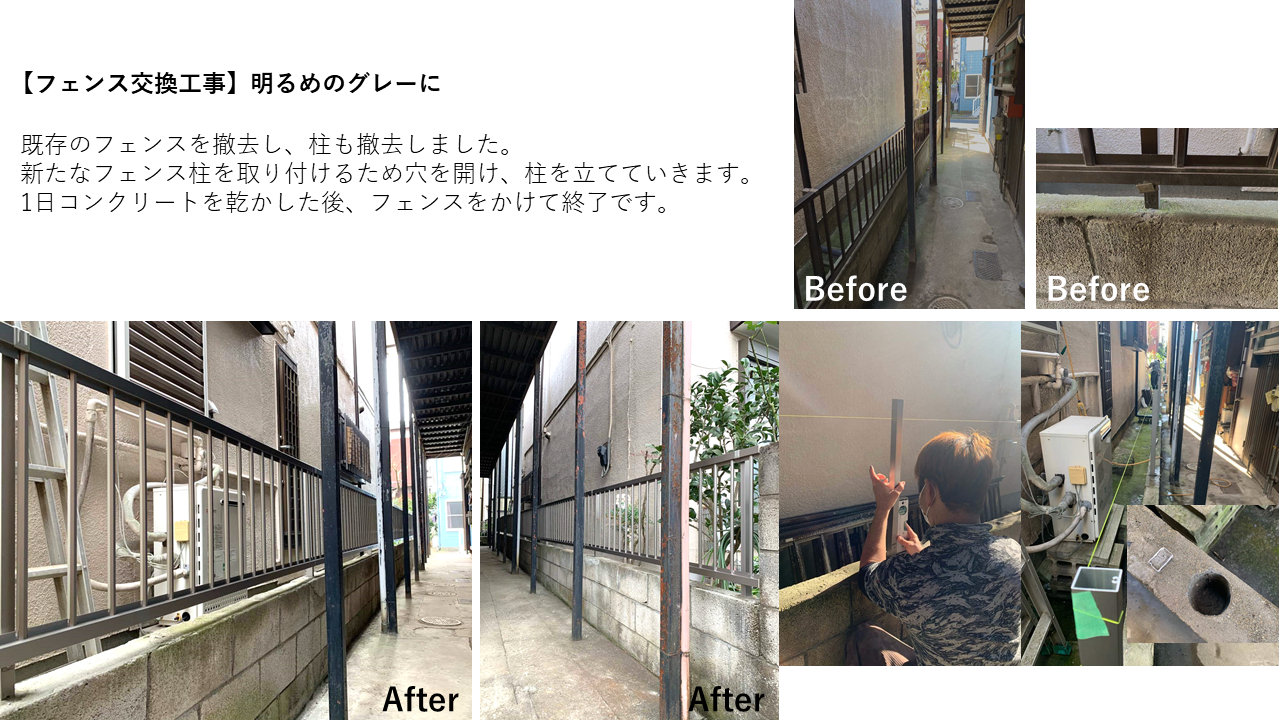 台風でフェンスが痛んでしまったので、今回交換になりました。以前より明るい色柄を選択し明るいフェンスになりました。火災保険の手続きの為の必要書類は弊社でご用意させていただきます。