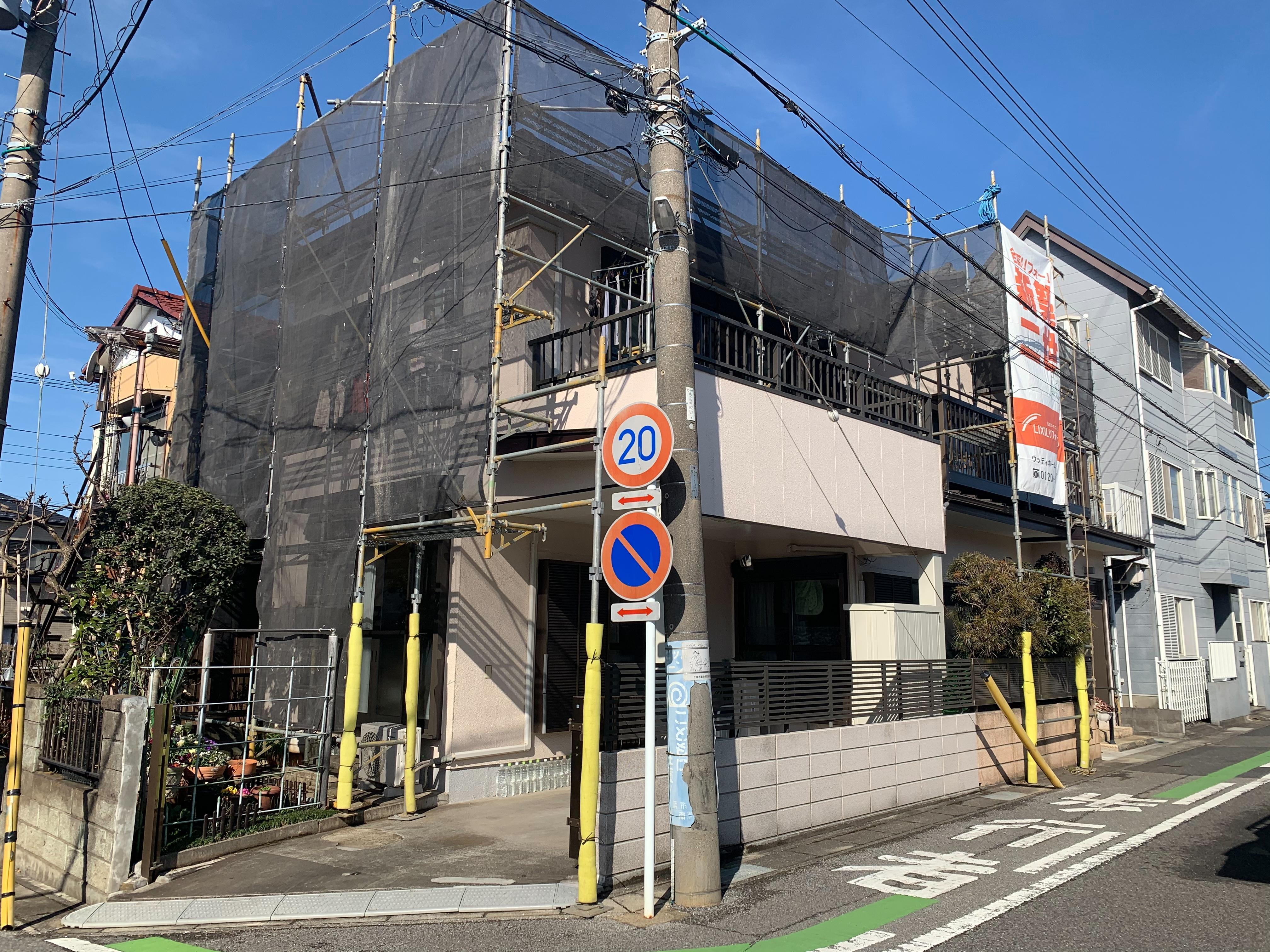 今回の足場は屋根補修のための足場です。大がかりなようですが、作業の効率と安全。万が一何か落ちてしまった際のご近隣様への配慮の為設置しました。電線から足場近くのにかけての黄色い棒は「防護管」といい、放電・感電防止の物です。金属製の足場を伝っての感電を防ぎます。お客様を守る意味でもとても大切な工事で、法律でも義務化されています。