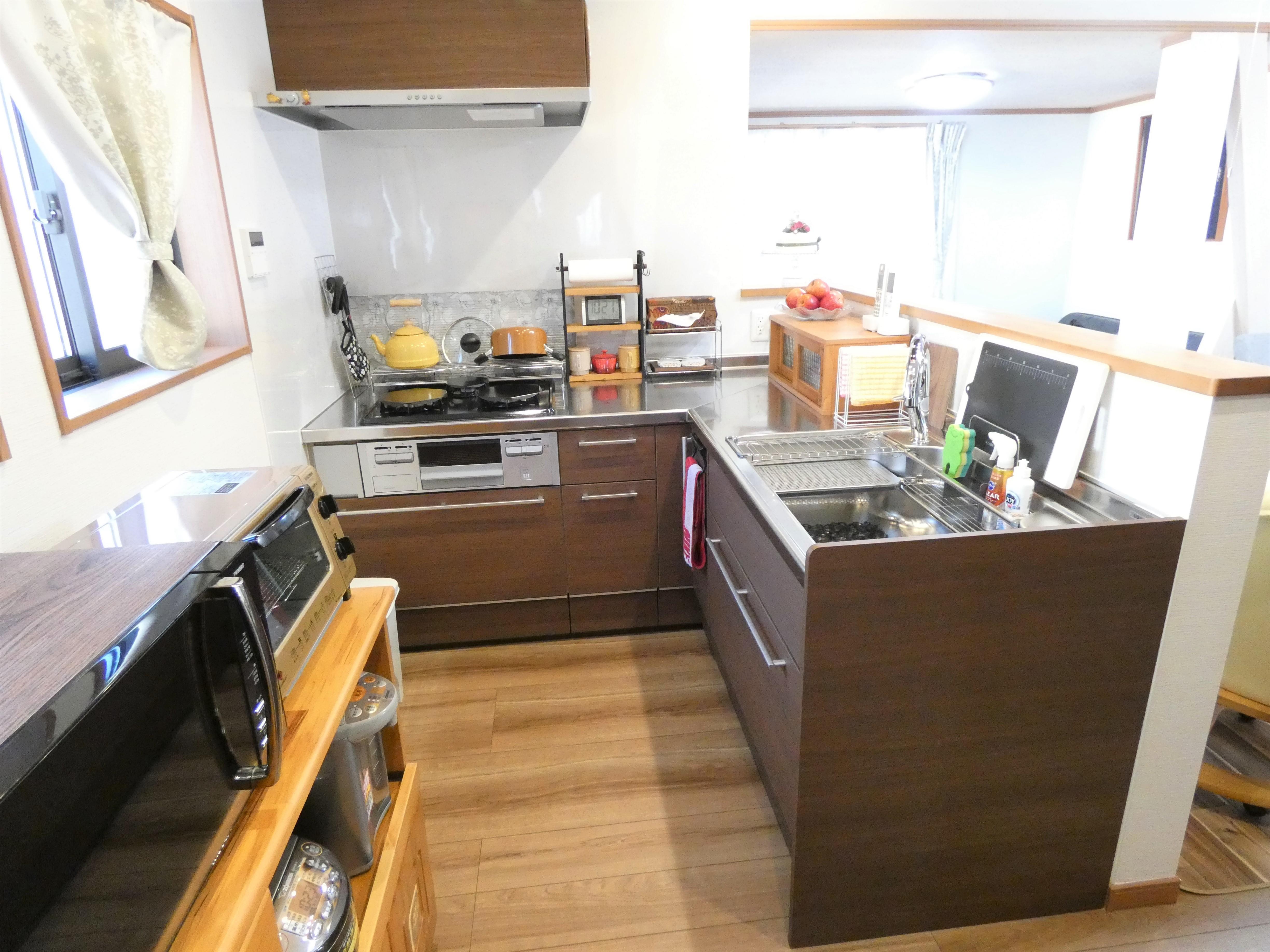 工事中、まだクロスなどの仕上げ前は壁が石膏ボードの状態で「ちょっとイメージと違う、、、」とおっしゃられていましたが、完成してからご満足いただきとても嬉しく思います。何十畳もある奥行きのある眺めと和室の奥にある緑もありとても素敵なキッチンになって良かったです。