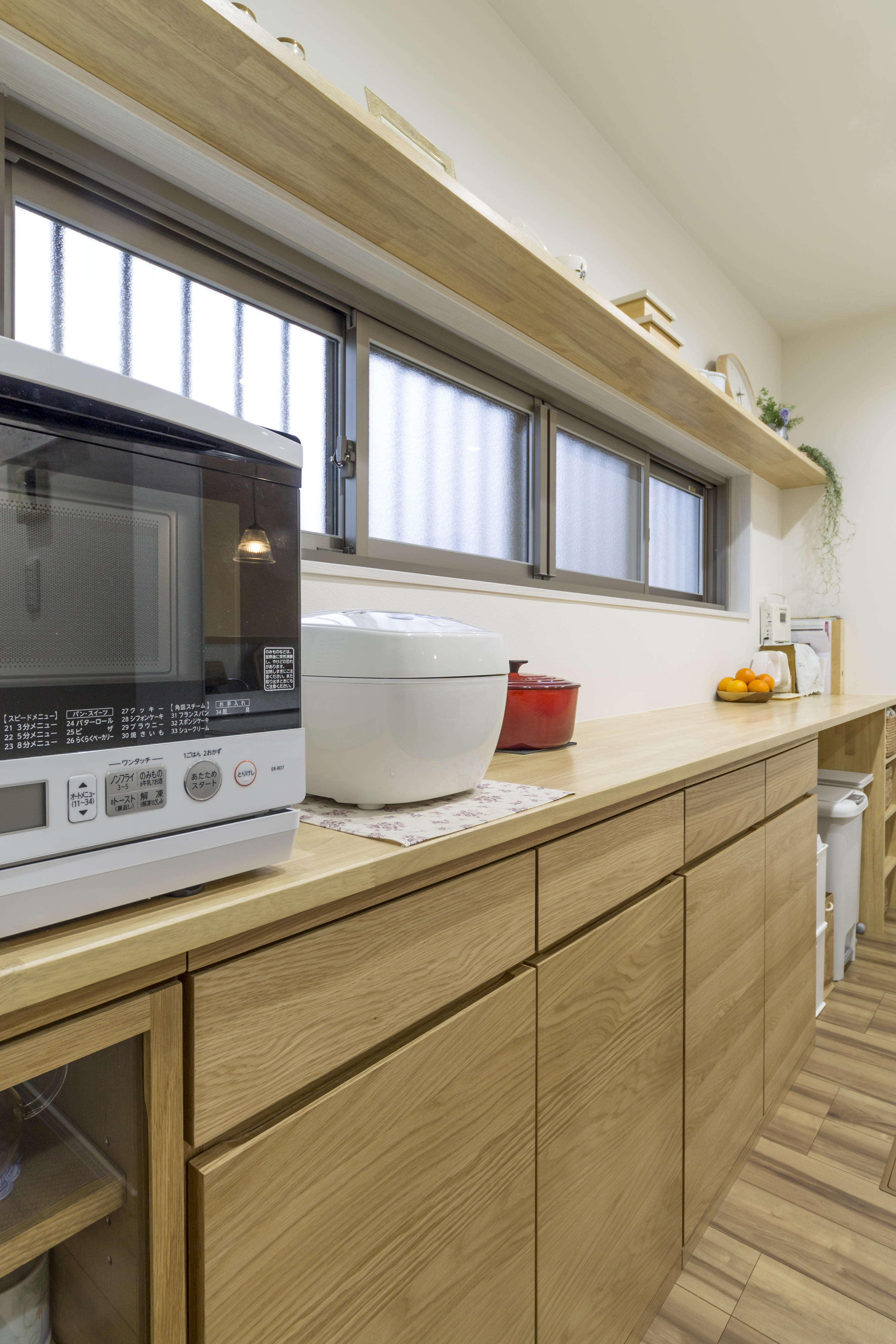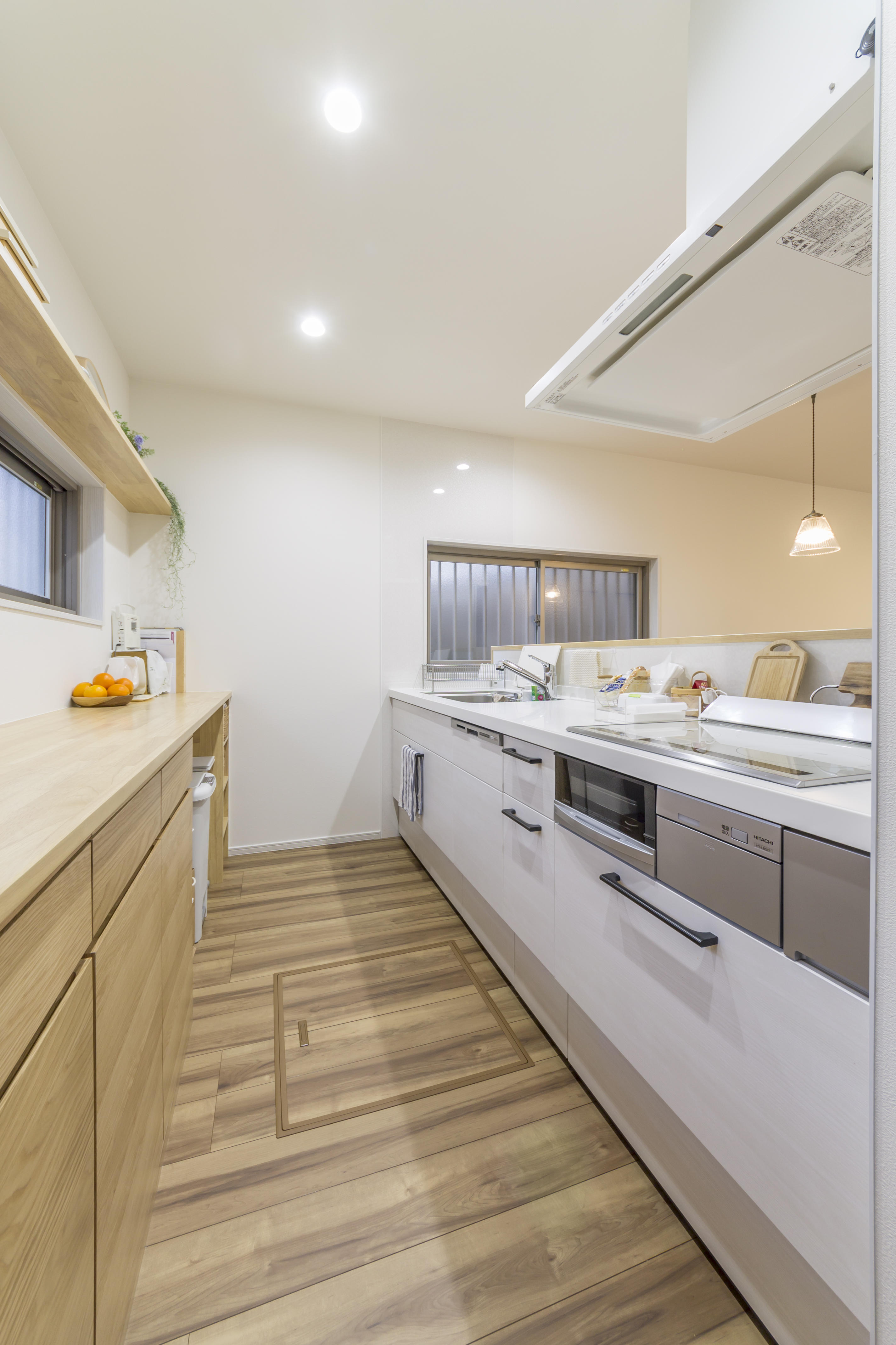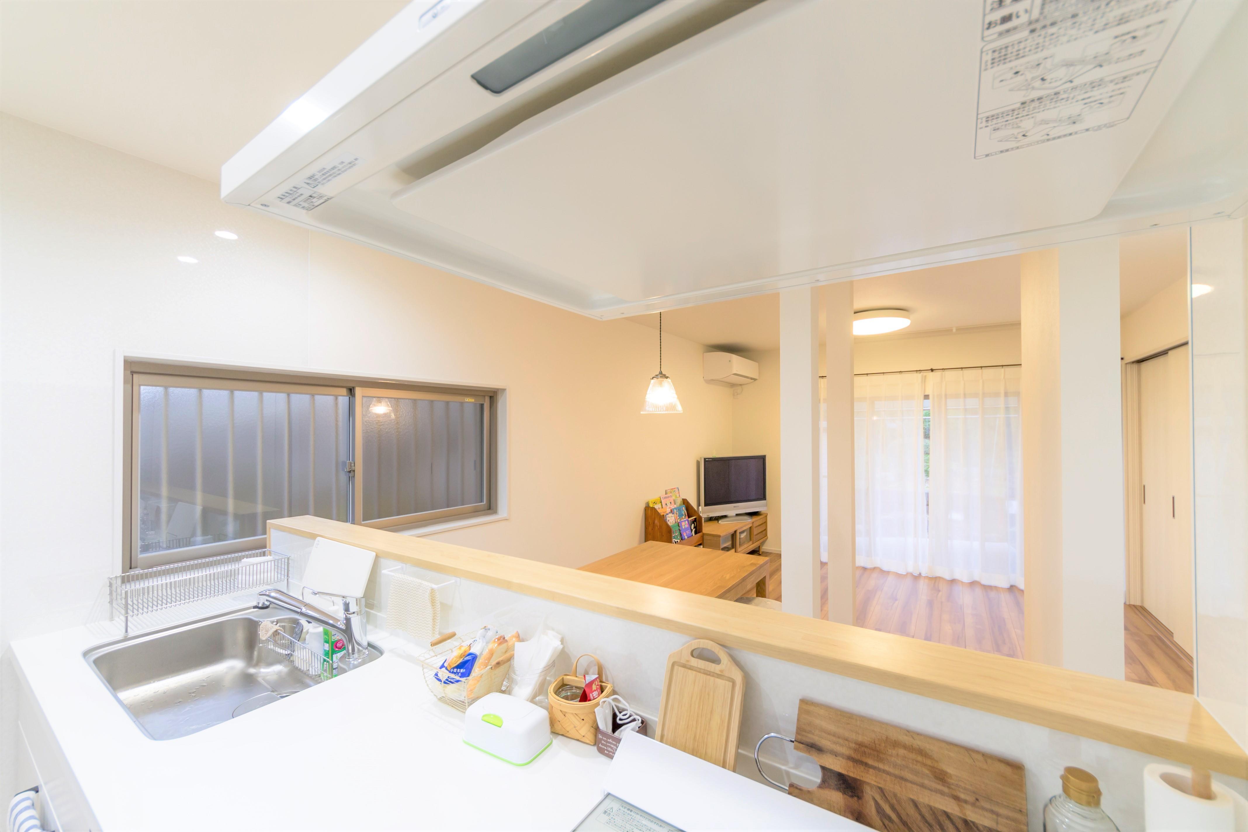 キッチンを壁向きから対面にして明るいキッチンにするために吊り戸棚は付けないでオープンにしました。