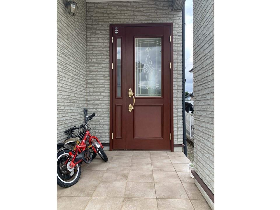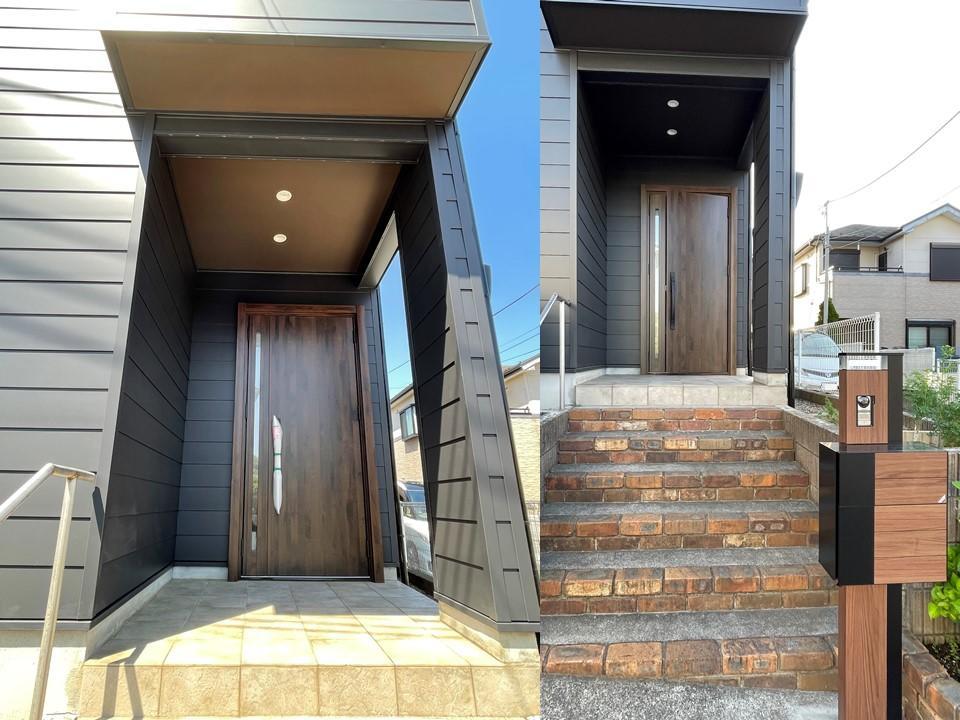 玄関も併せて木目の玄関ドアにしてまるで、お洒落モダンな新築完成です!