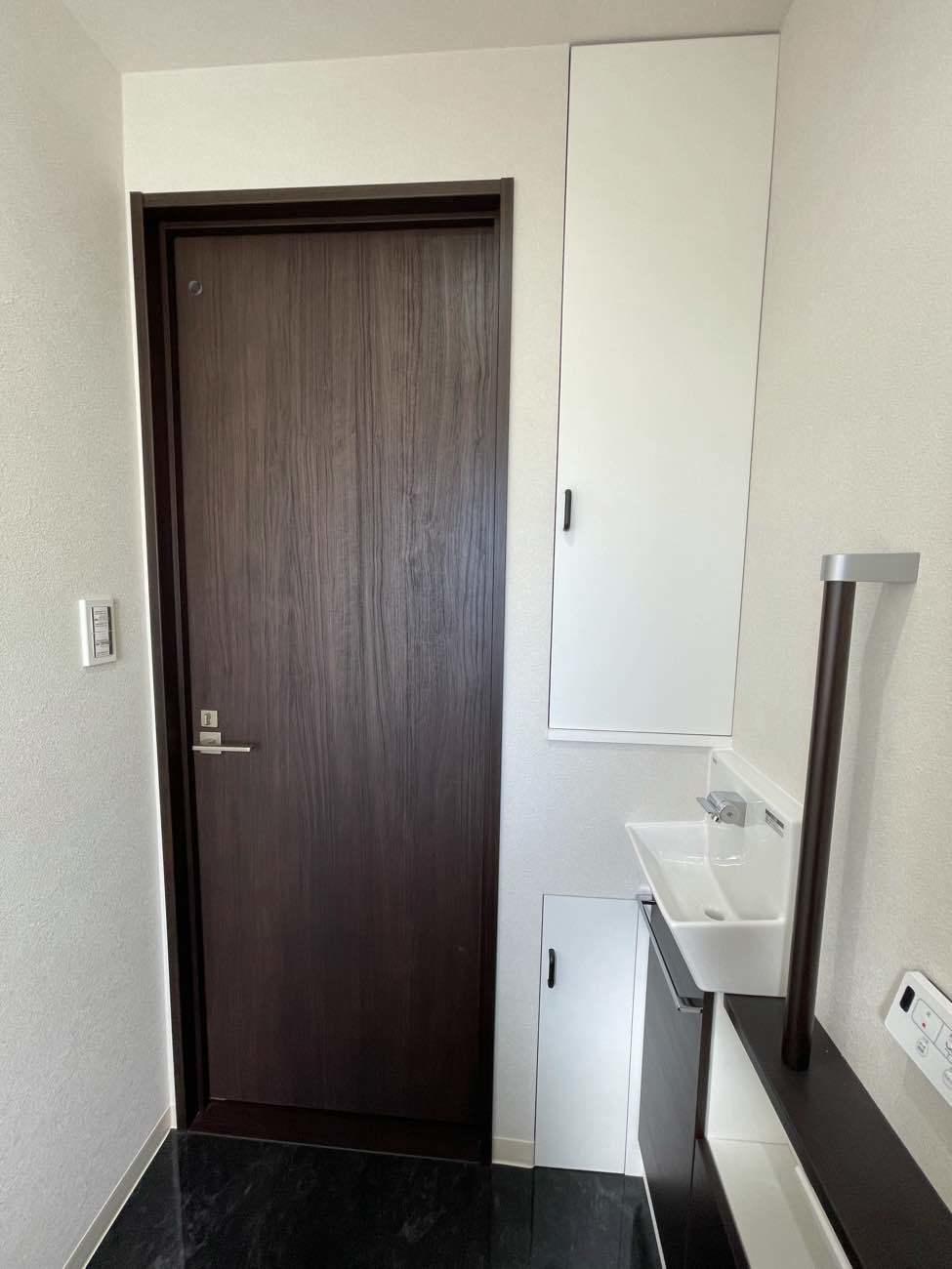 トイレのゴチャゴチャがイヤで、今度は見せない収納を多く作りスッキリトイレ空間にしたいご要望でした。