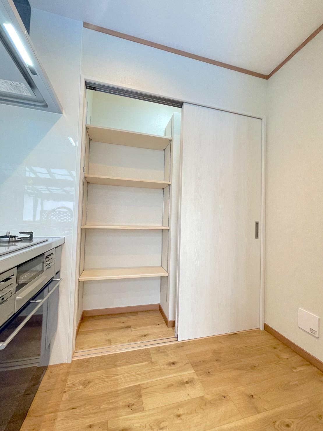 横にあるパントリーがゴチャゴチャしがちなキッチンをスッキリさせてくれます♪